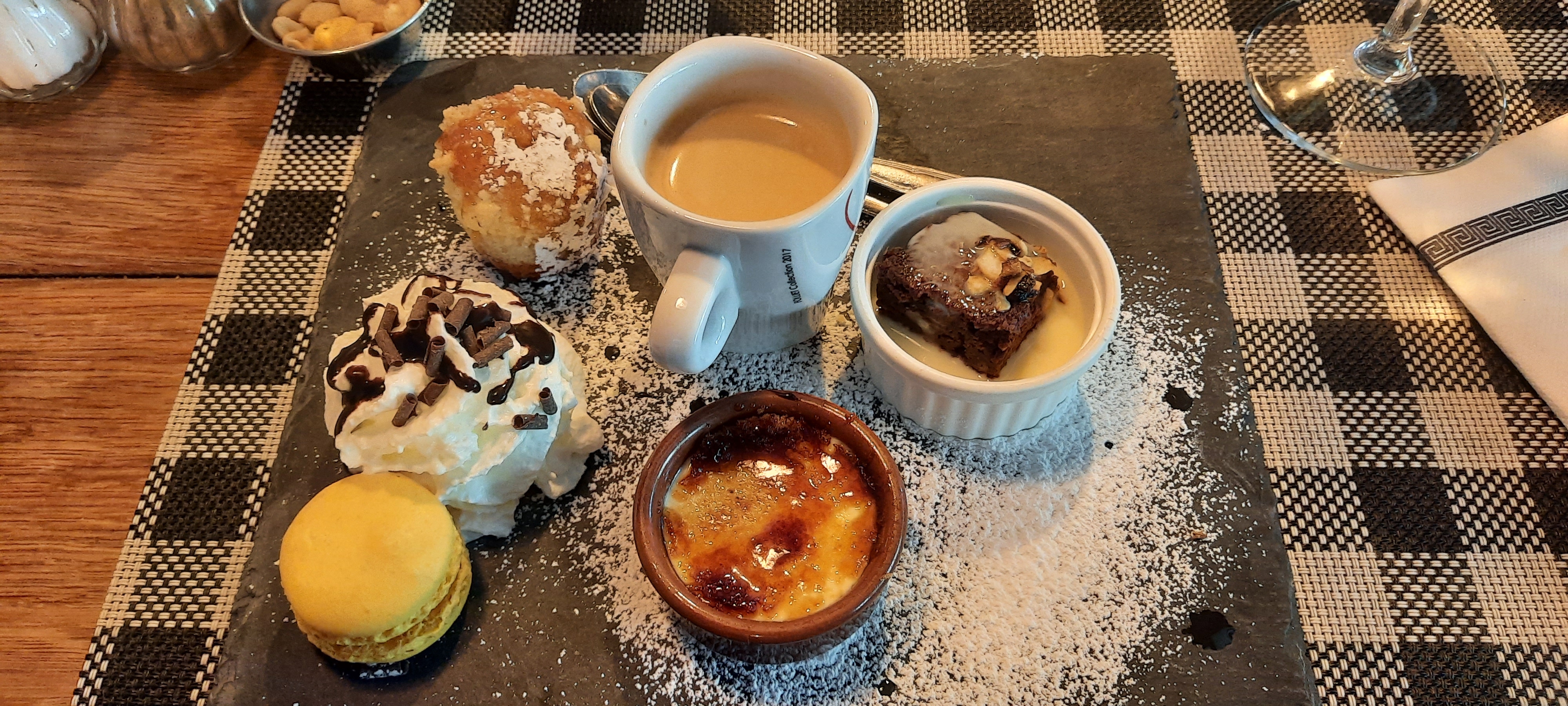 Accueil sympathique. Welsh special de la table du vieux singe, excellent . Thé gourmand, composé 1 boule vanille, mousse au chocolat, 1 beignet et 1 crème brûlée : les desserts succulents.