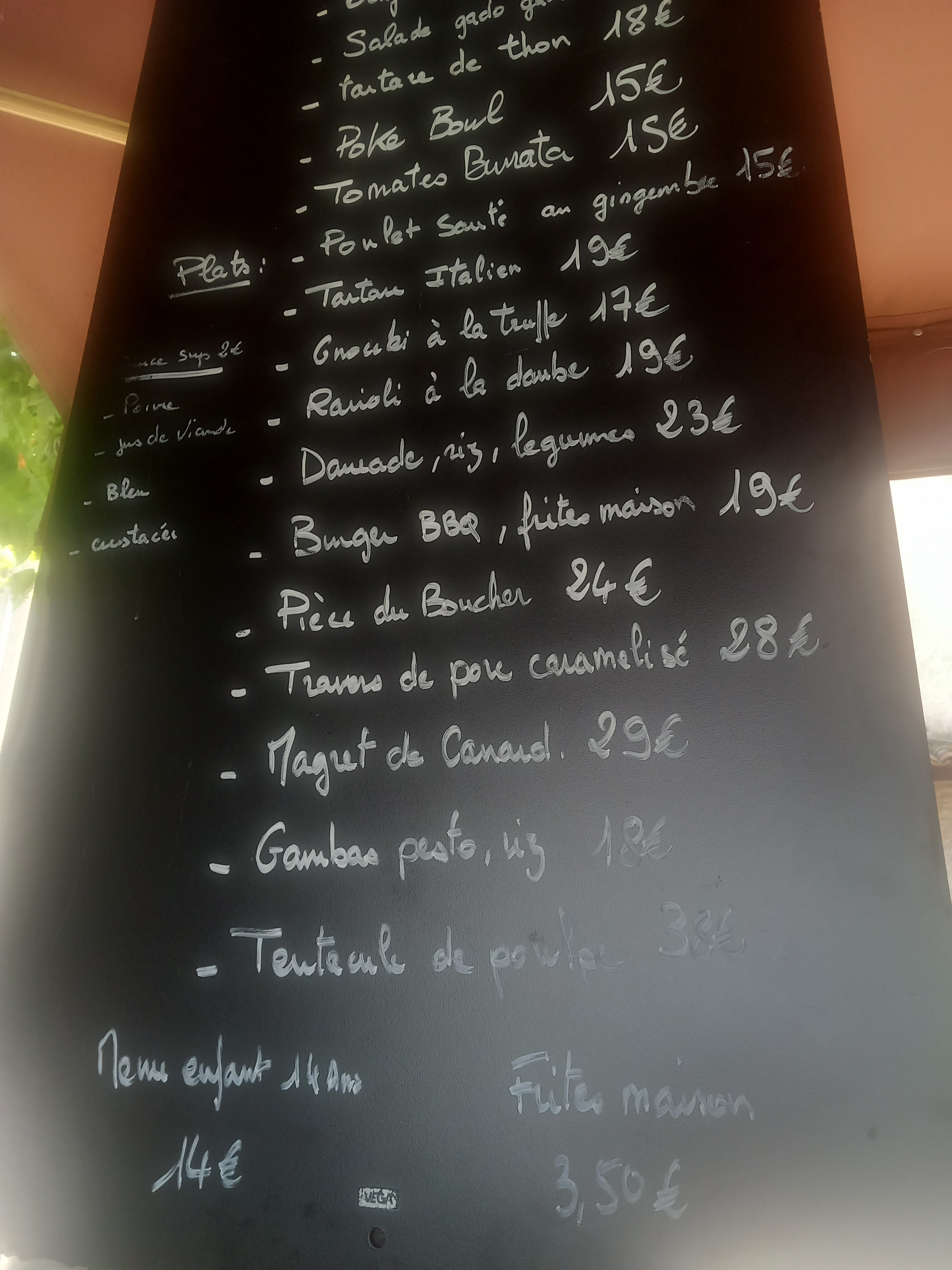 Pour un voyageur gourmand chevronné, je suis toujours à la recherche de la perle rare qui trouve un équilibre entre : le service, les prix, la nourriture et la qualité. donc dans ce cas, restaurant de village local, loin de l'agitation de la zone côtière : service : une personne répondant à tous les besoins de toutes les tables... lente avec un petit. tarification : prix costaux de la nourriture du village, beaucoup trop cher. J'ai payé 197 euros pour une bouteille de Rose la moins chère, 2 entrées et 5 plats principaux et trois desserts, 2 cafés. nourriture : les puddings étaient moyens, les plats pas terribles, j'avais du magret de canard dans une source qu'on pouvait à peine goûter et le magret de canard que j'aurais pu cuisiner de Waitrose à la maison, peu de saveur. Entrée d'escargots ; une sorte de kebab d'escargots trempés dans de la chapelure à l'ail et frits n'était pas bon. Qualité : moyenne. à part la vue raisonnable et le visage souriant, je prendrais la peine d'y aller pour la nourriture.