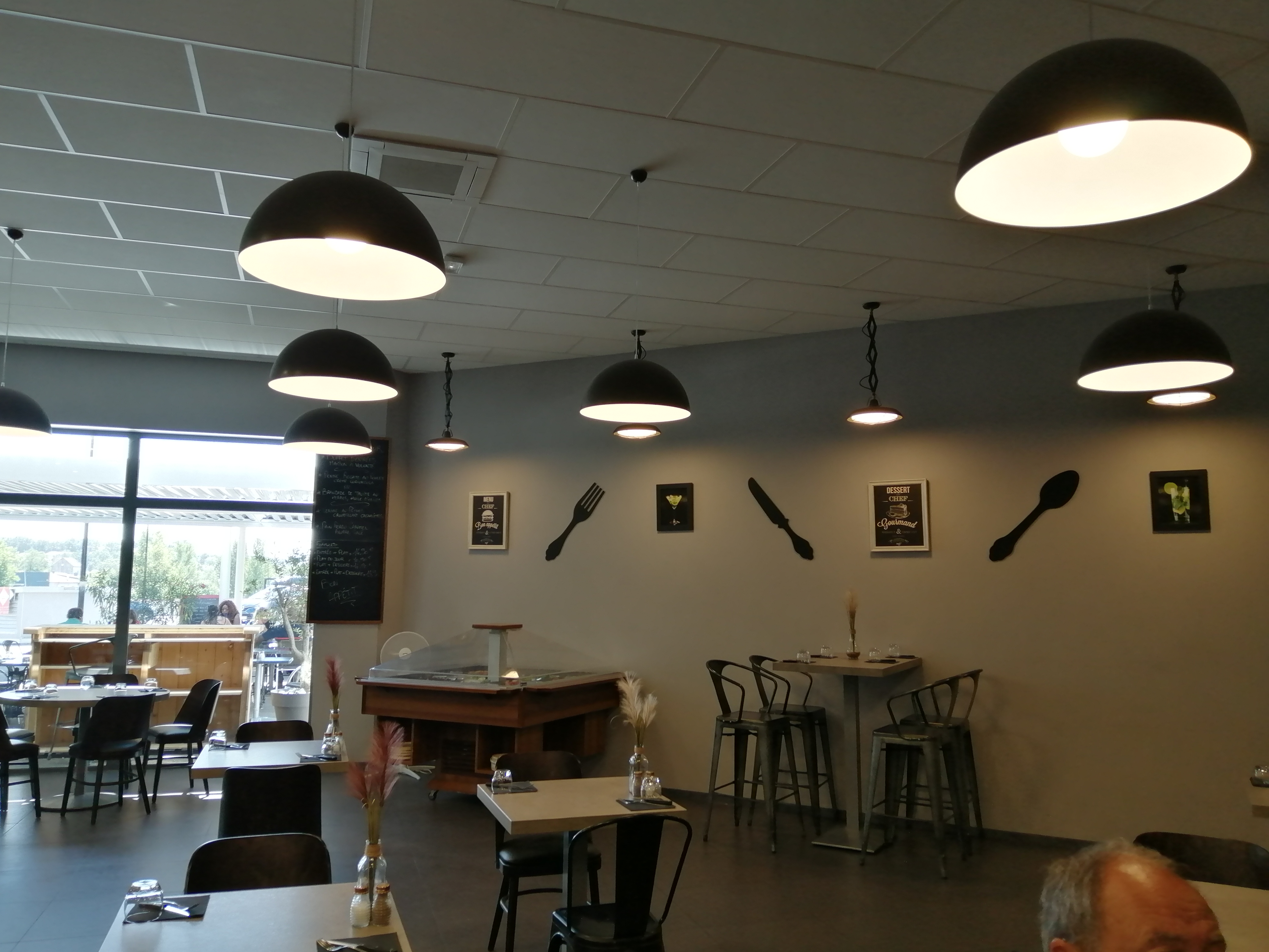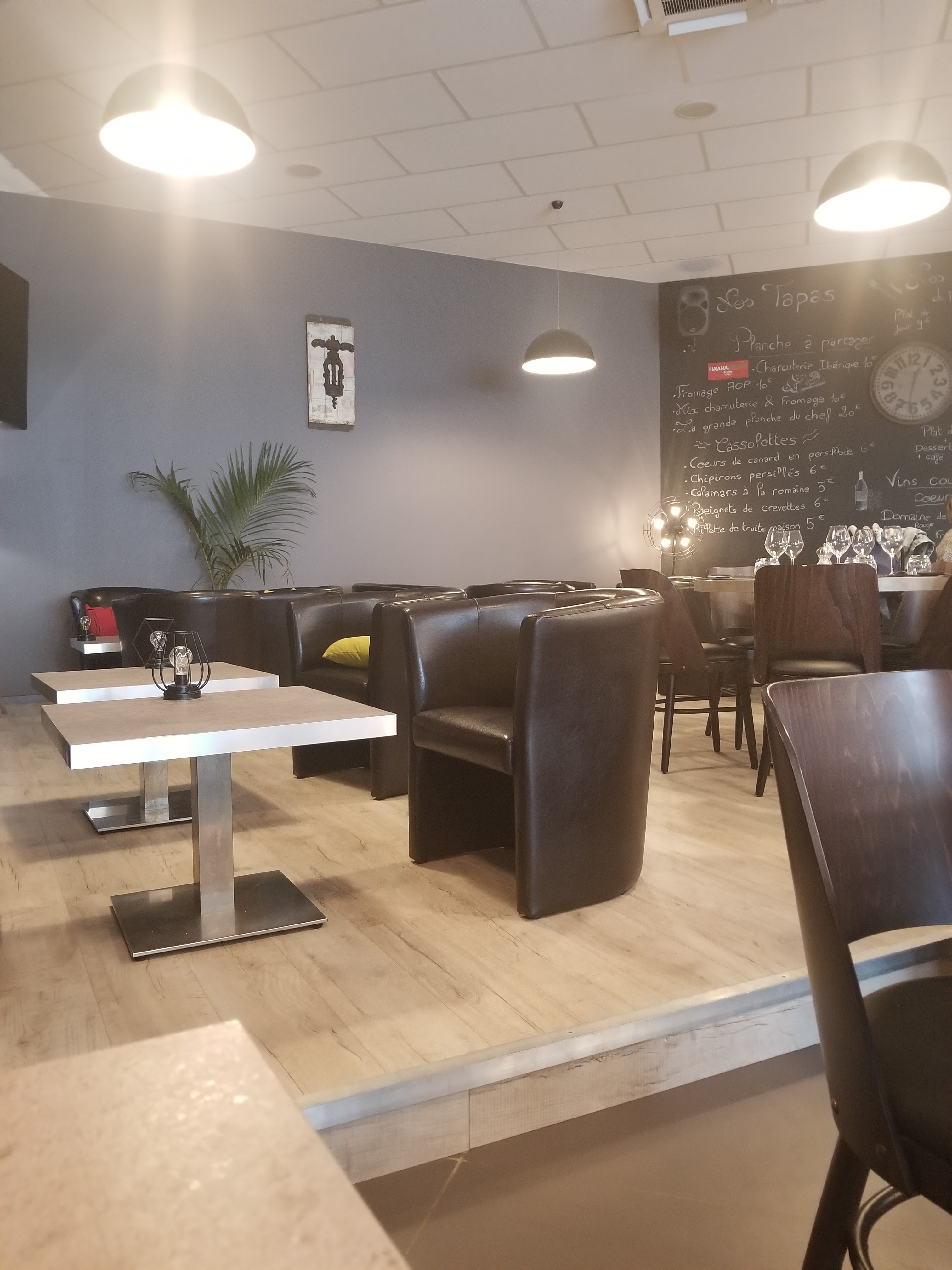 Bon l'extérieur ne paie pas de mine, ..., nous sommes simplement dans le prolongement du bâtiment d'Intermarché. Mais une fois la porte franchie le visuel est beaucoup plus agréable. La salle est grande mais bien agencée et agréable avec une décoration sympathique. L'accueil est aussi professionnel que chaleureux, les bonnes impressions se confirment avec une carte sobre mais attractive, et la proposition de cocktails individualisés. A la prise de commande les premiers doutes apparaissent car malgré une cuisine maison annoncée le premier plat à l'intitulé éloquent pose question ... Un oeuf parfait aux cèpes et foie gras ... Là on se dit son est tombé sur un restaurant gastronomique déguisé en bistrot du marché ... Mais en apprenant que les cèpes sont déshydratés c'est le rêve qui s'effondre, et les doutes s'installent. Le choix se dirige vers des chipirons persillade, mais en découvrant qu'ils sont aussi proposés en plat avec de la ventreche (20€) l'idée germe. Bien sûr il faut oublier le choix potentiel de la souris d'agneau au romarin (29€), de la grillade de boeuf, ... Pour les enfants il est proposé steack haché, nuggets ou hamburger frites. Avec de très bonnes frites maison et un steack haché frais les enfants sont ravis, si ce n'est que l'on ne leur a pas demandé le point de cuisson (seule et unique petite critique pour tout le service ; mais cet oubli devient une habitude, la majorité des serveurs pensant que tous les enfants mangent leur viande hachée bien cuite). Au service des chipirons nos regards se croisent à table ..., l'odeur de persillade est TRÈS puissante et l'allure aplatie et rosatre des chipirons interpelle ... Difficile de croire à une assiette de chipirons frais, ..., on se trouve plus vraisemblablement face un produit saumuré ou équivalent. Bon la purée de patates douces est excellente, mais les pommes de terre grenaille ne sont ni des grenailles ni délicieuses (cuisson vapeur/bouillie probablement), mais le plus désolant sont ces chipirons dont la saveur est en adéquation avec l'aspect, mais qui sont de toute façon écrasés par un volume de persillade disproportionné ! On mange de l'ail au chipirons, et on en mange une heure et demie plus tard ... Les doutes s'accumulent donc au fil du repas et l'on se dit qu'il sera judicieux de revenir un midi pour profiter de la formule avec buffet et de plats du jour avec des produits très frais. Donc une grosse déception culinaire mais un accueil exceptionnel ce qui m'incite à donner 4 étoiles dans l'attente d'une nouvelle visite.