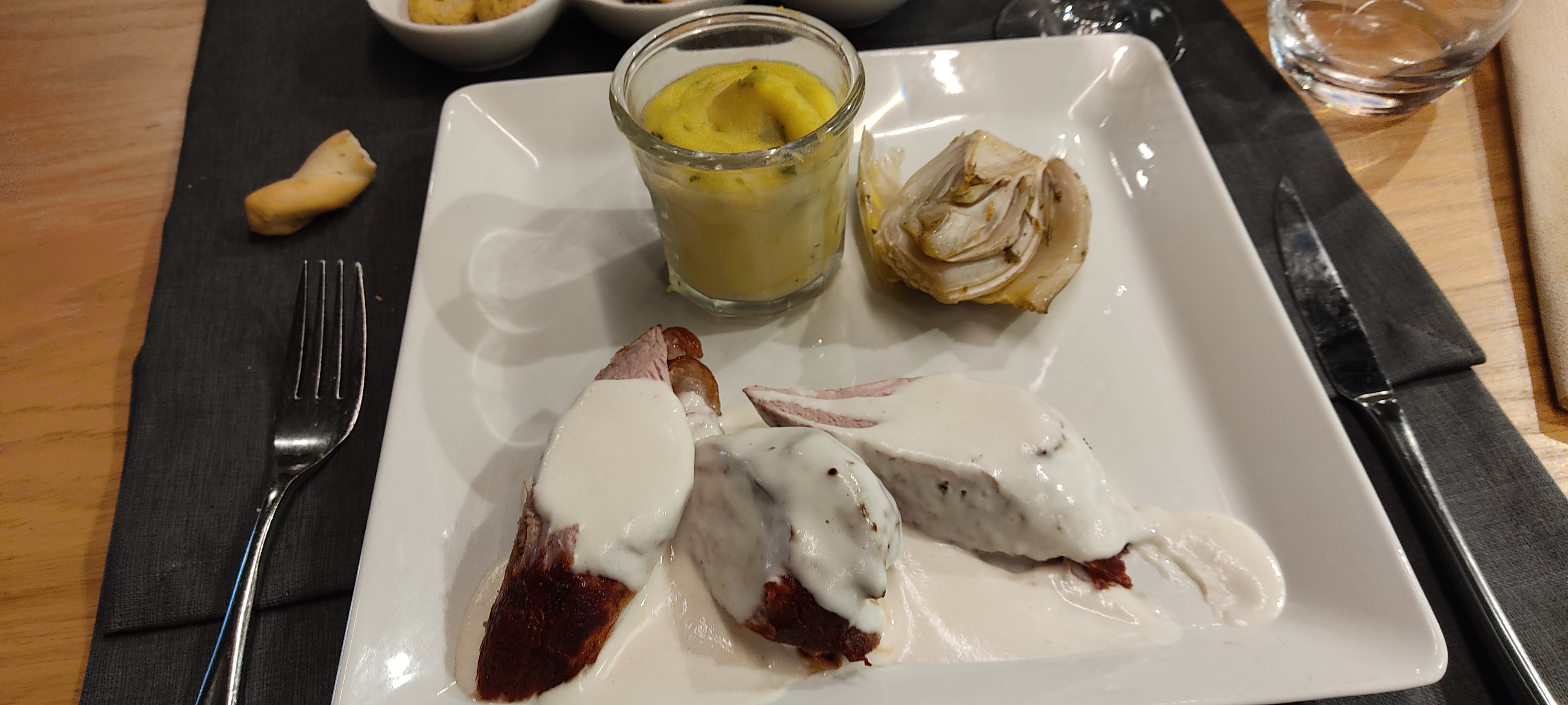 Ma femme à pris un cordon bleu , la viande étais gorgé d'eau et bien trop cuite et moi j'ai pris un risotto qui étais moyennement bon mais je suis capable de faire mieux donc déçu ... 63 euros à 2 sans entrées sans desserts juste 1 verre de vin chacun ...