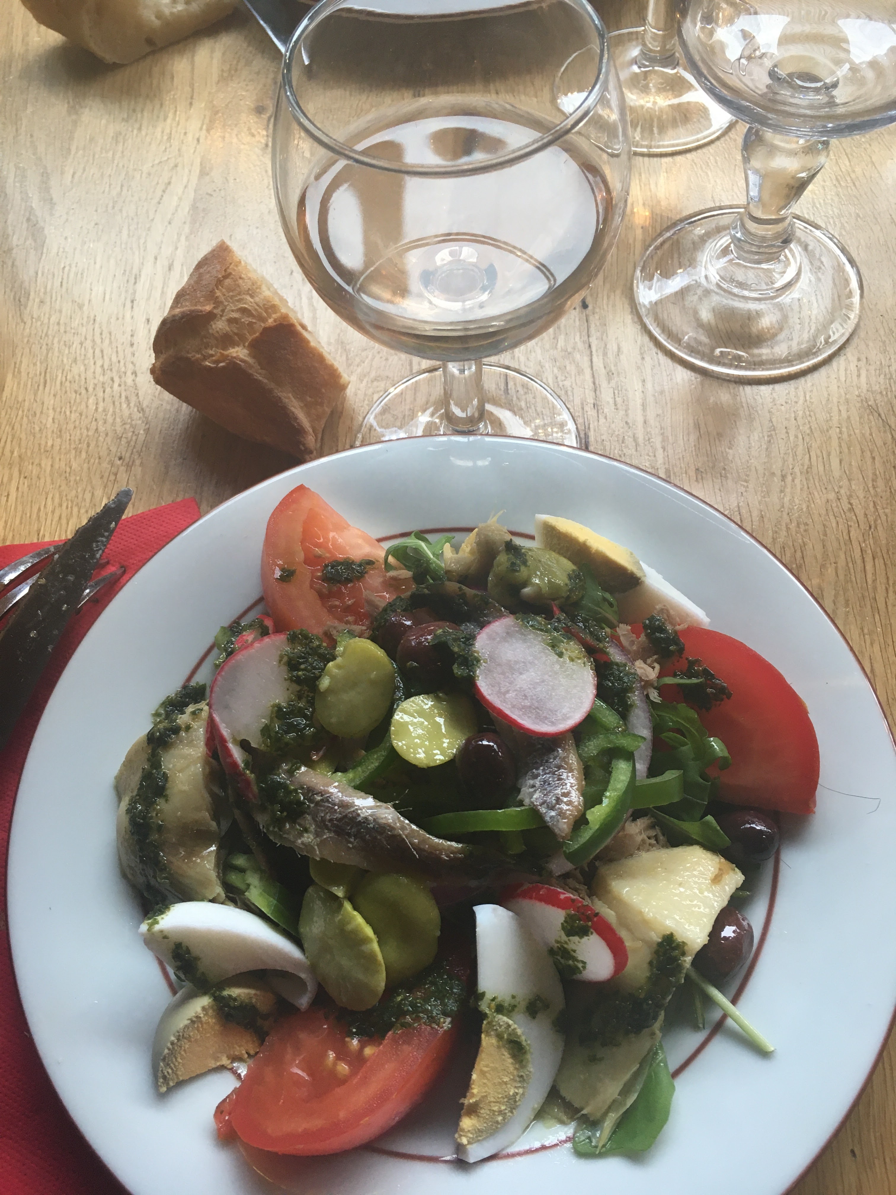 Salade niçoise delicieuse servie avec le sourire. Agréable déjeuner au soleil. Je recommande sans hésiter :)
