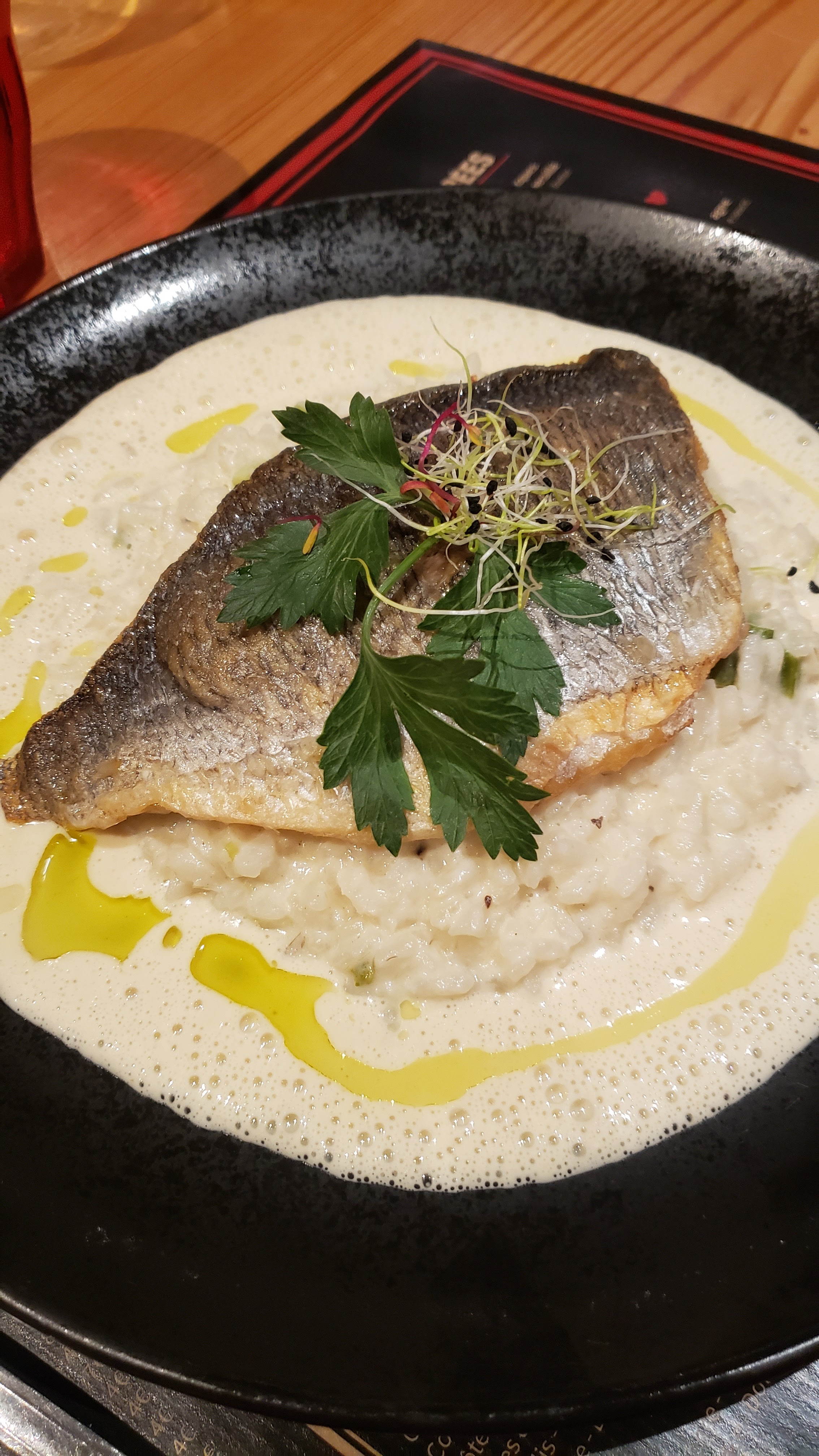 Une ambiance très conviviale et réchauffante, ainsi que des plats marins très esthétiques et gustatifs tel que le filet de dorade et son risotto aux asperges. Je vous conseille fortement !