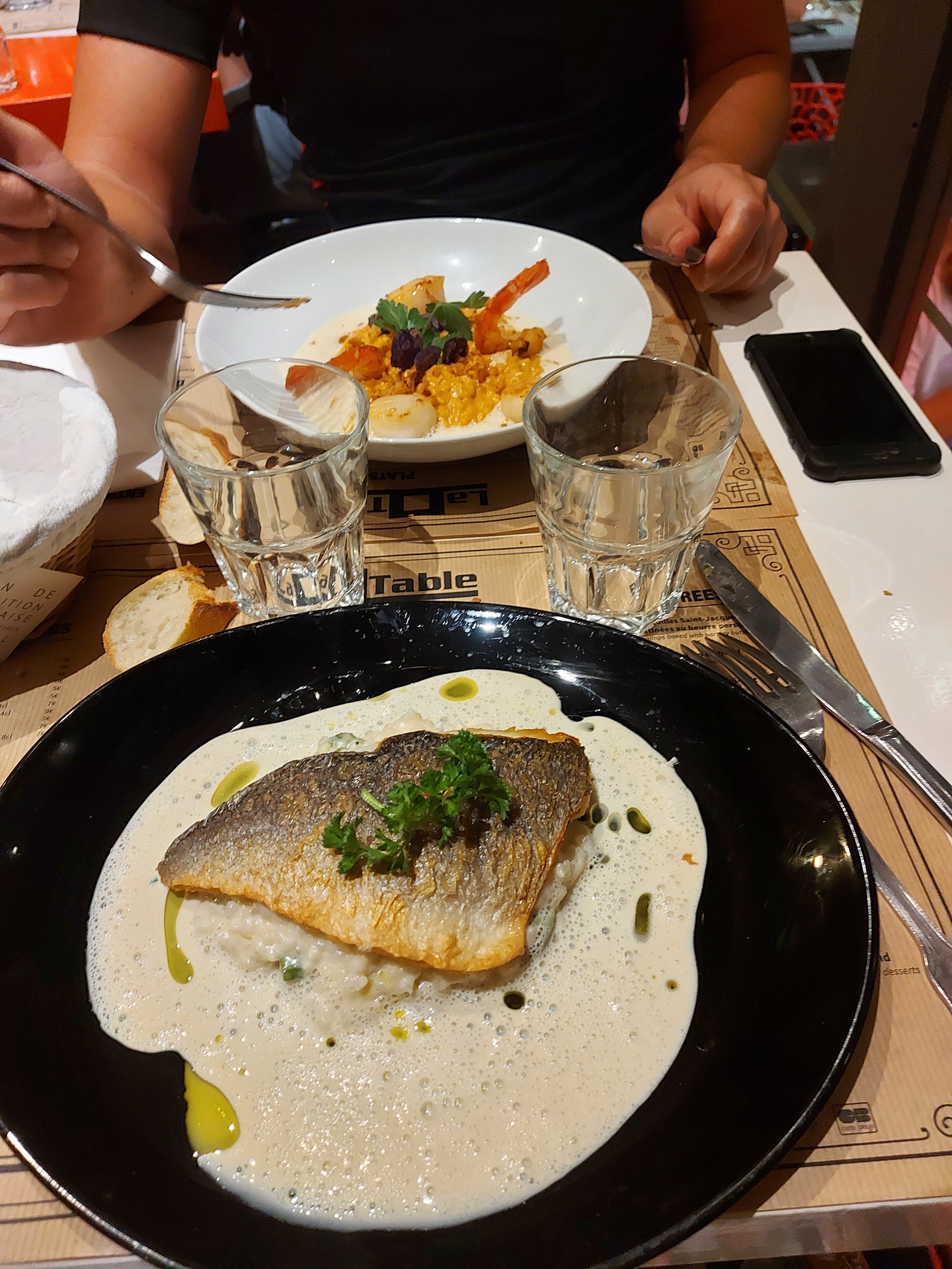 Très très bon risotto crevette avec St Jacques un délice. Et une excellente dorade royale risotto asperges.