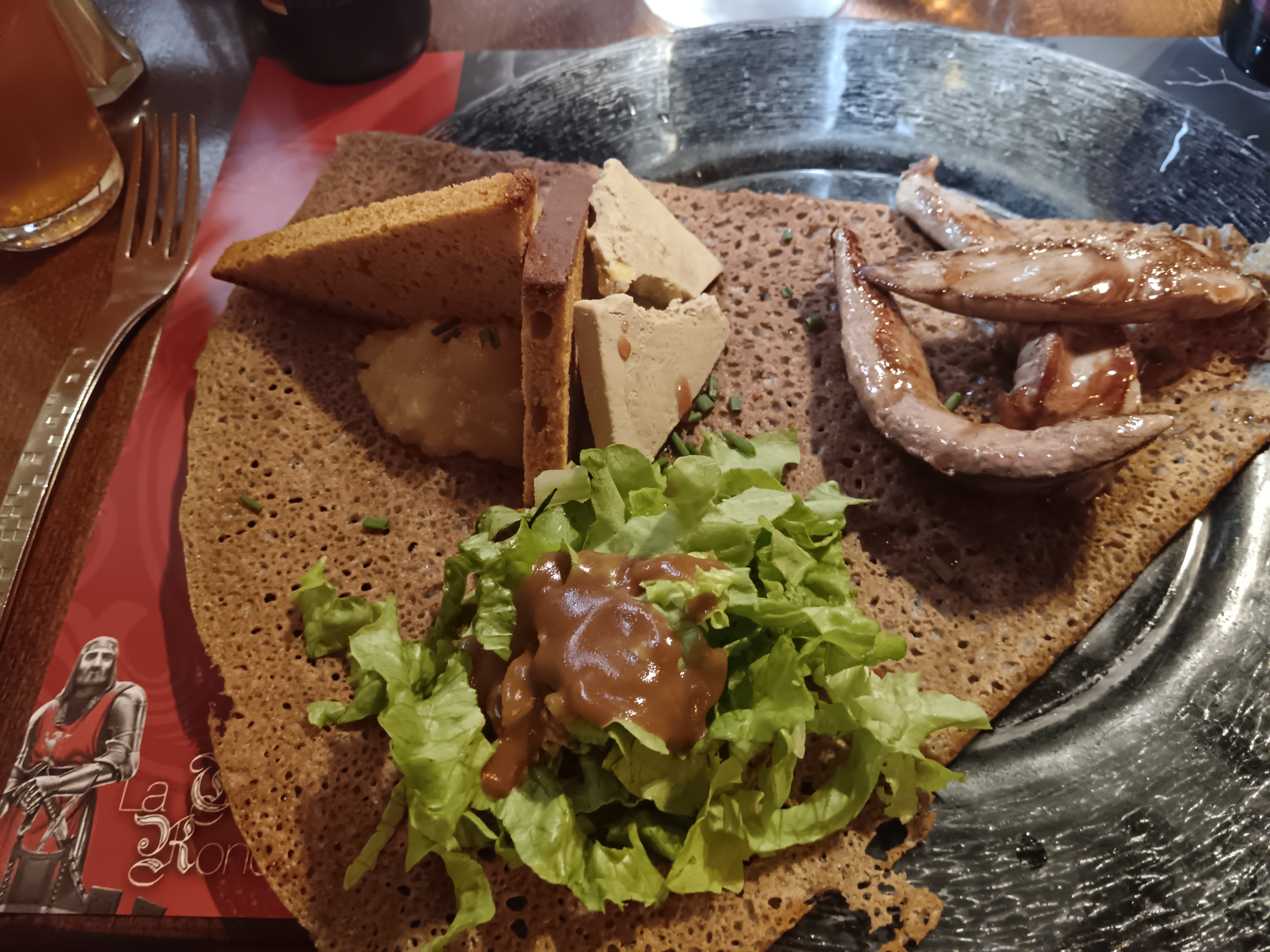 Franchement très belle surprise. De l'extérieur on a l'impression qu'on peut être très étroits et au finale quand on y entre on voit un bel espace thématique médiévale que personnellement j'apprécie. J'attendais qu'ils servent que des galettes et des crêpes et au finale il y a des grillades qui font avec un feu de bois très beau et pas mal de variété. La galette était très bonne, hâte de pouvoir y aller en amoureux car ça a l'air très sympa pour ça aussi