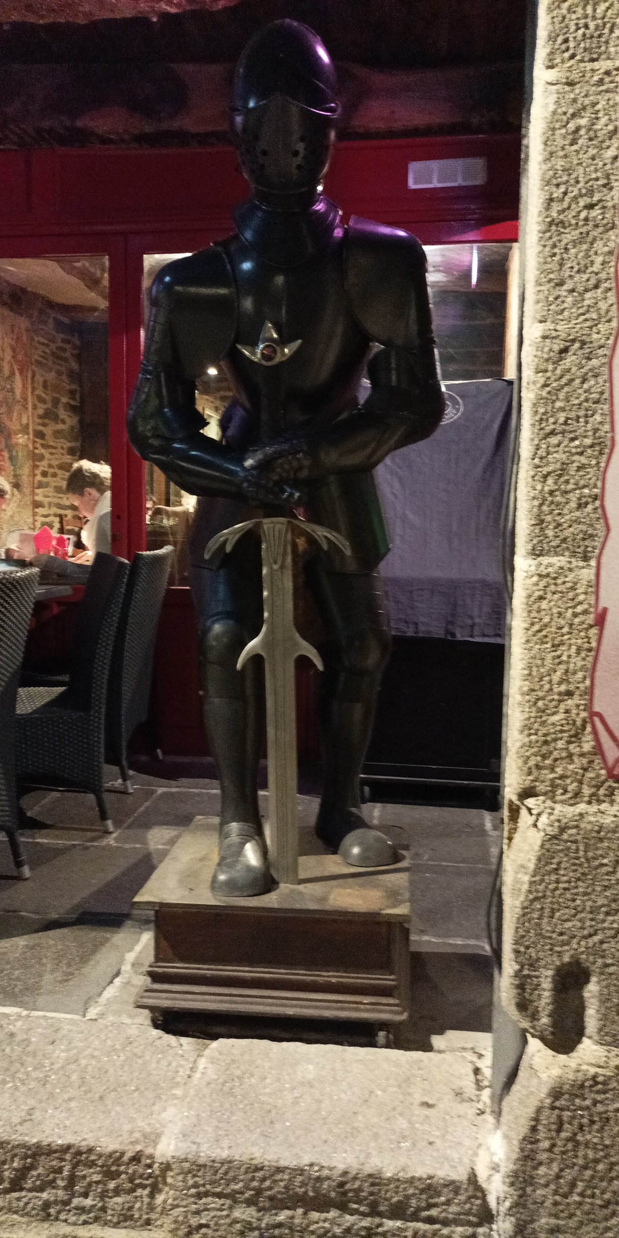 Très bel endroit à la découverte des chevaliers de la table ronde mais crêperie de repli car celle dans la ruelle était fermée !! Galette bravo pour la présentation mais faite un effort sur la qualité de celle-ci, décevant toute sèche. Très contente que les patrons soient en congés car n'avons pas eu à supporter leur froideur !! À part le serveur aimable les serveuses un petit 😊 ne serait pas de refus c'est gratuit.