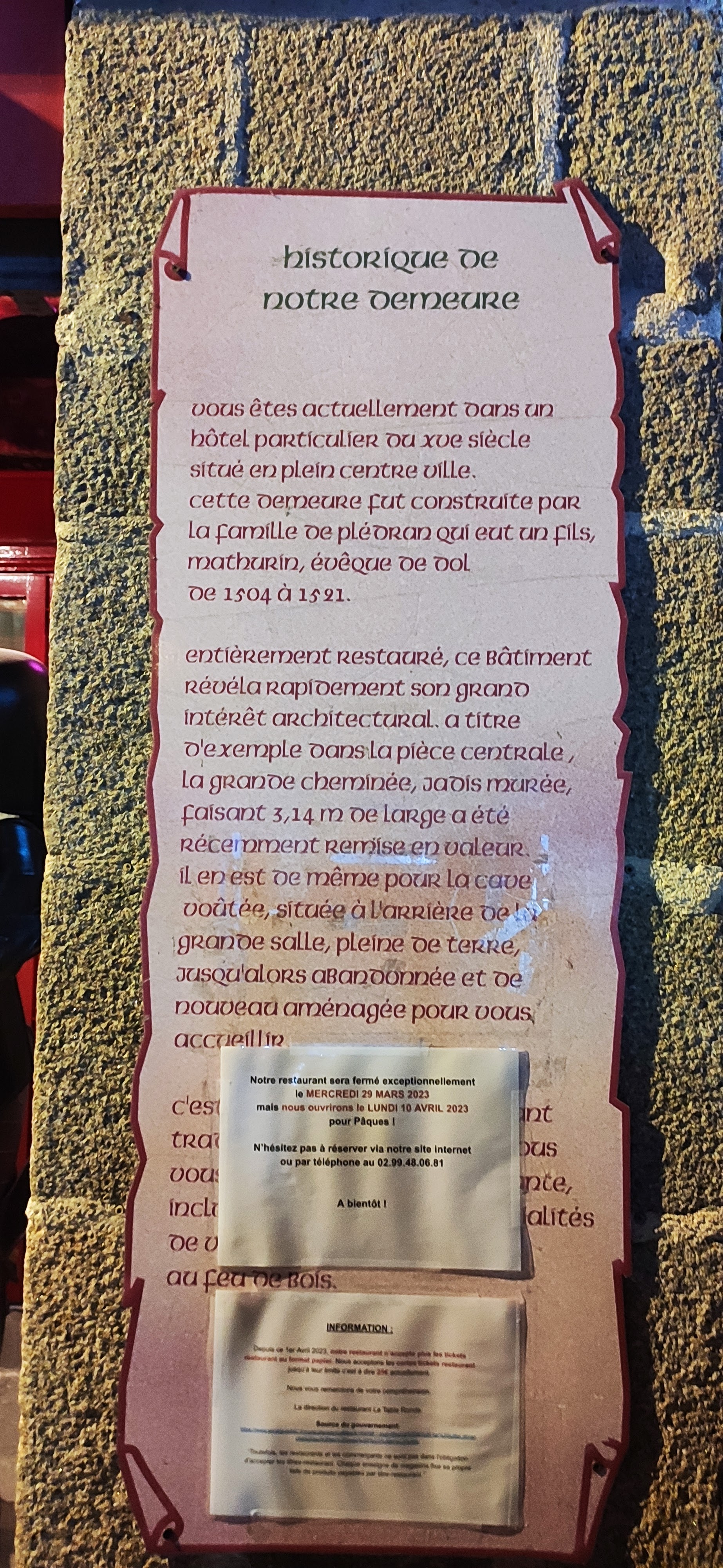 Lieu atypique que cette demeure du 15ème siècle devenu un restaurant au sein de la ville de Dol de Bretagne. La cuisson des viandes est faite dans la cheminée d'époque. Un endroit charmant, réservation conseillée !!!
