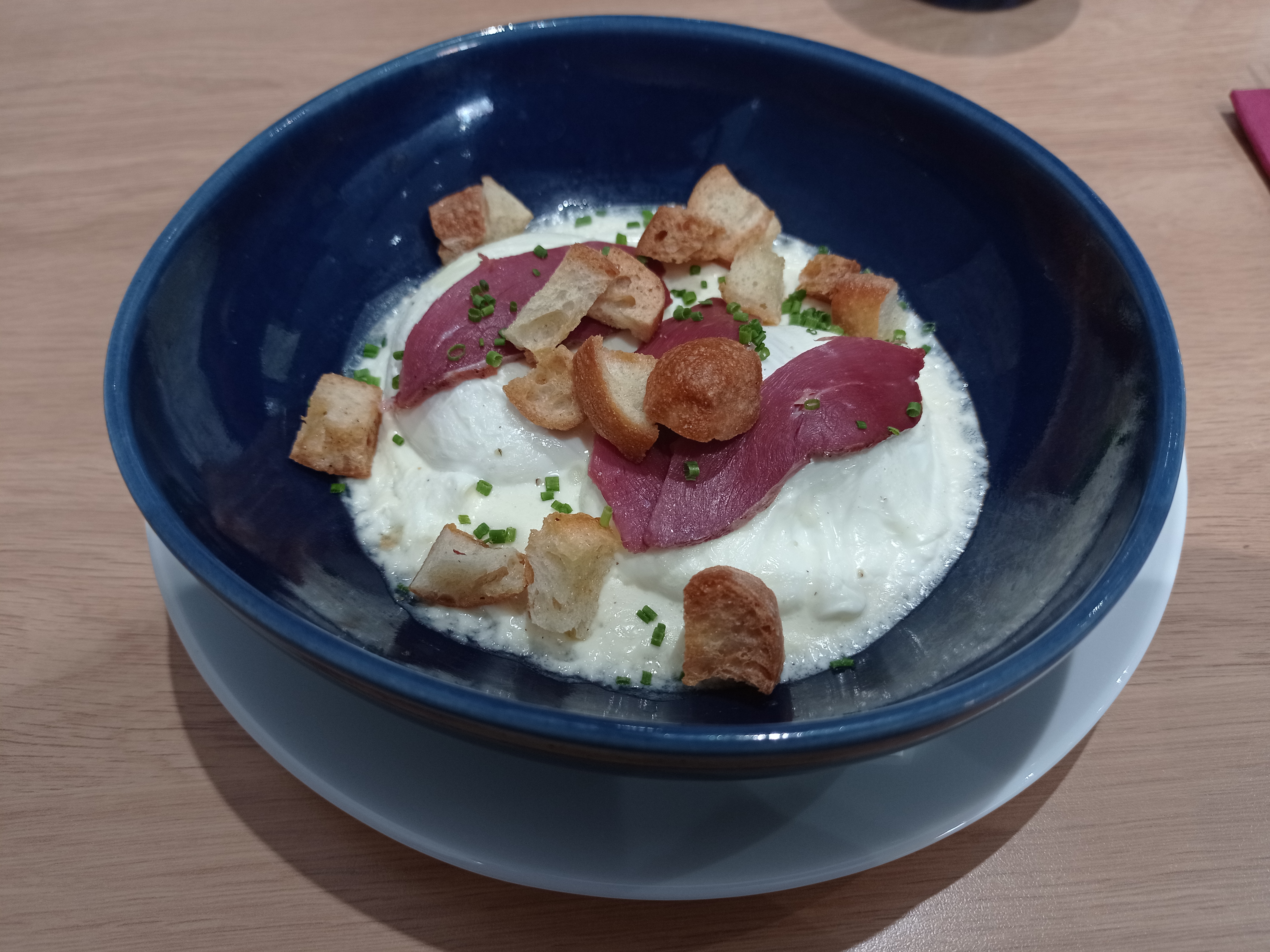 J'ai hésité sur deux entrée... j'ai pris les deux mais pas de dessert - L'œuf cocotte a la crème magret fumé et parmesan : très bonne entrée mais l'oeuf légèrement trop cuit,. Je trouve que la présentation est à revoir. - Terrine de lapin au muscadet : Top la terrine je recommande. - Parmentier de canard et salade : Très bon parmentier et généreux en viande viande bonne qualité Visite : le lundi 29 avril : servi par un jeune serveur ympa, c'était son 1er jour j'espère un peu maladroit mais ça c'est normal quand on débute j'espère pour lui que ça va le faire (bon courage à lui 😊)