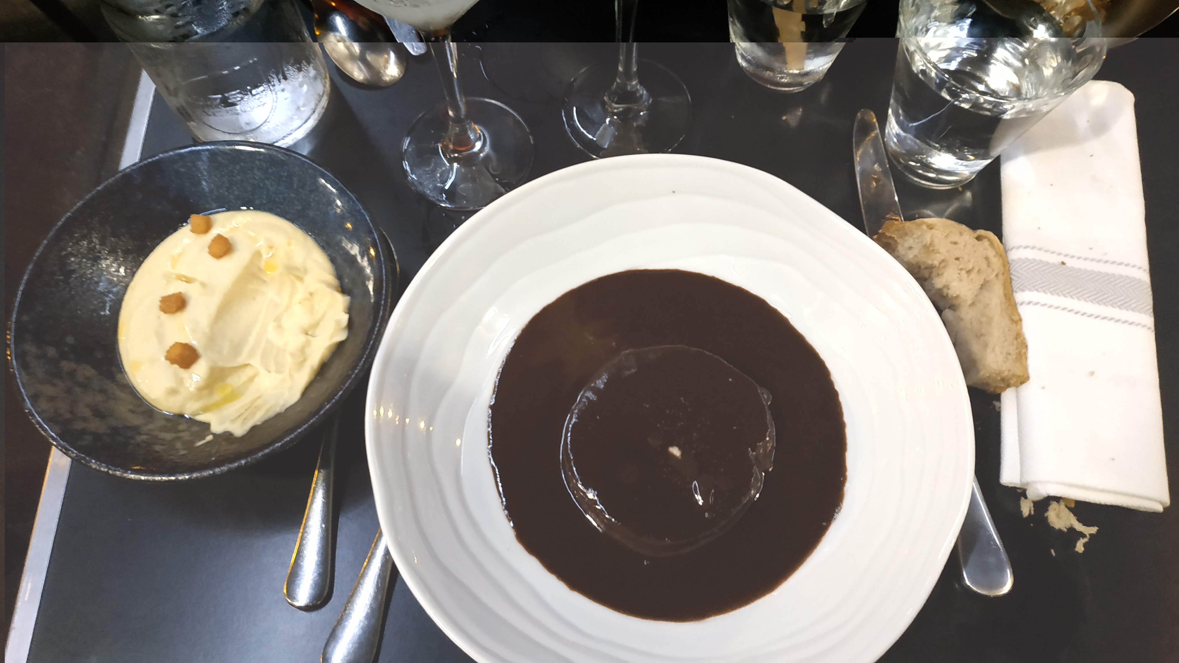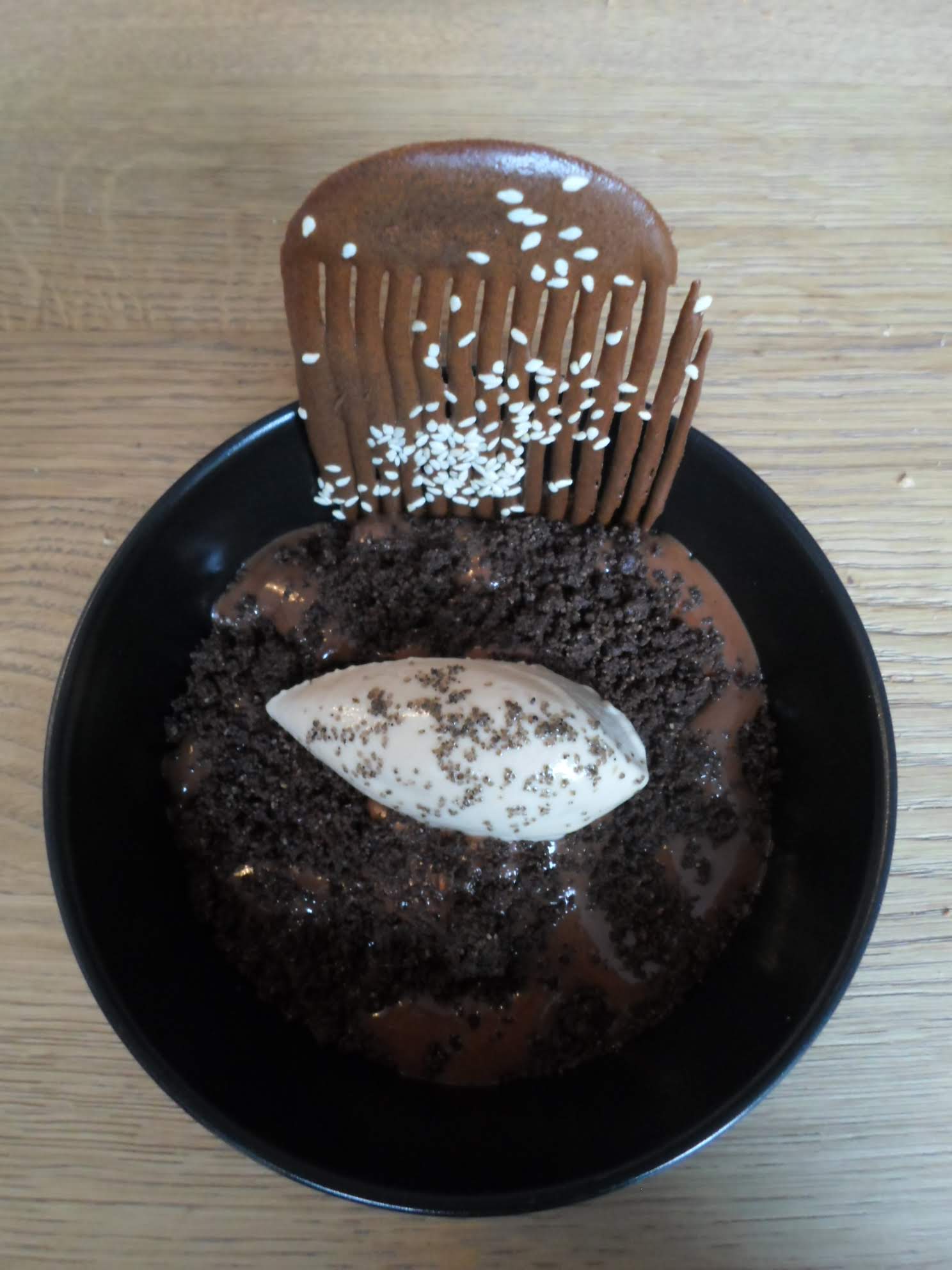 Les plats étaient savoureux au possible, mention spéciale pour les sauces et jus, particulièrement délicieux (la sauce sésame noir qui accompagnait les St Jacques...). Et j'ai enfin pu déguster un soufflé au chocolat ! Que j'ai beaucoup aimé, bien entendu. La salle est jolie, la vue sur la cuisine aussi. Effectivement, c'est assez petit donc on est, disons, intimes avec nos voisins. J'ai par contre été un peu gênée par un de nos serveurs sympathique mais visiblement stressé, au point de littéralement trépigner en prenant notre commande, regardant sa montre (promis, on a pas pris particulièrement notre temps pourtant) et qui courrait presque entre les tables, balançant les menus dans leur meuble de rangement (menus fixés sur une plaque dure, balancées dans un meuble en bois, je vous laisse imaginer le bruit). Il a par la suite retrouvé son calme mais... Bref, rien de grave, mais voilà. Les autres serveurs étaient parfait, et lui même une fois calmé a été très agréable. Une bonne table a tester (la prochaine fois, je veux absolument découvrir l'échine de cochon !