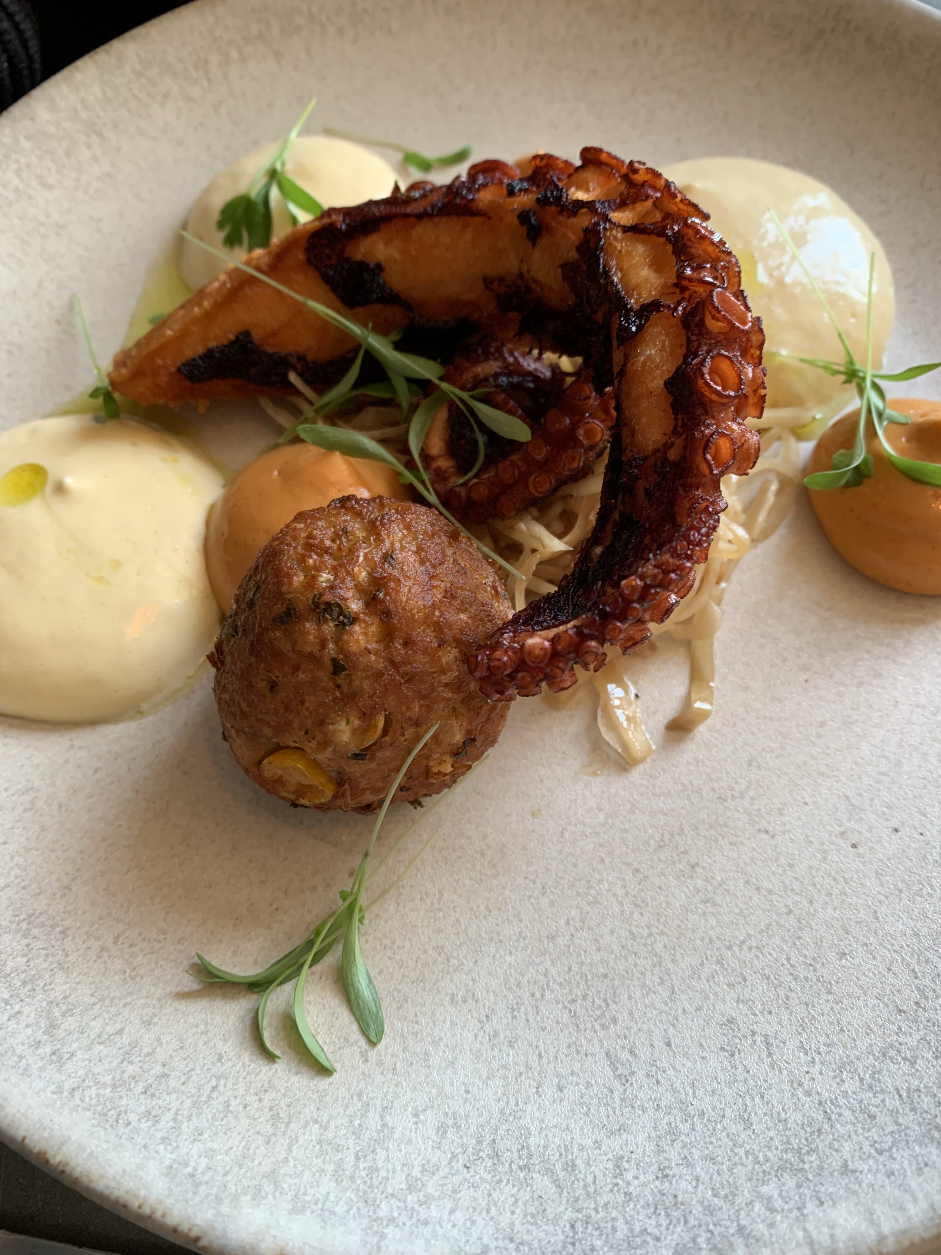 Bon repas, belle présentation. Presque trop copieux. On s'est régalés. Juste un tout petit bémol pour mon goût sur la cuisson du poulpe.. Cela dit, c'était délicieux