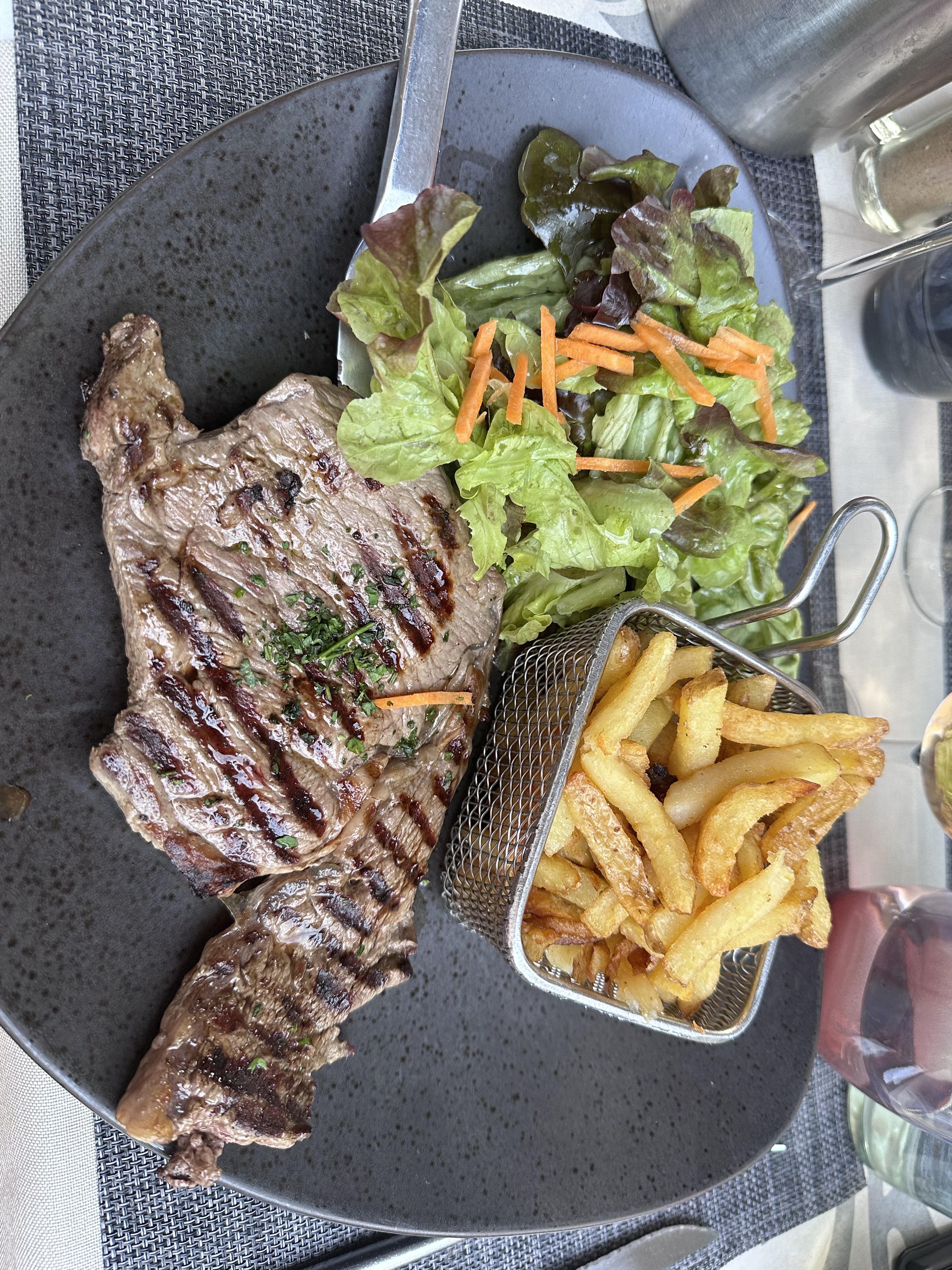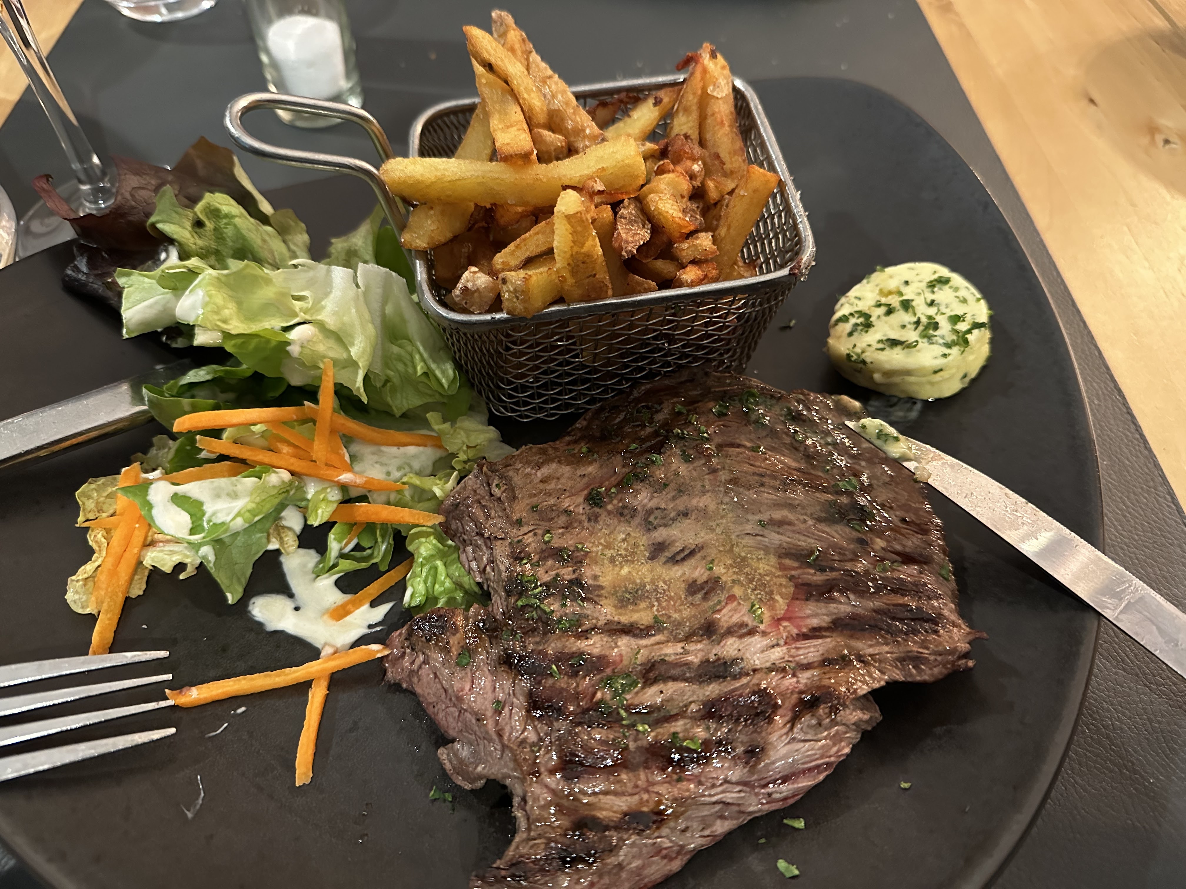 Déçue...brochette de boeuf a 28 euros avec de la mayonnaise amora... Côté de boeuf a 33 euros mais la sauce est en supplément .... Les frites et le gâteau au chocolat sont bons...
