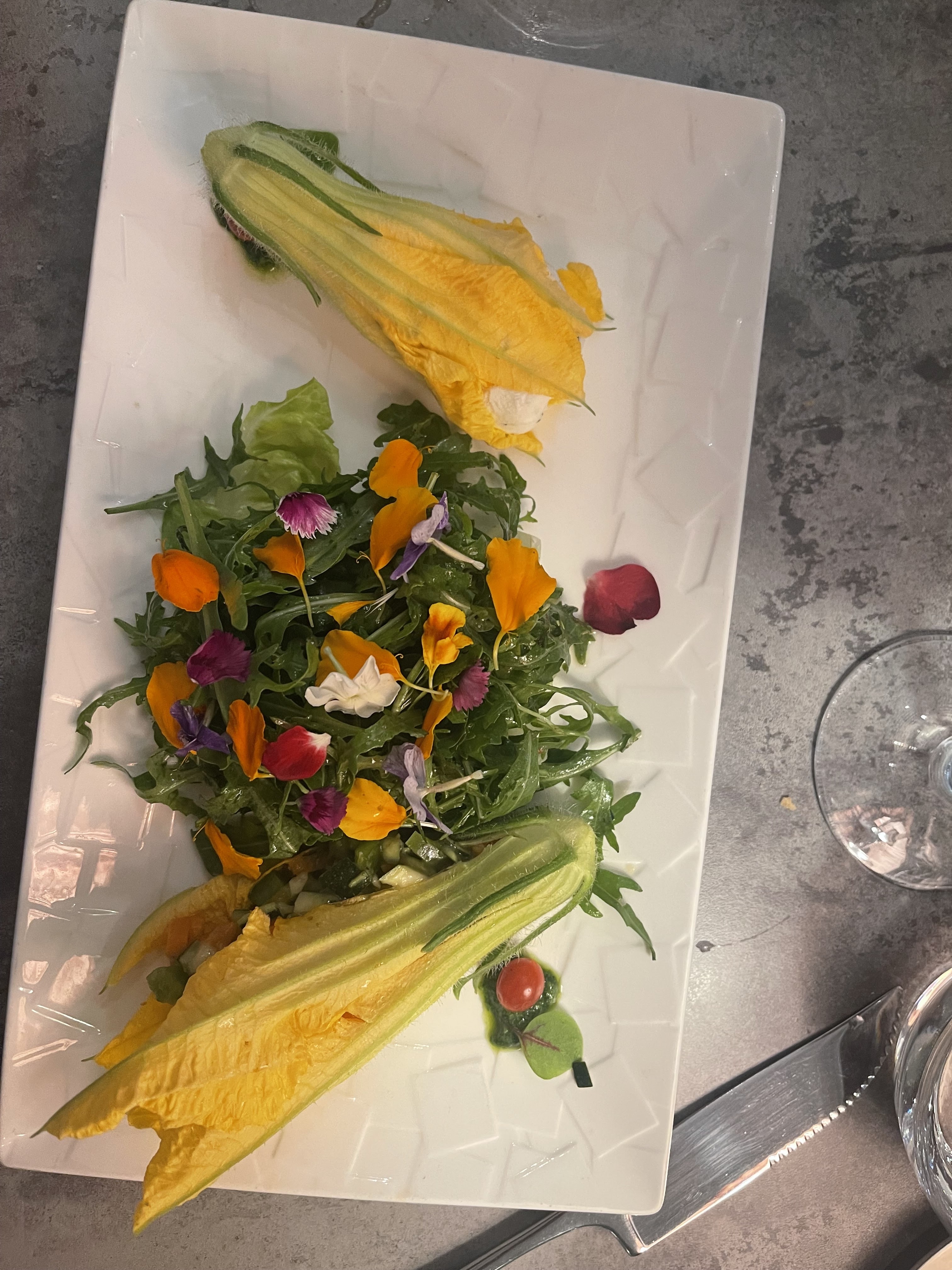 Un dîner fleuri excellent, un vrai découverte. Fleurs de courgettes farcies au chèvre et risotto aux st-Jacques....un DELICE😍