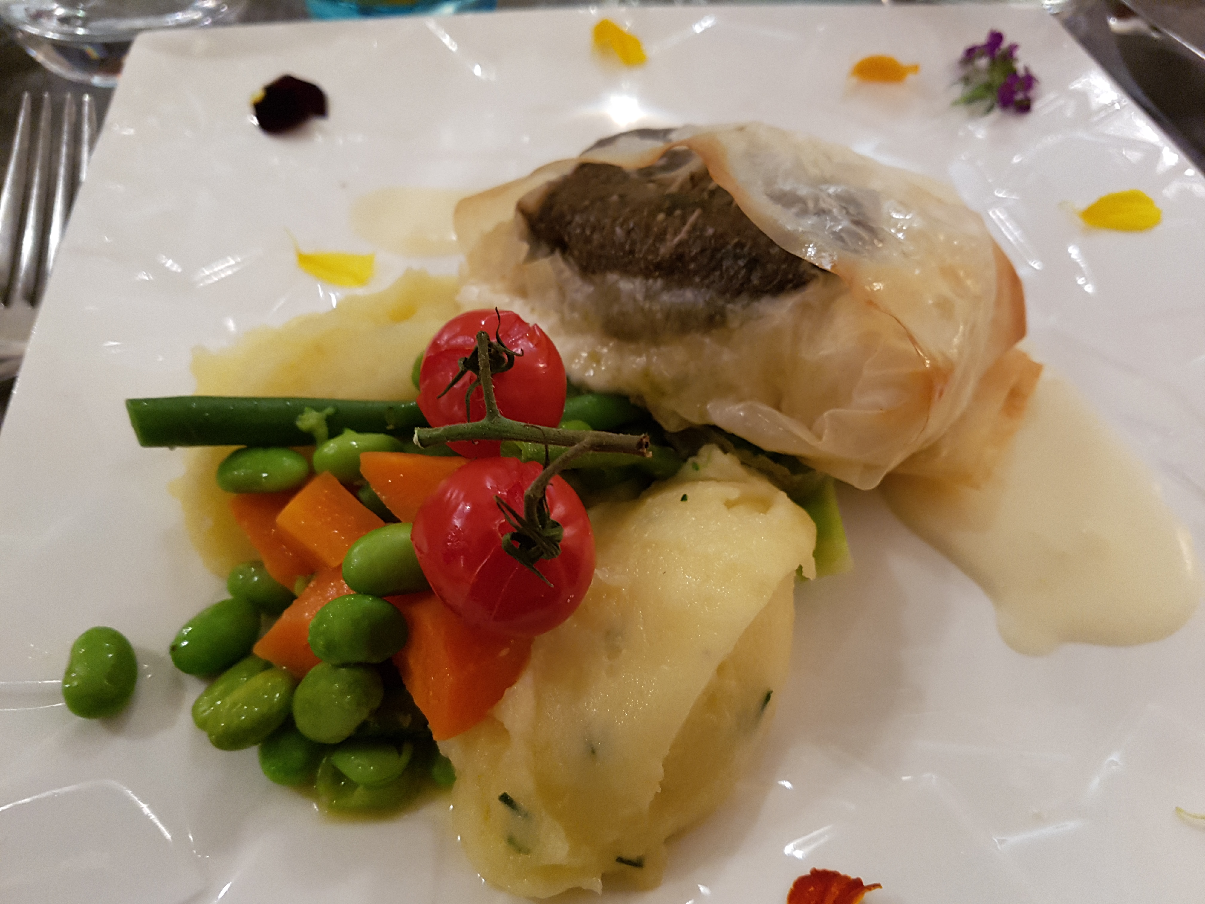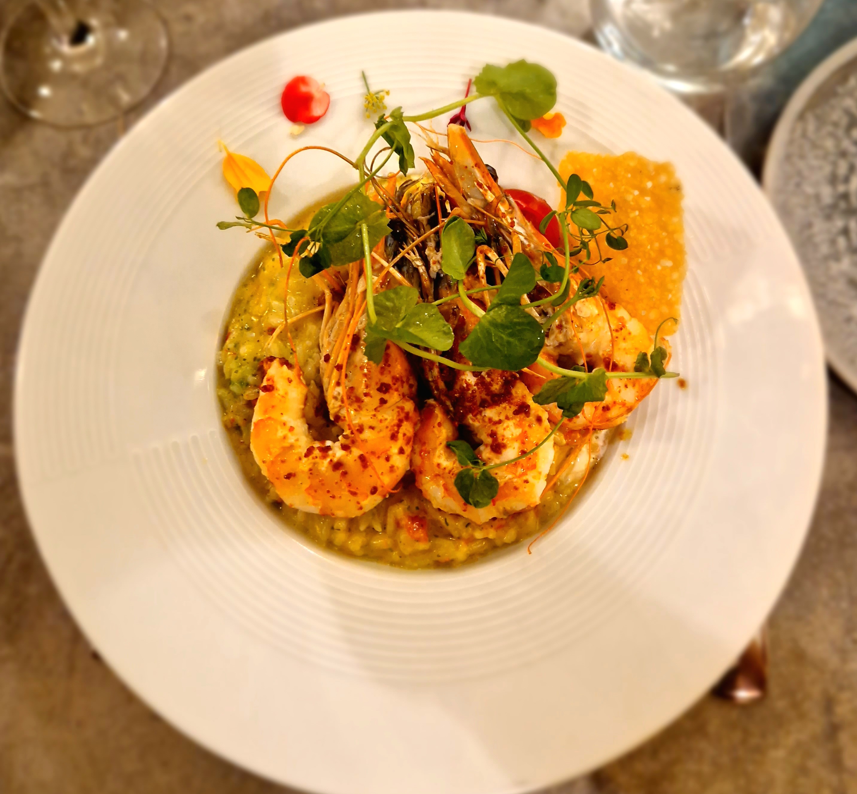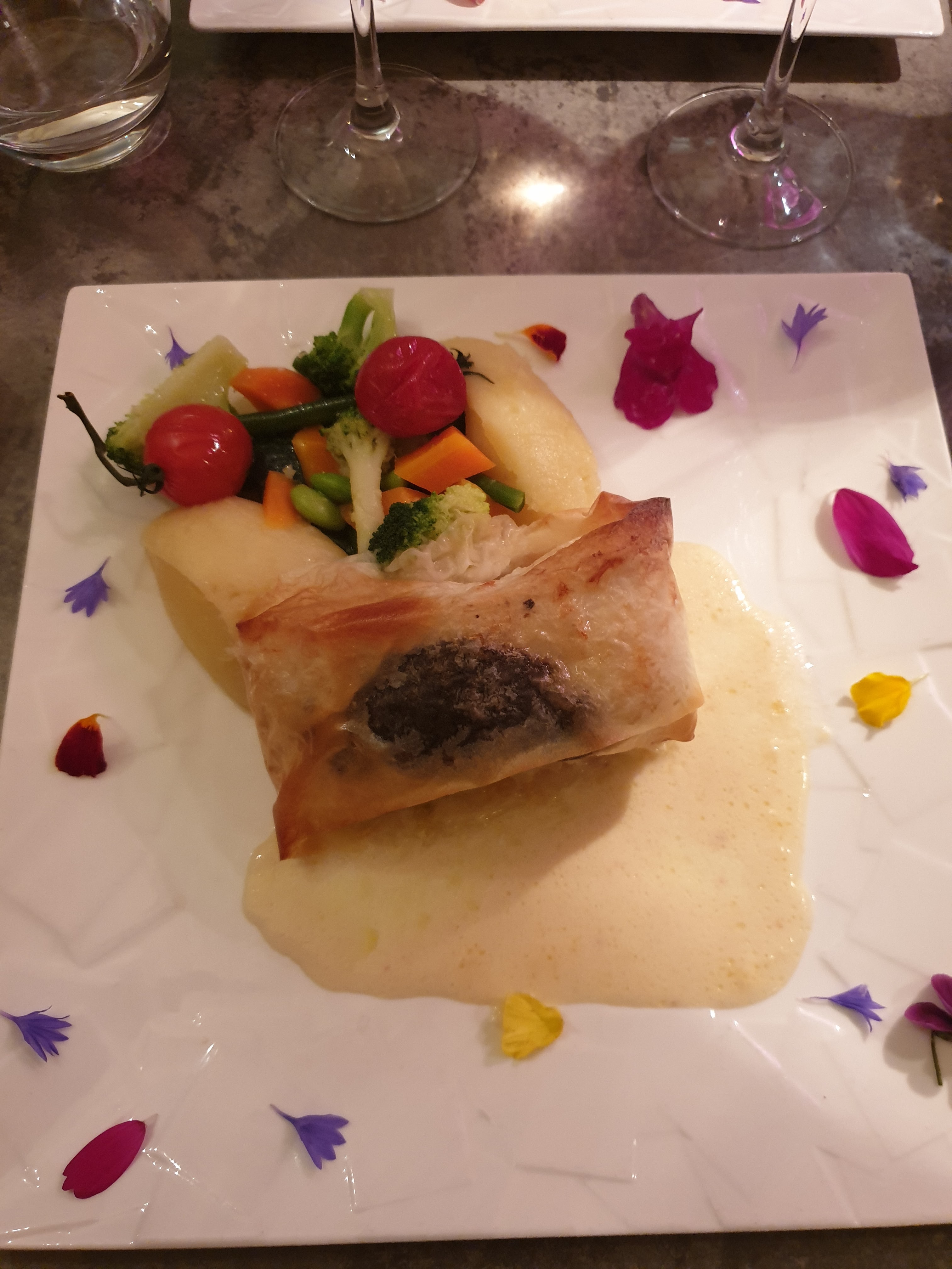 Nous avons mangé le risotto de gambas et le filet de boeuf et c'était déliceux! La présentation avec les fleurs comestibles ajoute une belle touche.