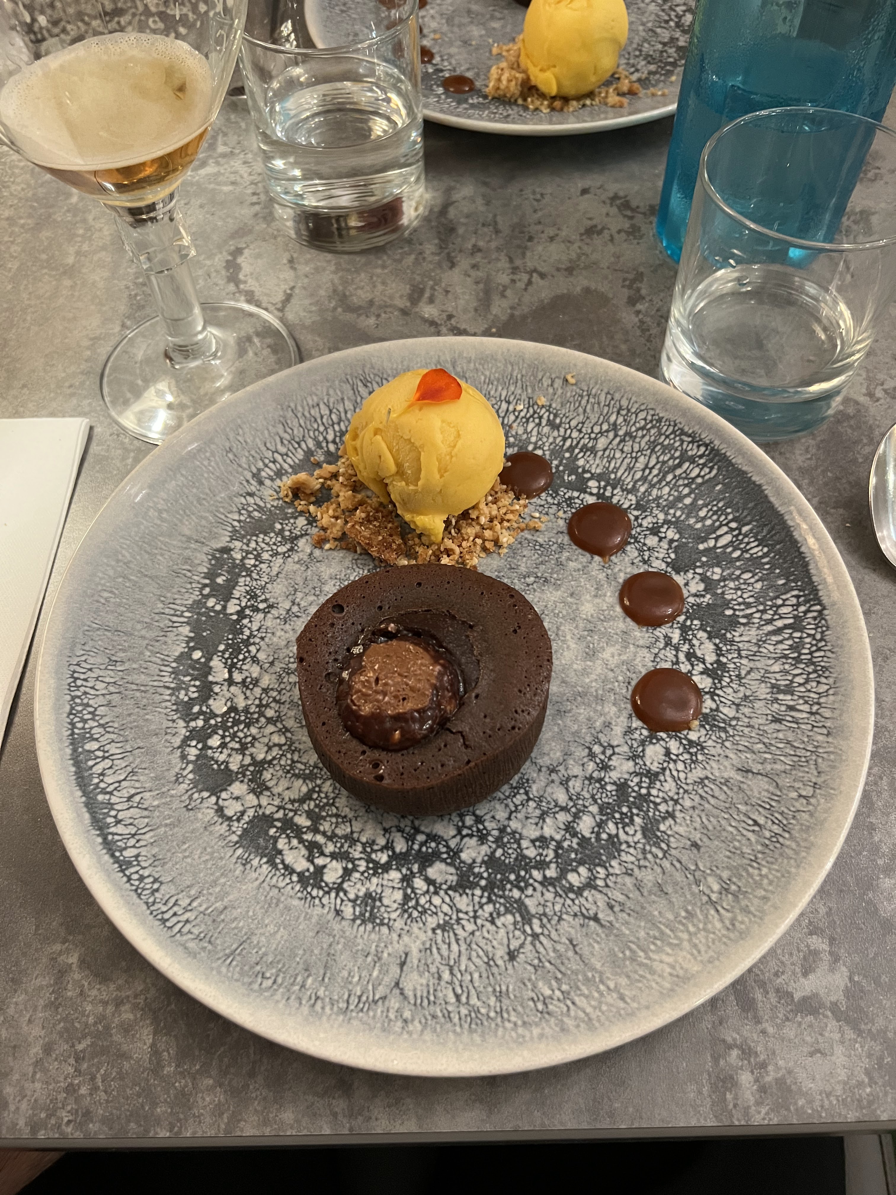 C'est moi qui ai insisté pour entrer car j'adorais le nom du restaurant et finalement, mon compagnon est ressorti encore plus convaincu que moi ! Ambiance cosy, assez familiale finalement. Les plats sont excellents et très joliment mis en valeur. Le service est toujours là et devance quasiment vos désirs. Détail très important : vous avez fini votre carafe d'eau ? On vous en amène une directement. Ça change des lieux où il faut réclamer 3 fois pour avoir la première carafe. J'ai vraiment aime et je pense que ma taille de guêpe n'a pas trop souffert !