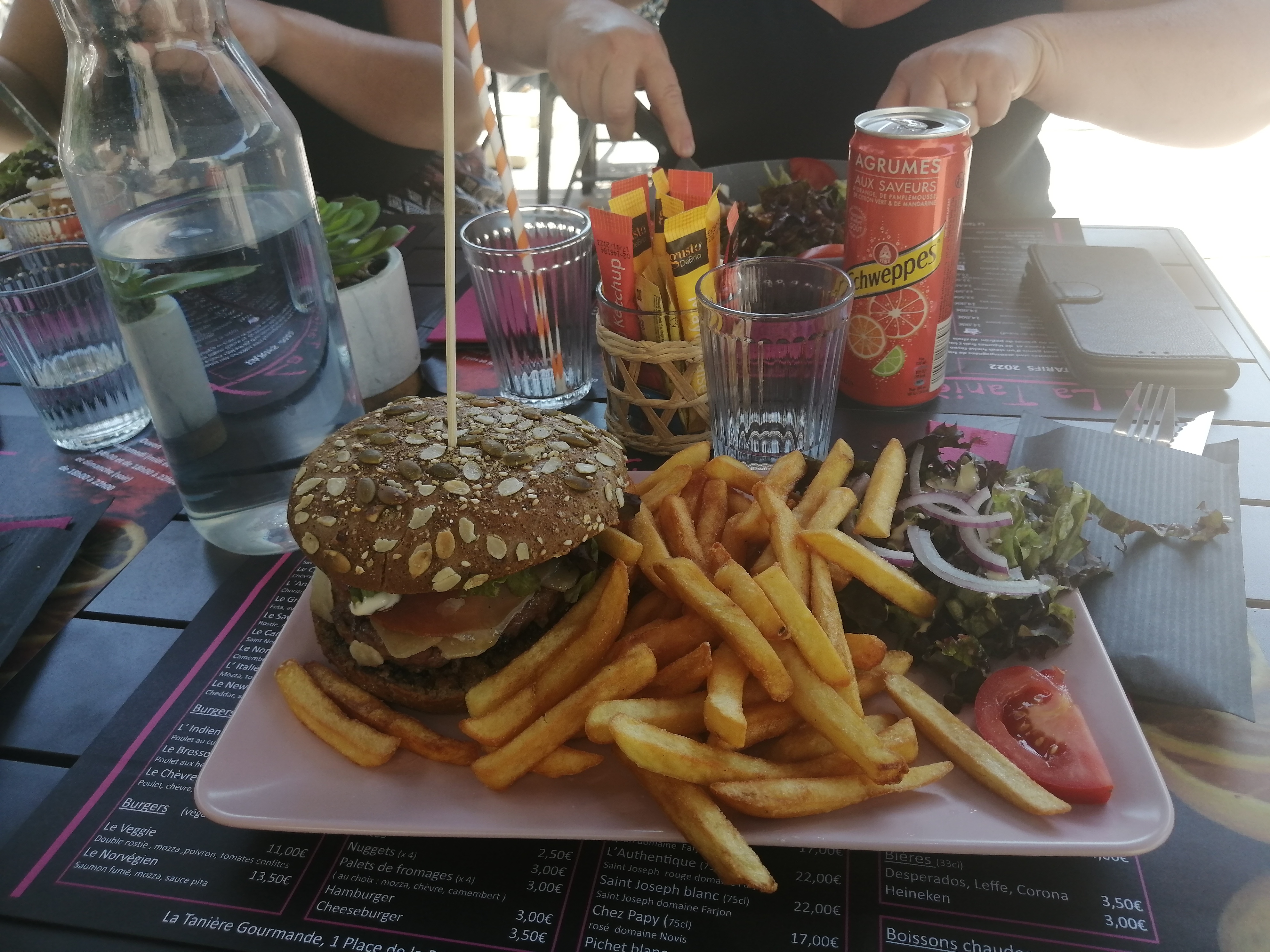 Escale au retour d'Espagne au camping de la lône. J'ai mangé dans ce restaurant. C'est à distance de marche et ils ont de délicieux hamburgers. Très bon restaurant de hamburgers. Très hospitalier. Belle cour où l'on peut s'asseoir tranquillement. Et pendant que vous y êtes, rendez-vous au caviste de l'autre côté de la rue.