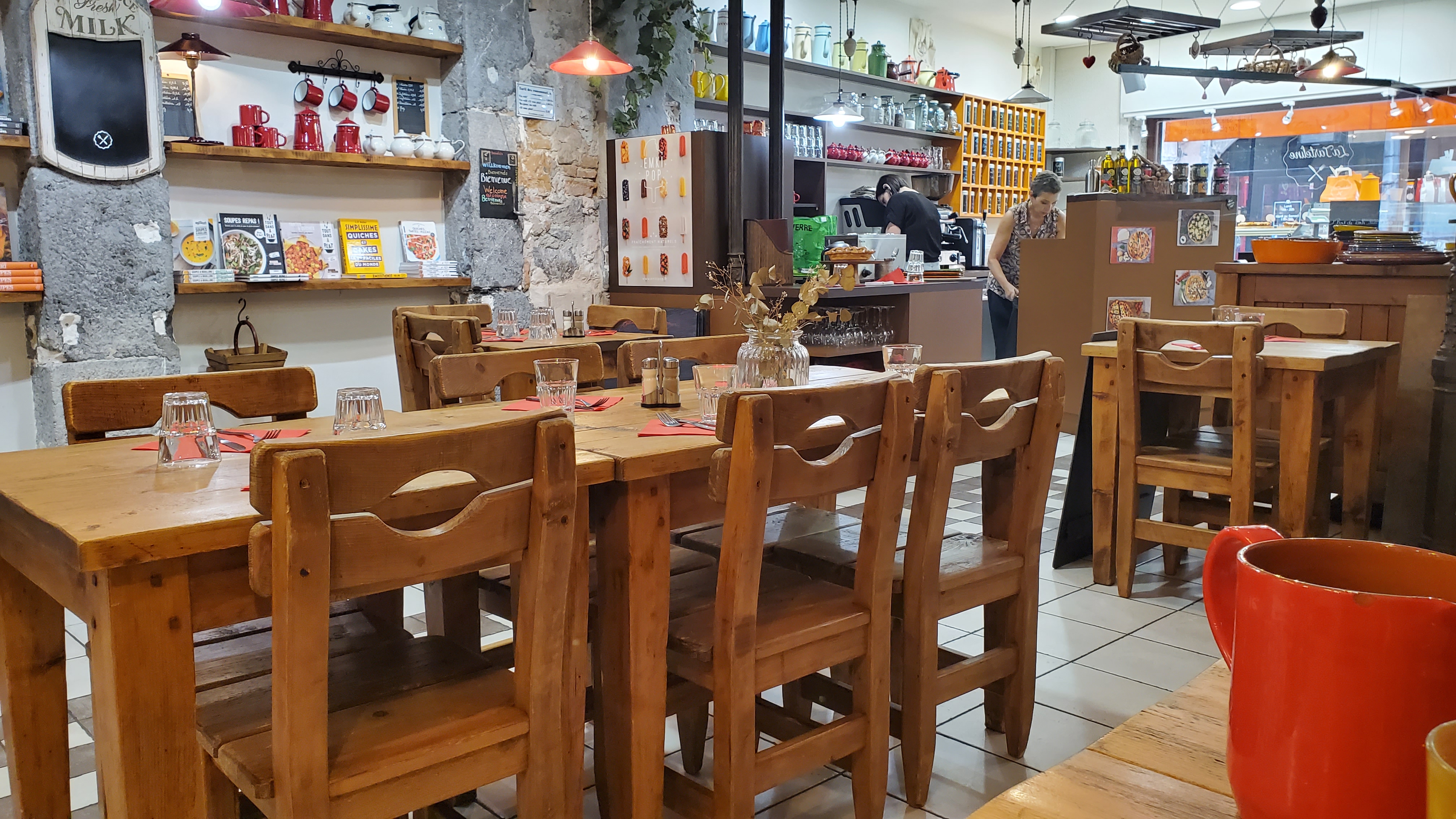 Une ambiance chaleureuse et traditionnelle, j’y ai mangé le midi, les tartes et les quiches sont copieuses, bien présentées et surtout très bonnes. Le tout proposé avec des jus de fruits frais pressés sur le moment. Au top