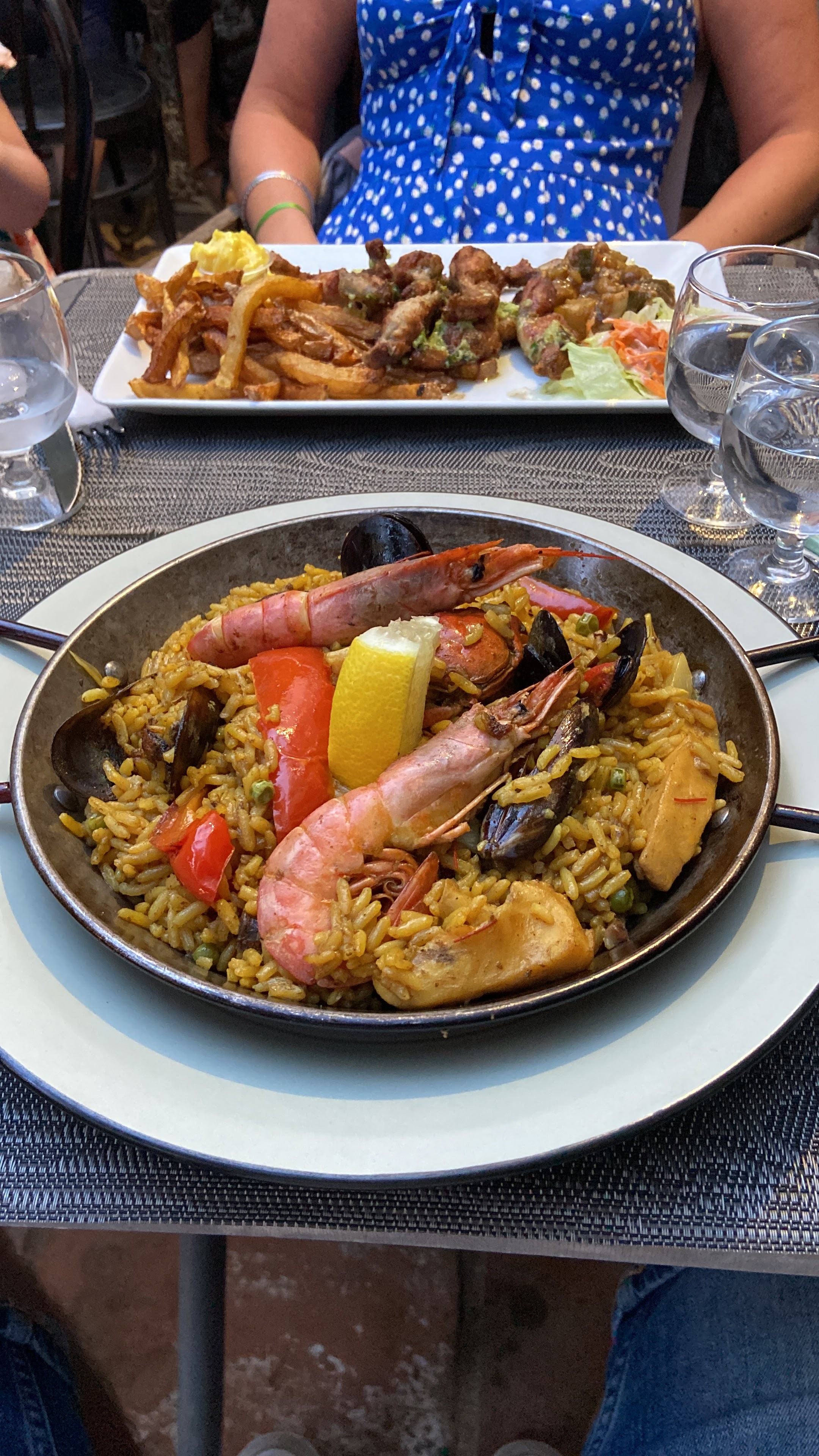 Superbe Paella et Gambas. Joli cadre rustique et bonne musique en fond (David Bowie) 👍