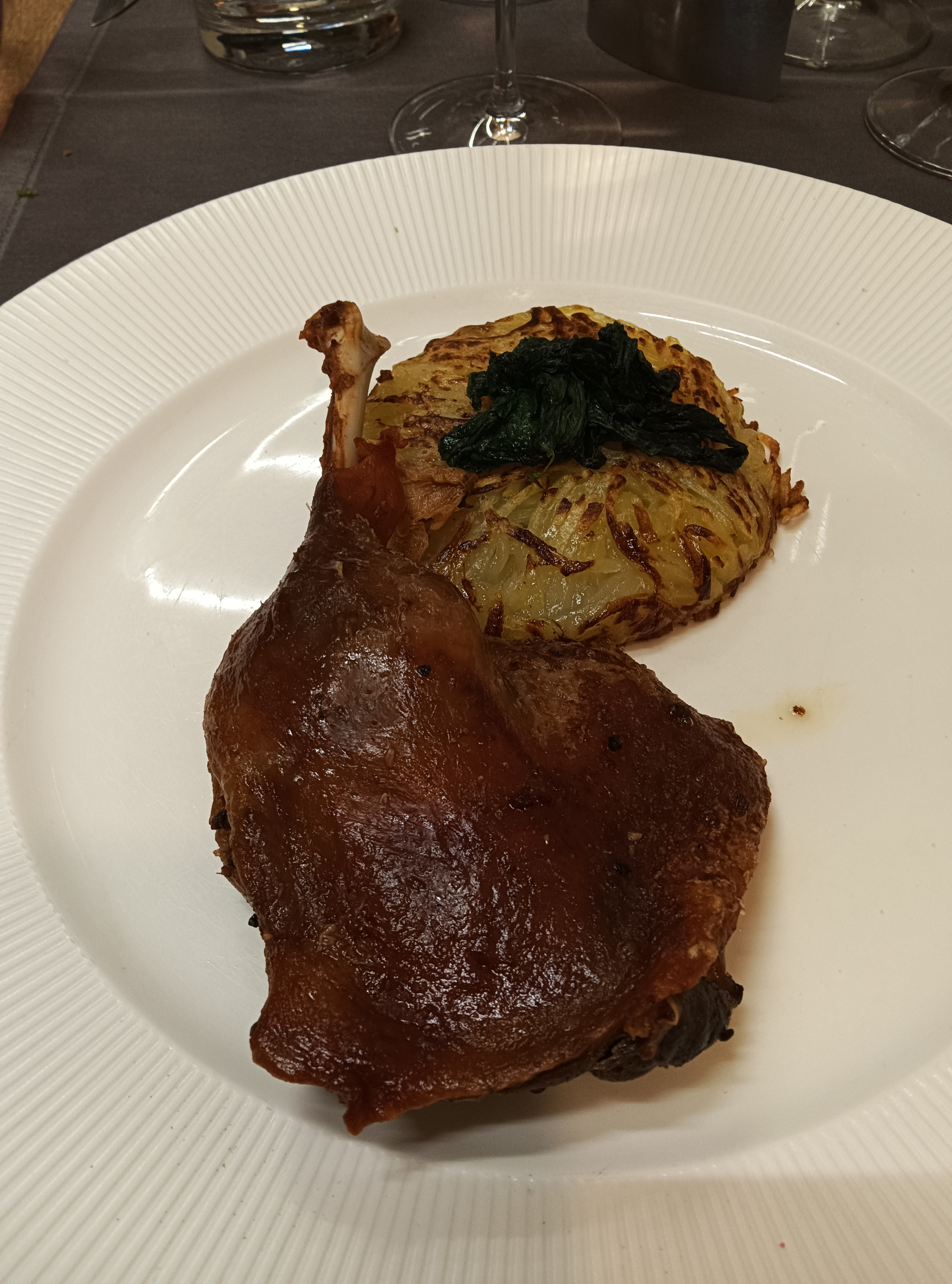Superbe restaurant : déco raffinée, sièges très confortables. J'ai choisis la cuisse de canard confite accompagnée d'une galette de pomme de terre : excellentes. Une touche de julienne de légumes en plus aurait été parfait. La Charlotte aux pommes avec sa sauce au caramel : extra ! La perle de ce restaurant est le serveur trilingue, (au moins) sommelier, et d'une amabilité rare. Un vrai professionnel qui vous guide, communique et papote avec tous les clients avec bienveillance. Sans oublier de vous serrer la main avant votre départ. Merci Monsieur, je garde un merveilleux souvenir de vous. Constance