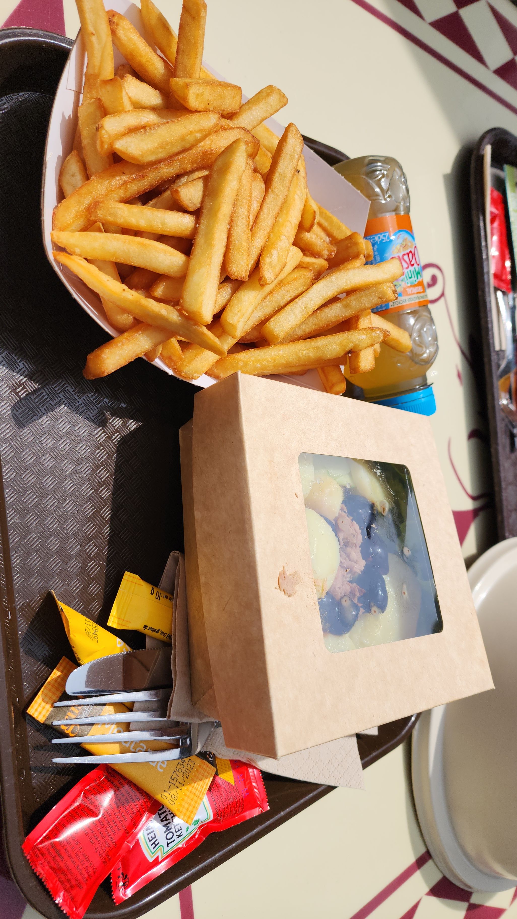 File d attente interminable pour arriver en face d un maigre repas frites saucisses à plus de 10 euros une part de tarte citron à peine décongelée à 4.50€ même chez Hediard c'est meilleur et moins cher accompagné s au choix d'un pepsi et d un origina sans goût avec 70% d eau.A fuir ,conseil amener votre sandwich et votre canette vous serez mieux servis et vous ferez des économies.
