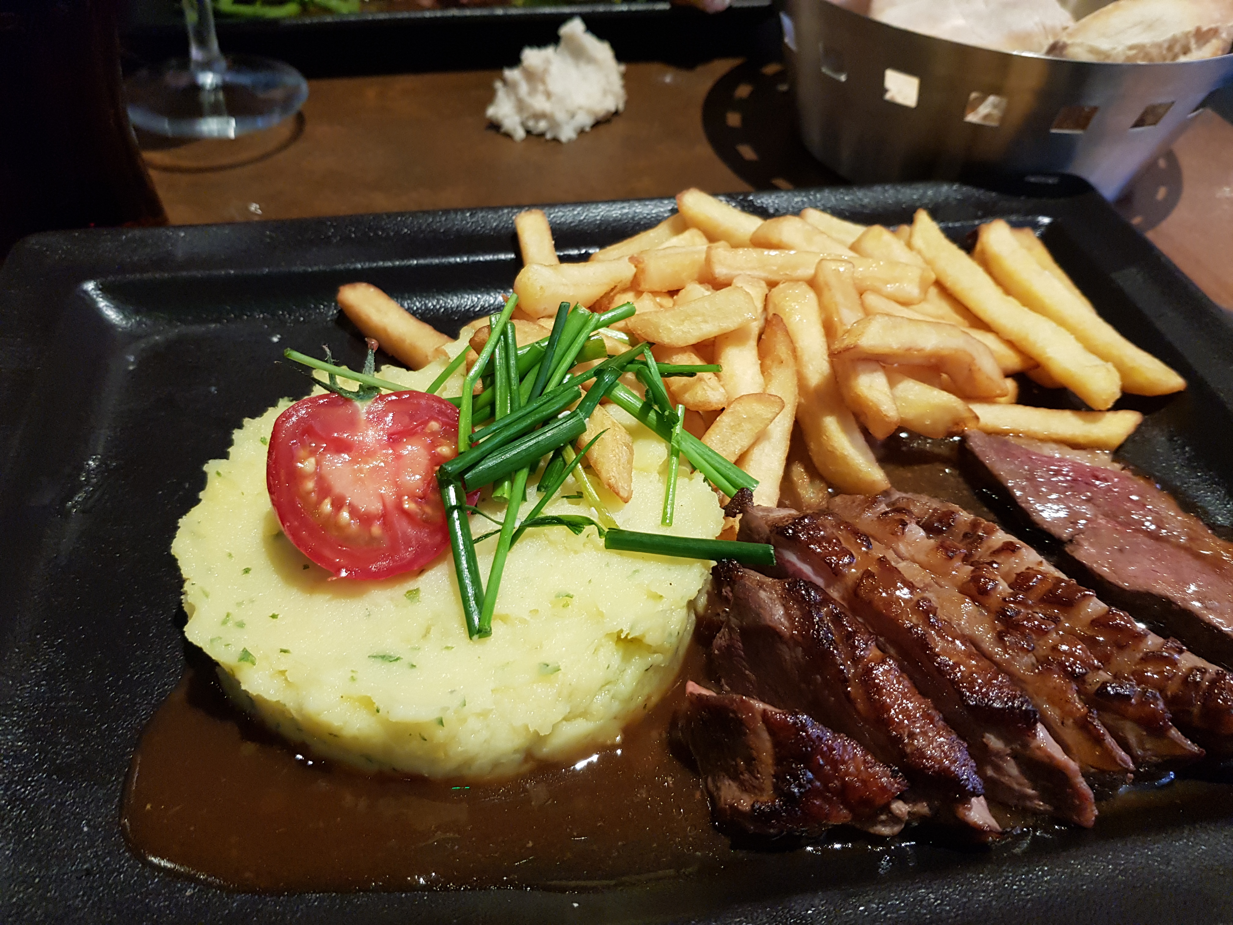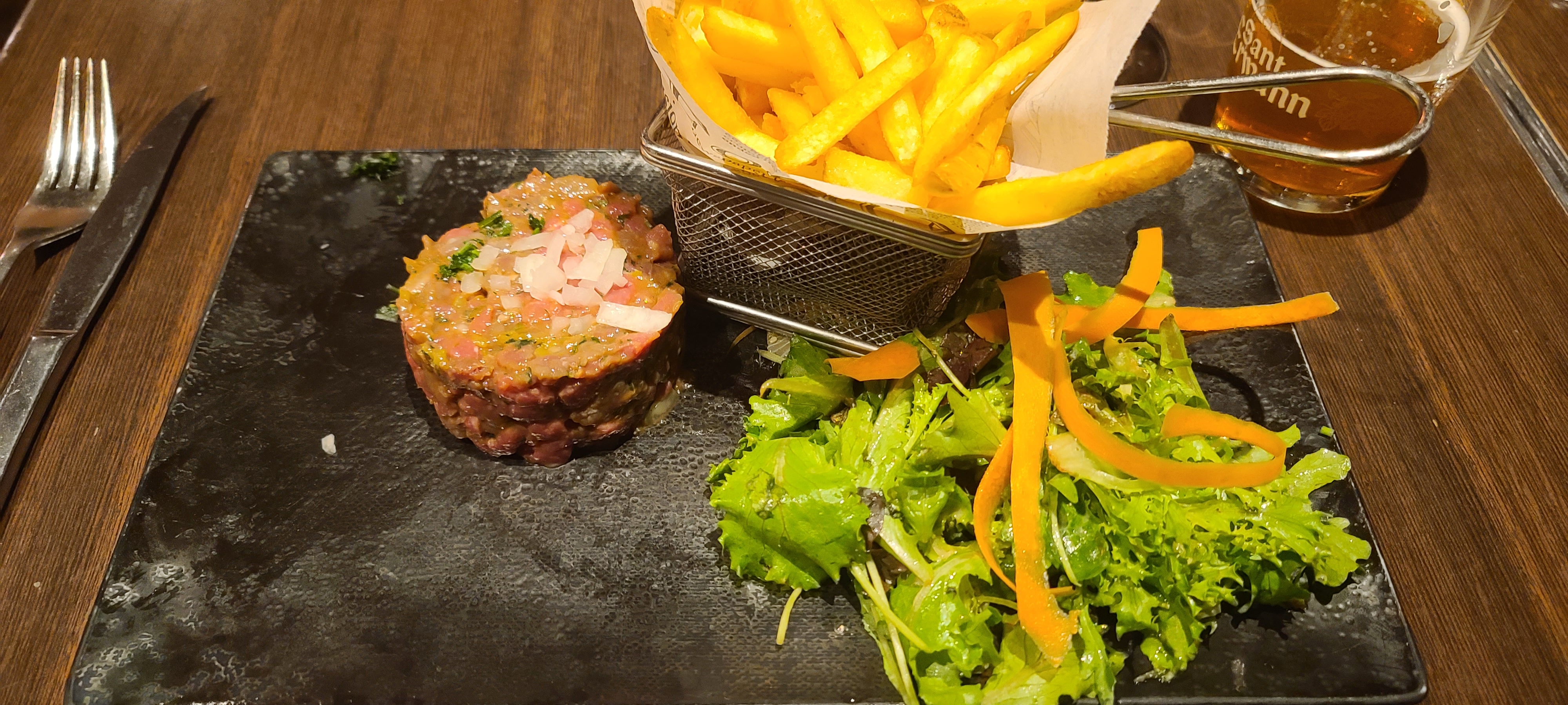 Une très bonne expérience, du début à la fin cependant quelques légers points négatifs. Pour le positif, les produits sont bons, de bonne qualité, dans notre cas une belle entrecôte accompagnée de très bonnes frites et une excellente sauce gorgonzola, une brochette de poulet cajun elle aussi accompagnée des fameuses frites. Les desserts étaient bon, sans plus mais rien à redire, la glace était bonne, de même pour la crème brûlée. Les portions étaient parfaites. Le service était parfait, malgré le petit quiproquo, ni trop rapide, ni trop lent, professionnel et réactif. Pour le négatif, les tables pour deux sont un peu petites, ce n’est pas non plus une fin en soit, l’ambiance est tout de même assez bruyante du fait de la proximité des tables. Ces points négatifs ne sont que très légers et n’ont pas impacté notre expérience de manière considérable qui reste donc globalement très bonne.