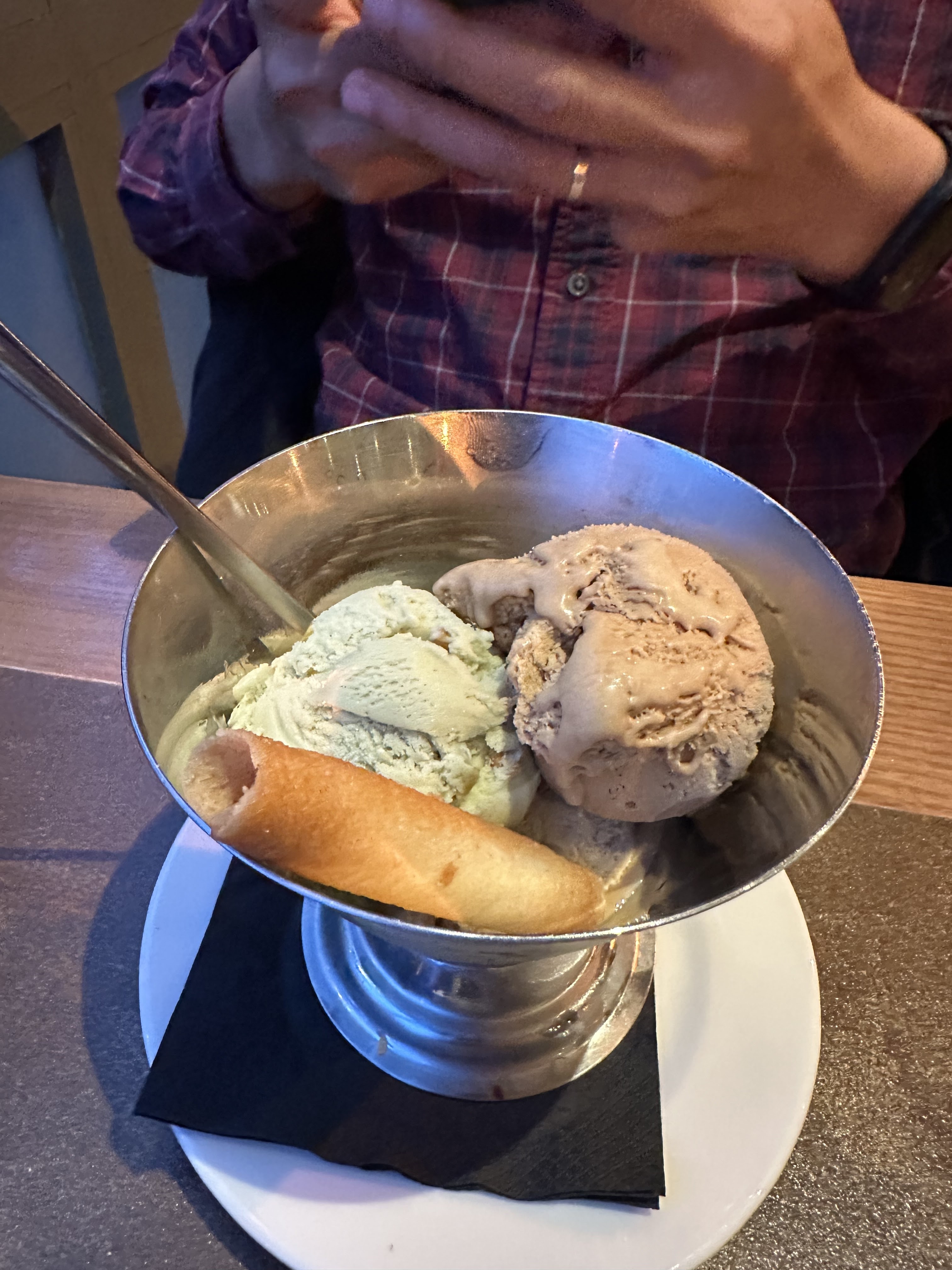 Accueil et ambiance irréprochable. Personnel agréable. Pas trop de monde donc bruit très modéré. Me concernant petit hic sur la cuisine. J'avais commandé un mix grill poisson et clairement les brochettes de poissons et crevettes beaucoup trop cuites... Boule de glace dans le café gourmand avec un goût menthe et j'ai horreur de la menthe (on nous ne demande pas le parfum souhaité) dommage.