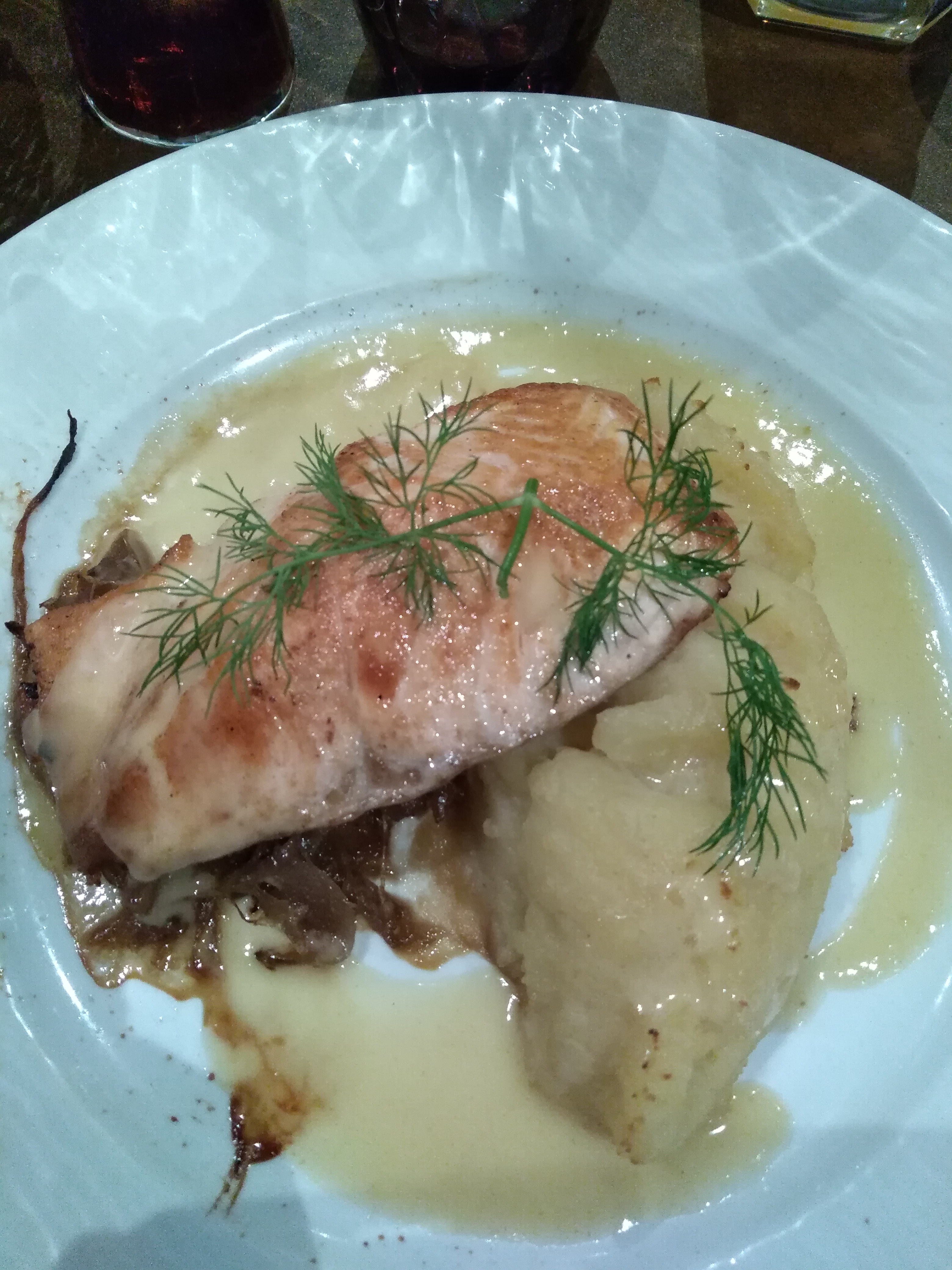 Accueil très bien, service RAS. Fish and chips bon, sauce tartare industrielle, par contre frites industrielles et à peine tiède. Le pavé de saumon très bien. Par contre Le profiterole moyenne avec une glace à la vanille mais qui n’avait aucun coup.