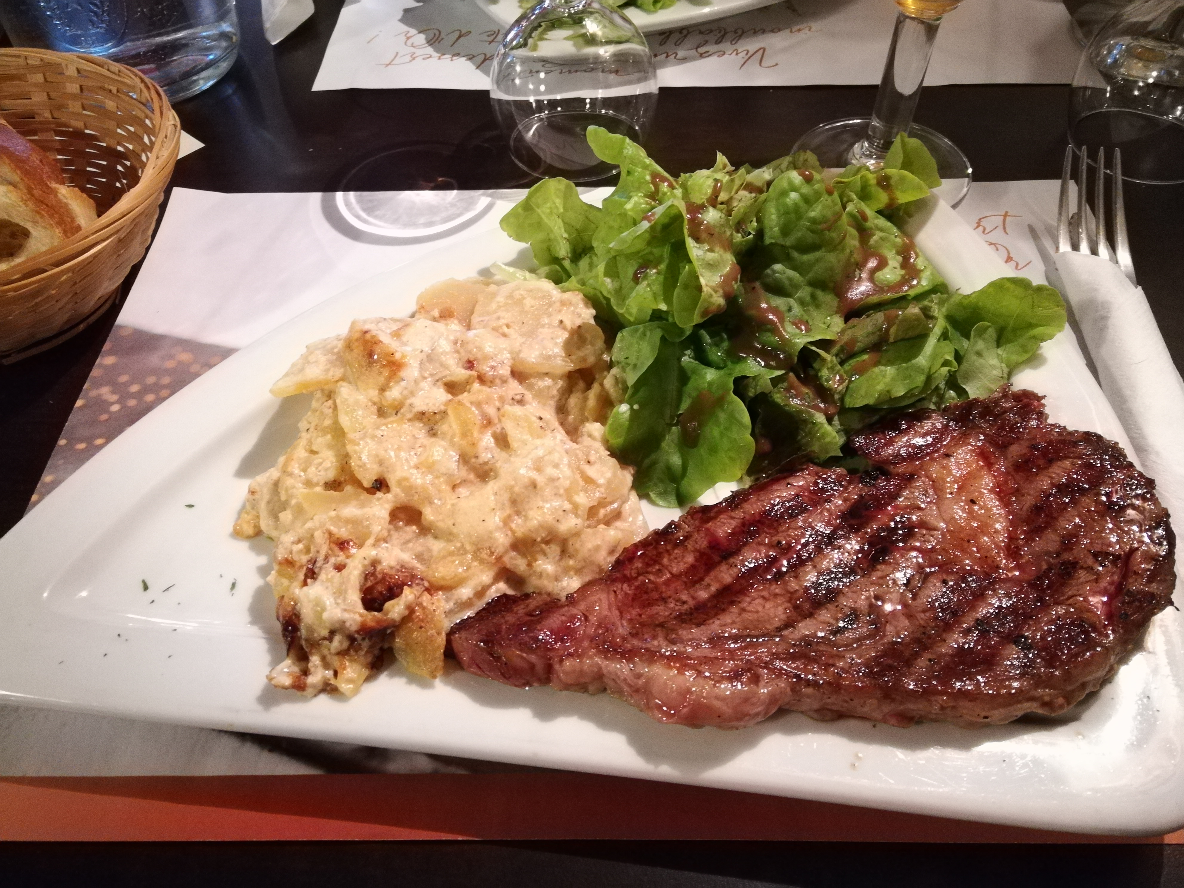 Plat du jour entrecôte gratin ( la viande d un goût et du tendresse parfaite et le gratin un goût d ail comme à la maison ) accueil et service impeccable