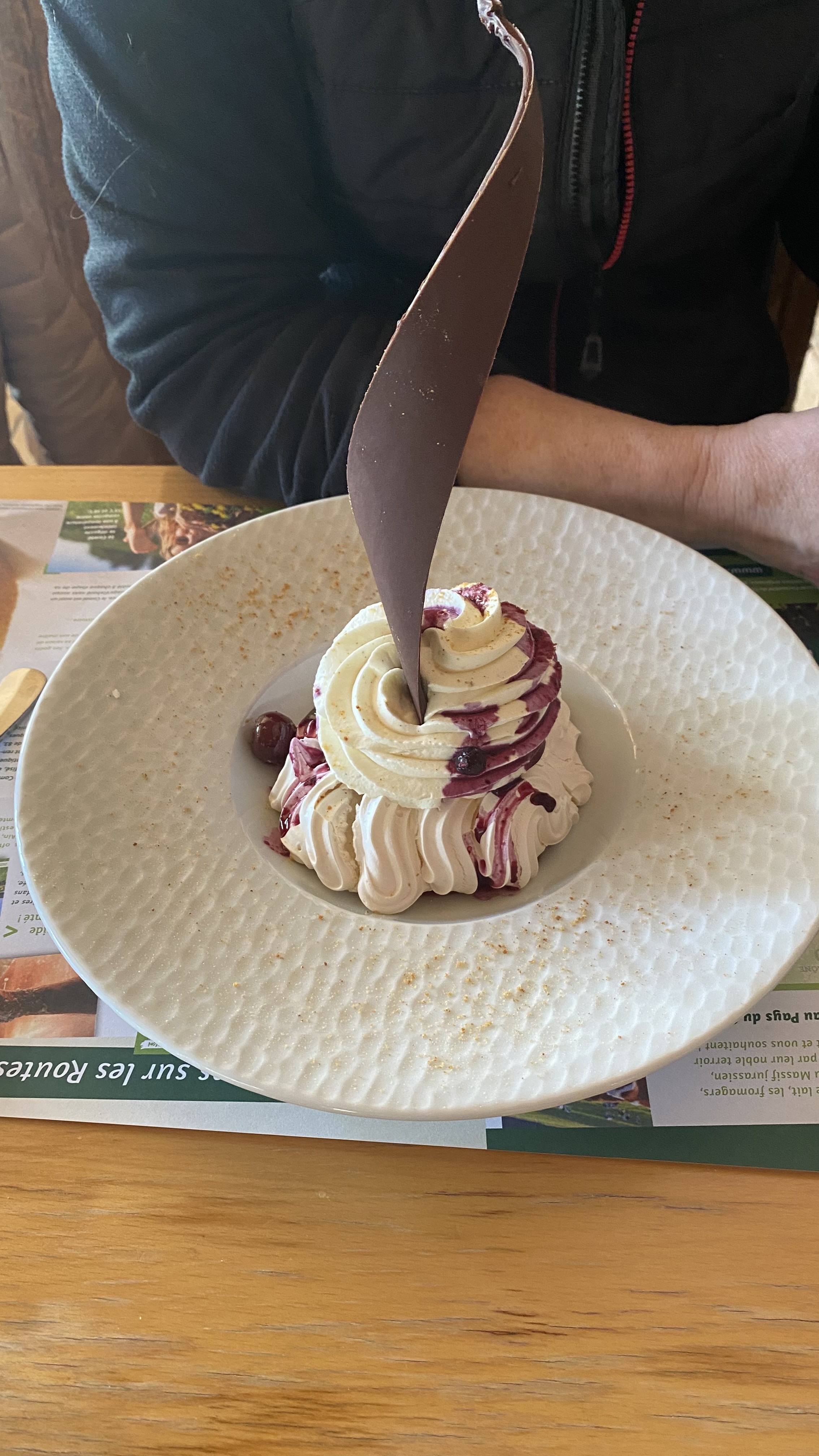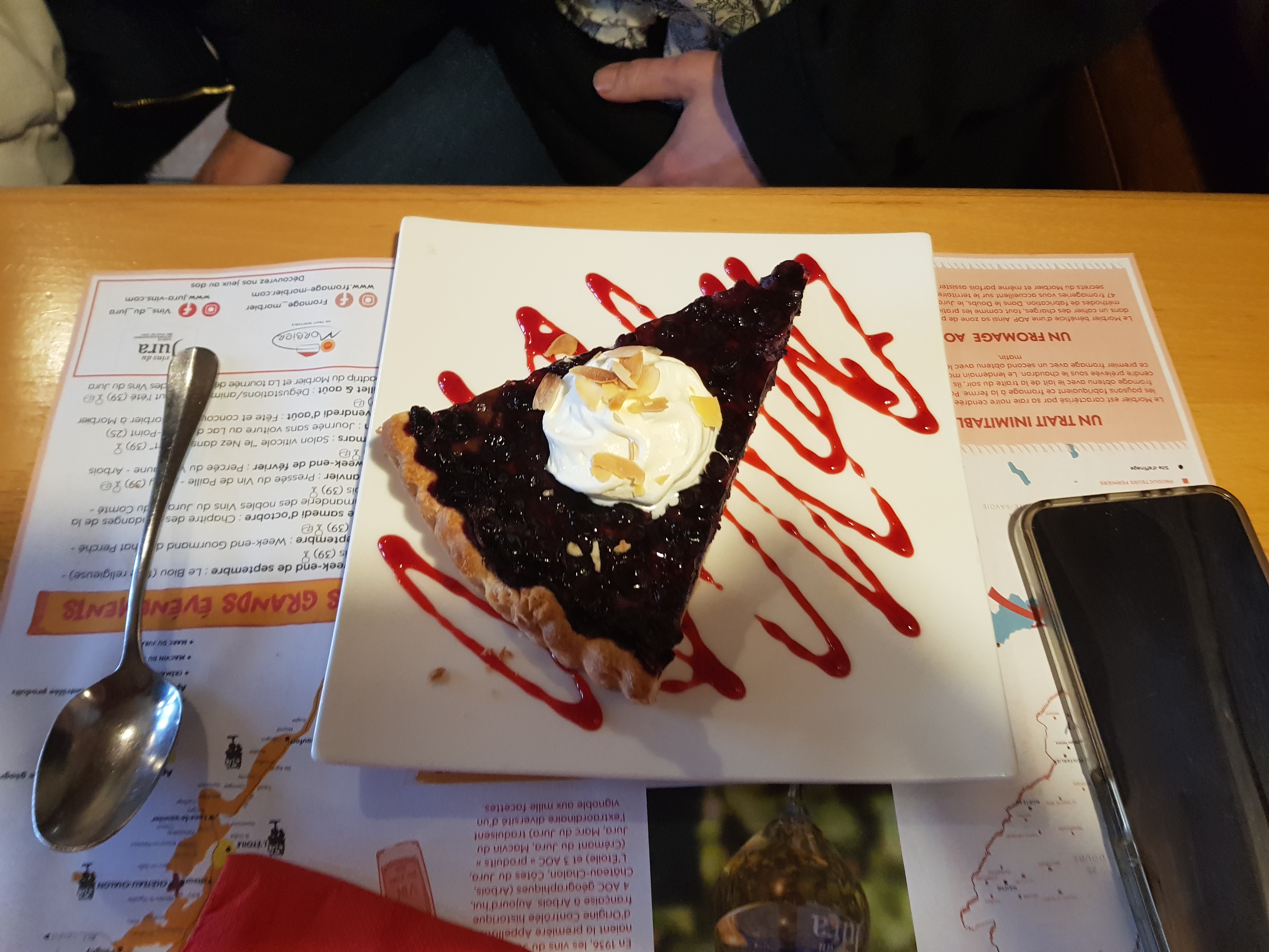 Accueil très agréable et souriant Dégustation de la boette assiette bien chargée (mont d'or, jambon salade, pommes de terre vapeur) et très gustative accompagnée d'un vin du Jura Sablé breton aux myrtilles avec crème en dessert