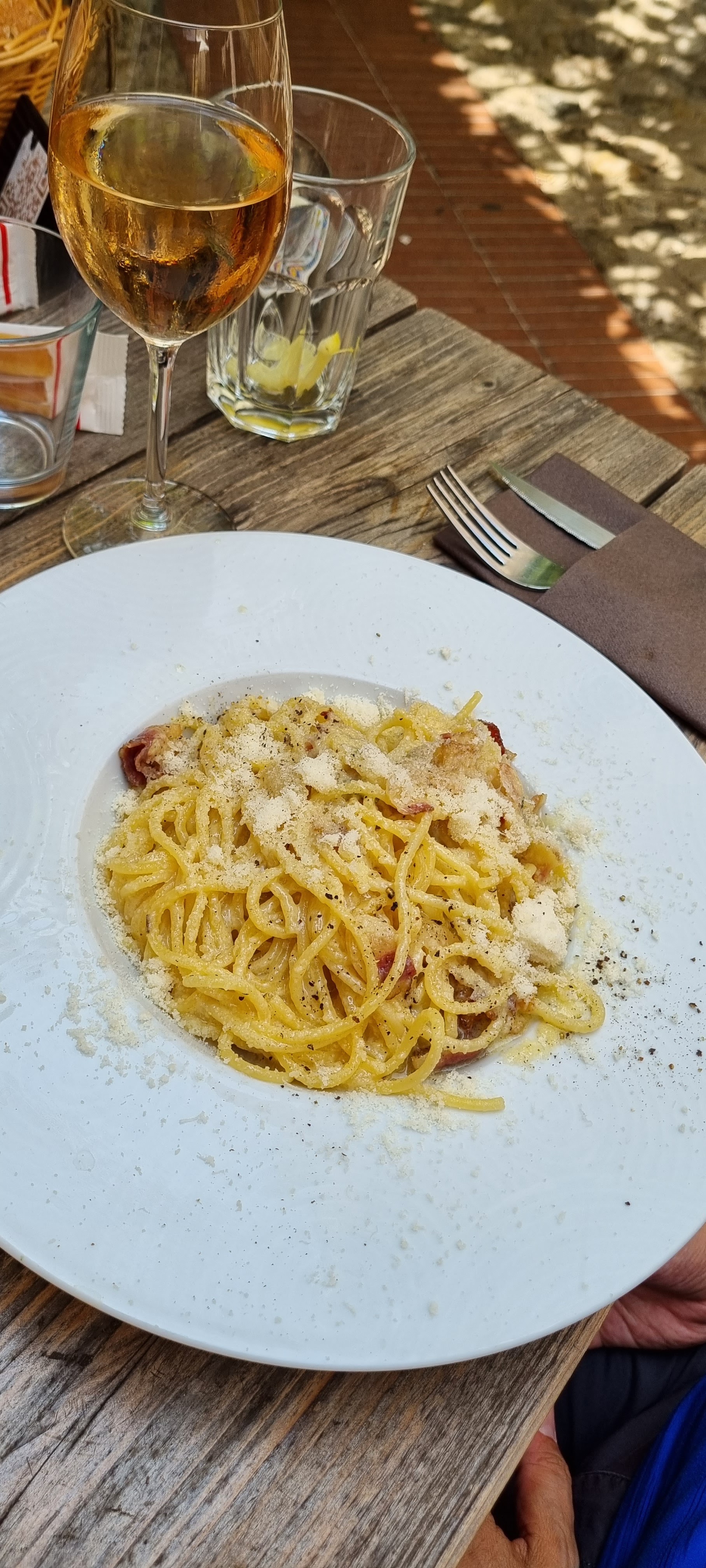En tant que Romain, c'était la pire carbonara que j'ai jamais vue, et encore moins mangée. La guanciale, SI c'était de la guanciale, était coupée comme du bacon, ce qui est déjà un crime contre toute l'Italie, et les pâtes n'étaient pas bien séchées avant d'être jetées dans mon assiette, ce qui aboutissait à un bouillon de carbonara assis au fond. fond de mon assiette, bref quelque chose que j'espère ne plus jamais revoir. C'était déjà mauvais, en plus c'était 16 euros JUSTE LA CARBONARA et vous pouvez imaginer mon dégoût. Je comprends les prix des touristes, mais allez au moins servir une nourriture décente. Ma copine a eu un aglio e olio qui ressemble aux pâtes les plus élémentaires que l'on puisse apprendre à cuisiner (la carbonara est également très facile à préparer, c'est pourquoi je n'arrive pas à comprendre ce qu'ils m'ont servi) et elle avait en quelque sorte le goût de poisson, c'était encore pire que ma carbonara et cela doit être une sorte d'accomplissement en soi. Belle ville et bel emplacement cependant, le personnel était sympathique et parlait partiellement italien aussi, c'est pourquoi il mérite deux étoiles.