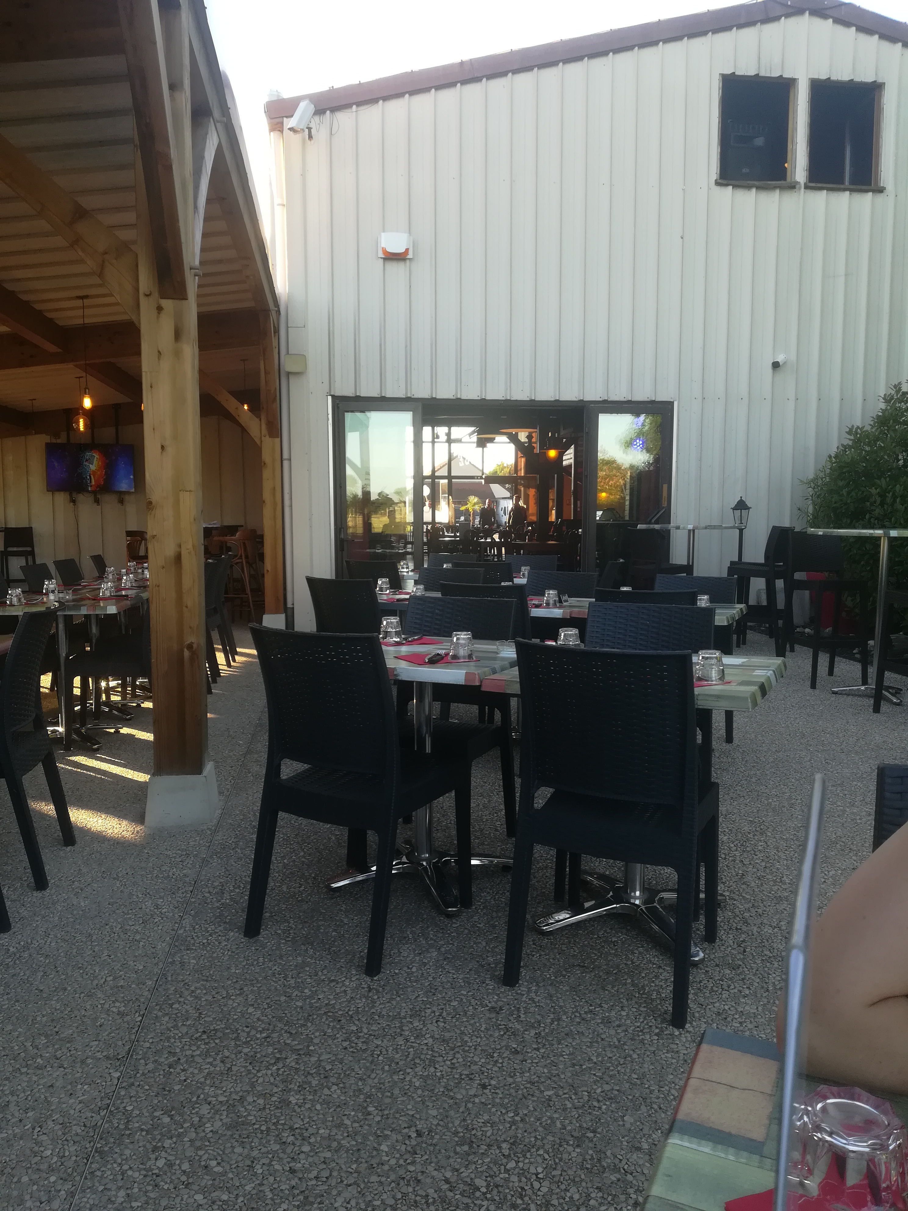 Commençons pas les points positifs : - cadre sympa - de l espace - parking - nourriture bien Les points négatifs : - accueil froid - pas de sas à l entrée. - on ne vous propose pas la carte des boisons - serveur peu aimable -chauffage à pétrole . On se caille pour manger . - le top, on repart avec une bonne odeur de graillons sur les vêtements. Je ne recommande pas