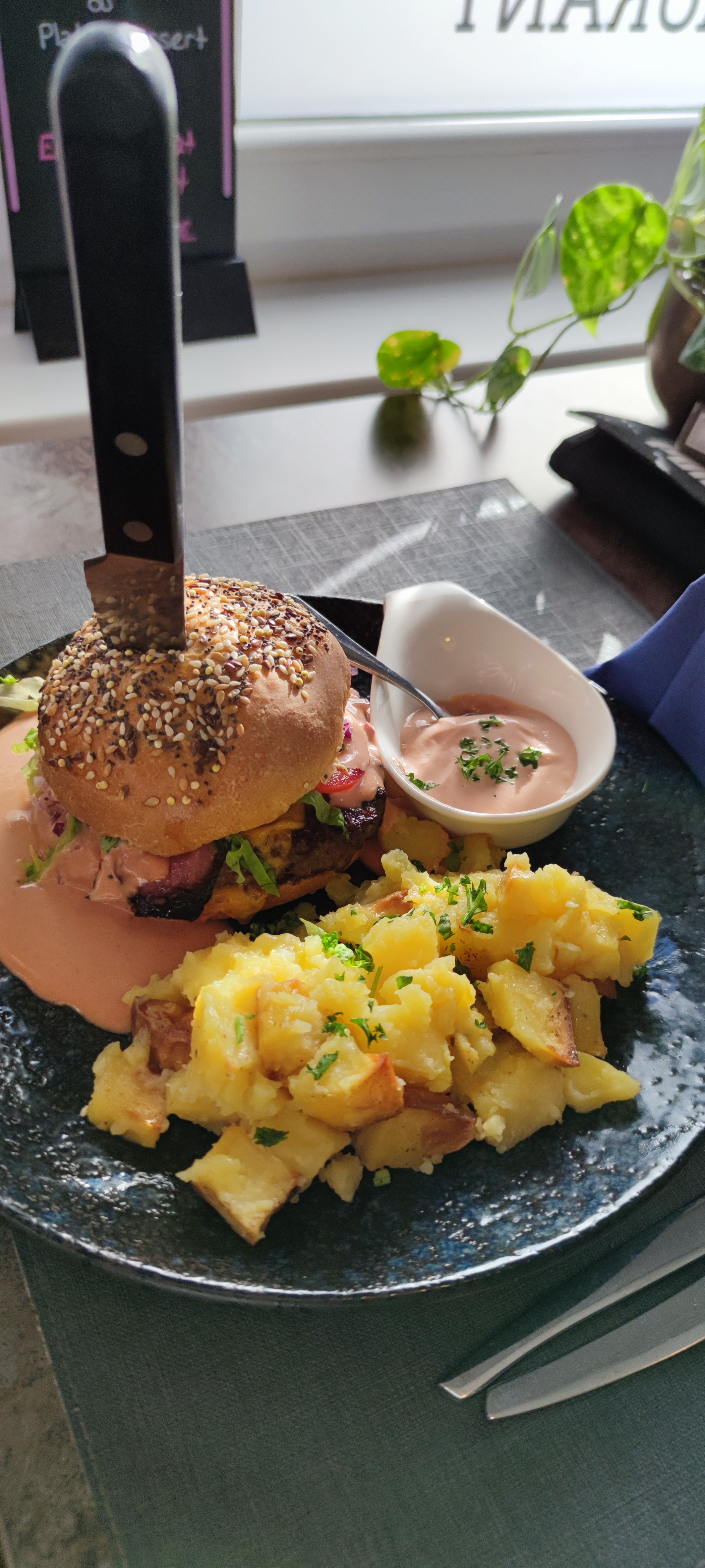 Endroit accueillant, décoré avec goût, végétation, et industriel Serveur souriant, plat délicieux 😋