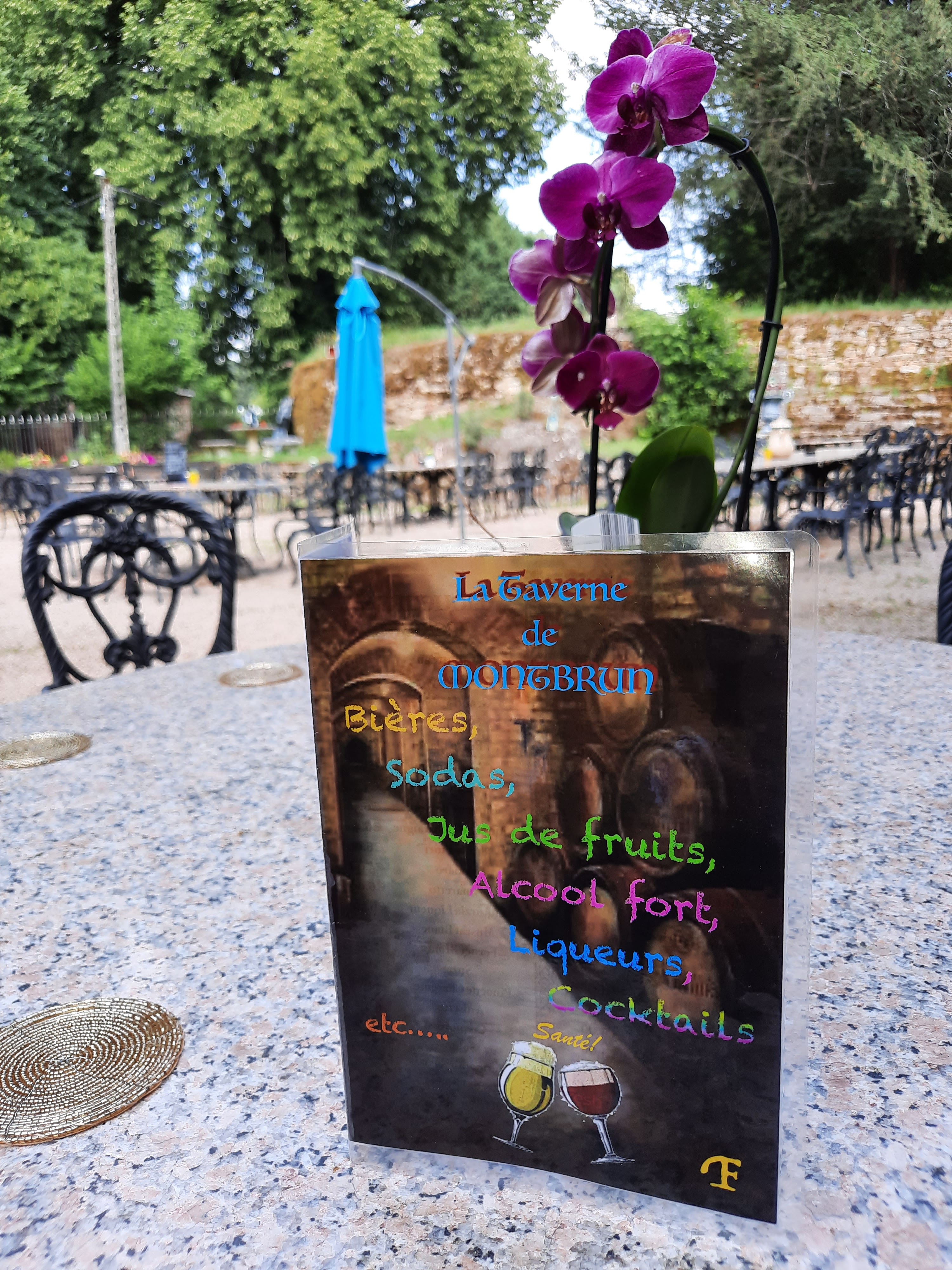La nourriture, le vin et la bière de première classe au bar de La Taverne de Montbrun à l'intérieur sont une fantastique dame au feu ouvert qui le dirige et joue du violon électrique ? elle vient de partir vendredi soir 25 août et elle est également un chef fantastique ? ? dommage que nous ne l'ayons trouvé que 3 jours après y être allé la maison est géniale 🤩🤩🤩🤩👍visité le 25 août à l'extérieur des tables et la vue sur le château est fantastique