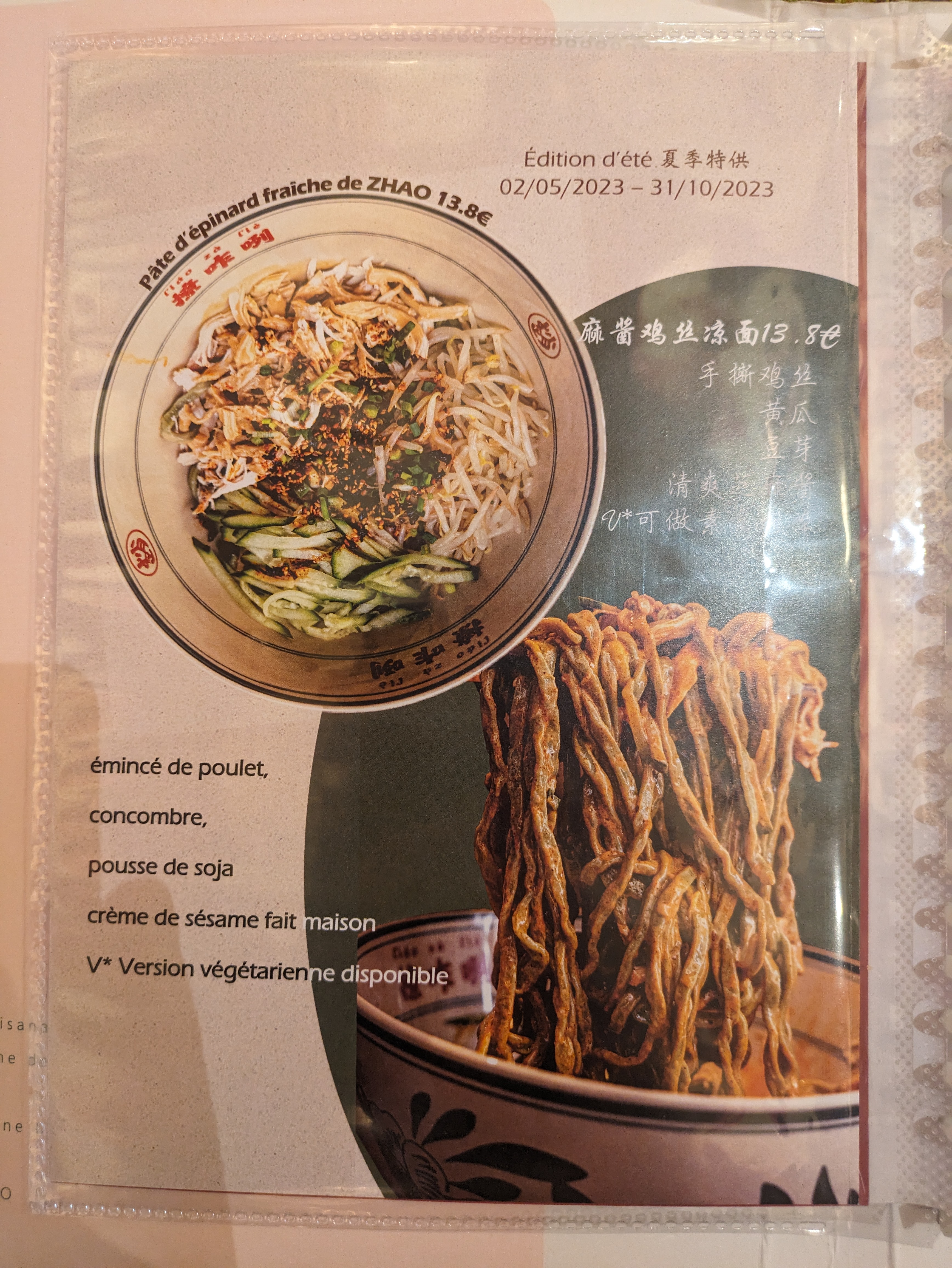 Très bonne expérience à la Taverne de ZHAO. Le cadre est extraordinaire et les nouilles absolument EXCELLENTES. Option nouilles froides en été et nouilles végétariennes pour les végétariens. J'ai commandé une salade d'algues épicée très très bonne. Attention les plats sont bien copieux. Ne pas avoir les yeux plus gros que le ventre (même si tout donne envie). Très hâte d'y remanger.