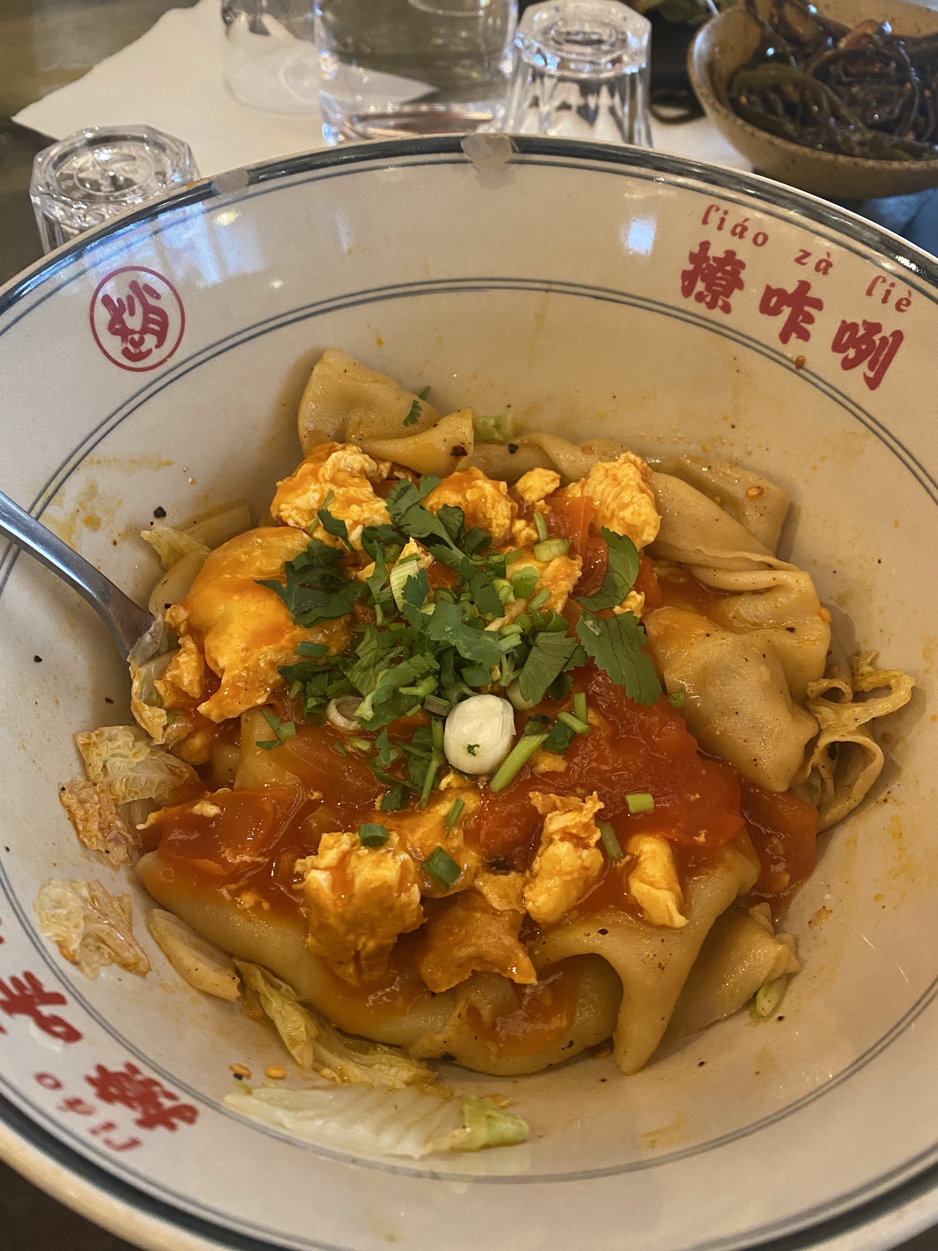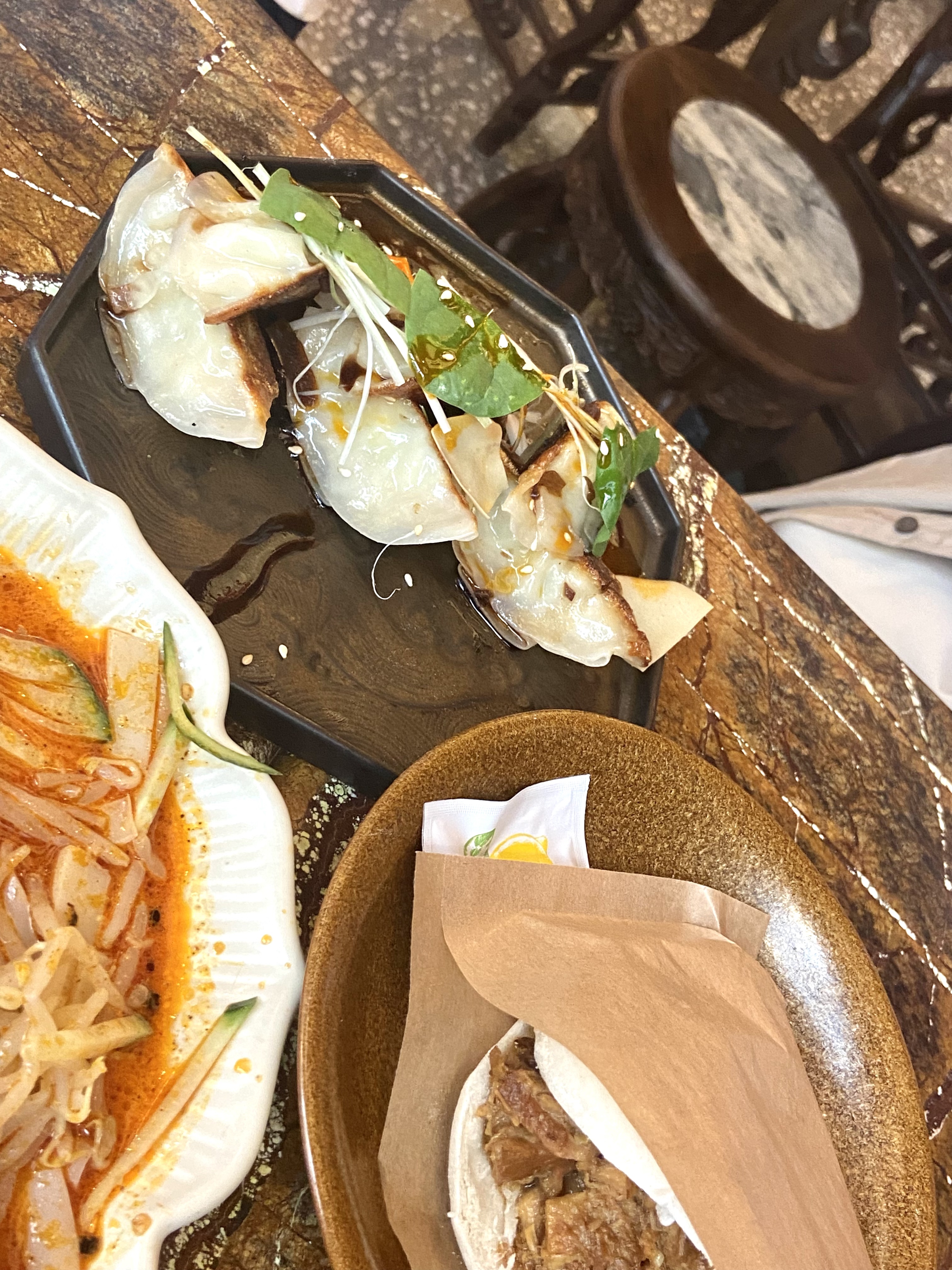 Les raviolis étaient bon , j’ai préféré grillée par rapport à vapeur , les pâtes biangbiang je mettrai 7/10 , on sent pas trop la tomate et le piment est super léger , par contre il fait super chaud dans le resto