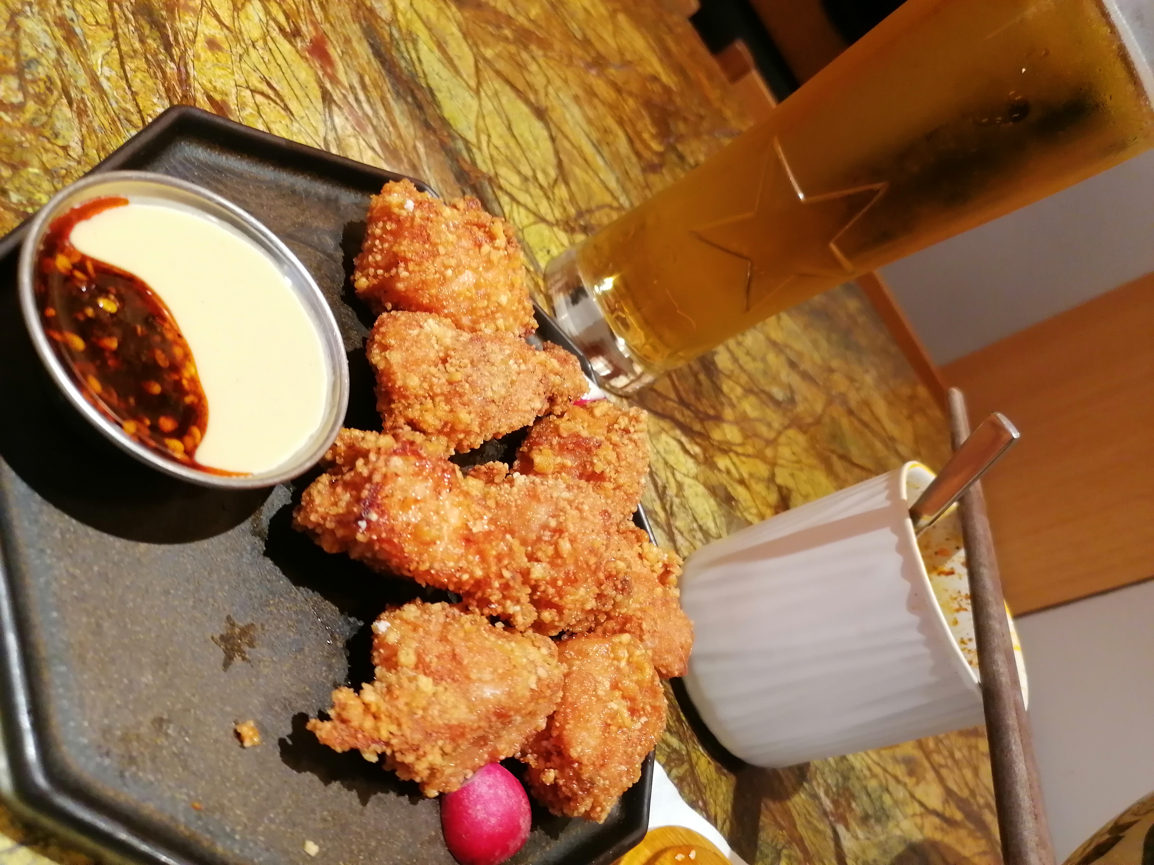 J'ai pris du poulet frit et des pâtes Biang Biang Tomate et Porc. Le poulet frit et la sauce c'était top 👌 Par contre les pâtes j'ai trouvé ça hyper moyen, fade, j'aurais aimé voyager en Asie mais c'est loupé... de la coriandre, ciboule, un peu plus de piment tout en gardant un équilibre, cacahuètes, ... Trop adapté à la France a tel point que l'on va finir par atterrir en Italie ! Étonné de voir la pression de Heineken, j'aurais préféré de la Asahi ou encore mieux de la Kirin !