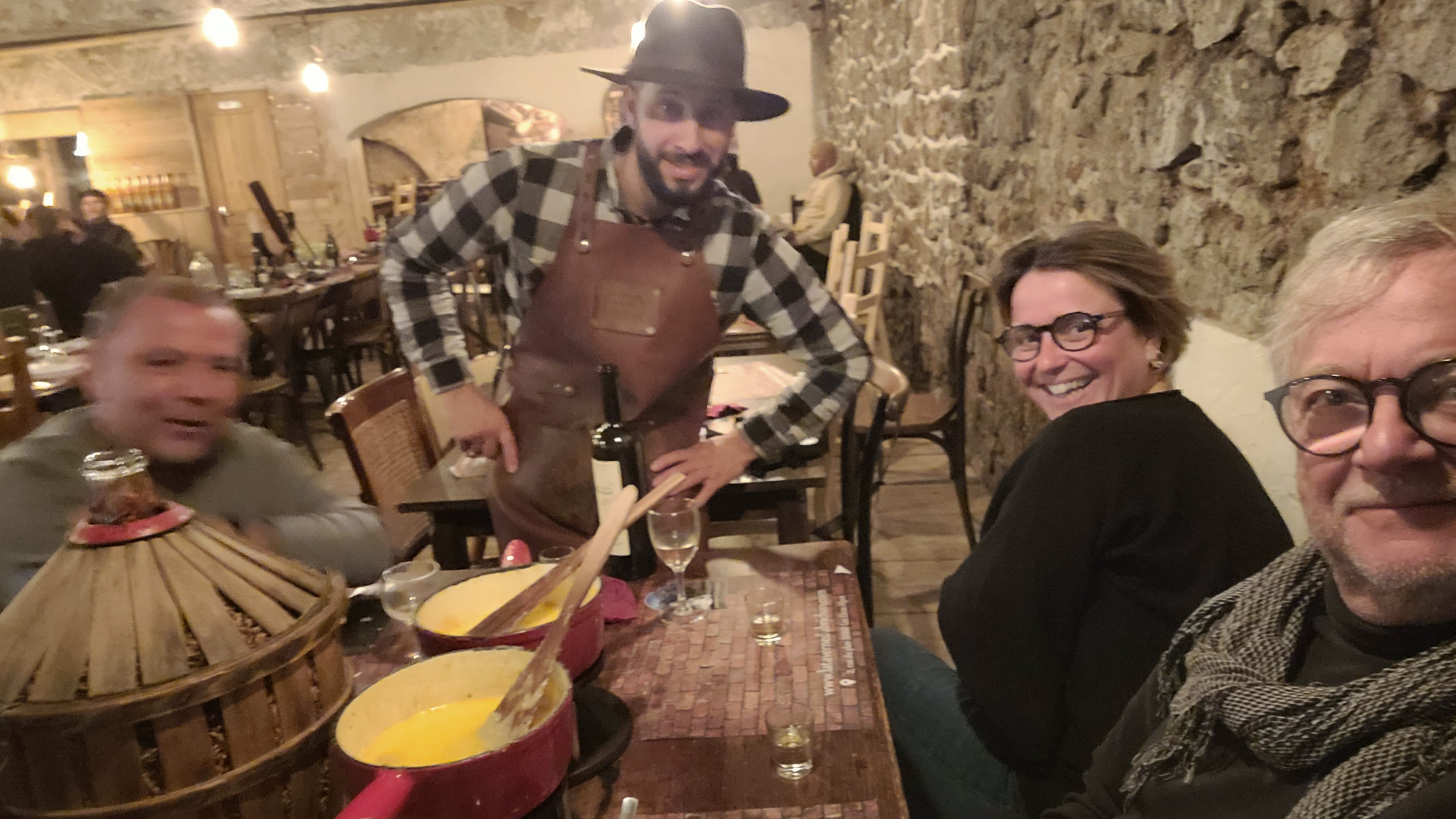Le point culminant de manger au restaurant pendant notre séjour. Raclette et fondue authentiques ; personnel incroyable; et un endroit incroyable à regarder et à découvrir (fromages et cave à vin où vous choisissez votre propre vin et bière !).