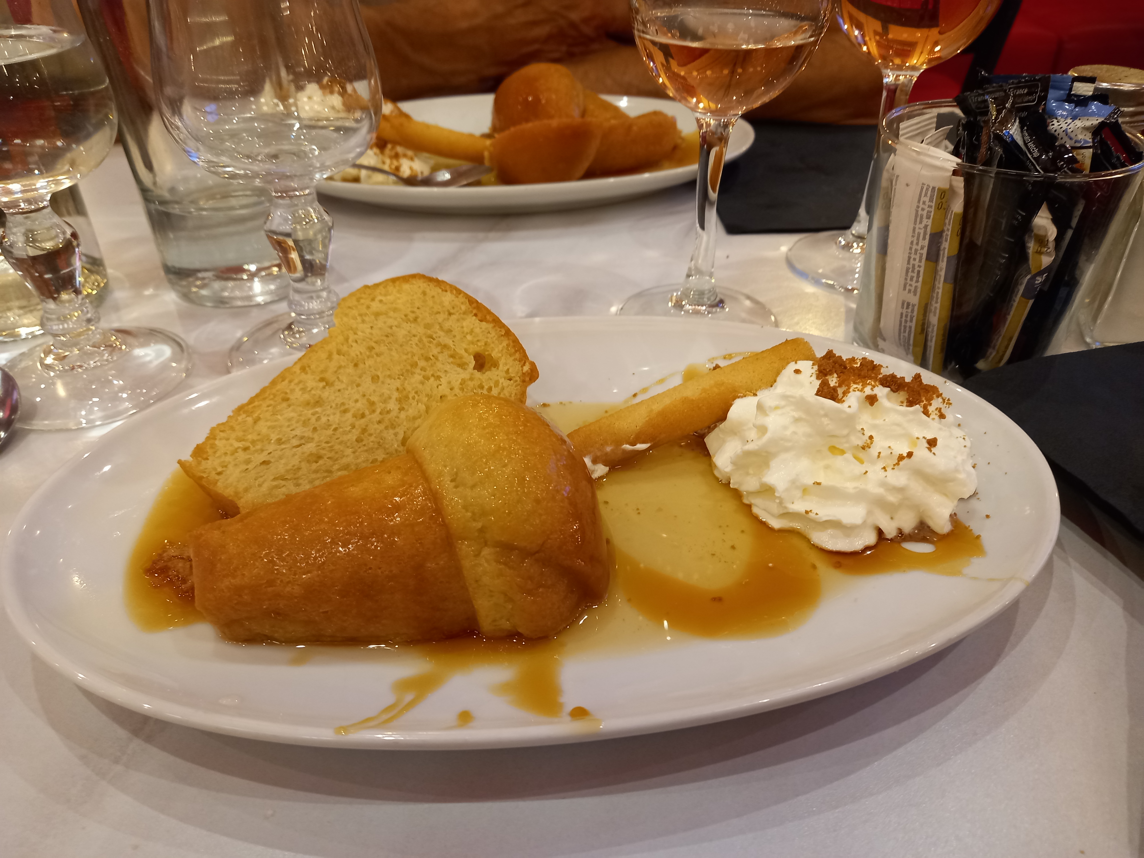 Arrivée à St Jean en train après 14h00. Nous avions prévu de déjeuner à La café de Levant, mais ils avaient arrêté de servir. Donc je suppose juste à côté à La Taverne du midi. Tous les serveurs volaient autour pour nettoyer les lieux du déjeuner. Il m’a fallu du temps avant de finalement commander. Gambas crémeuses poêlées avec sauce au safran, frites et salade. Ça avait l’air magnifique. Il est arrivé, 6 petites gambas 5 moitiés en coquille avec tractus intestinal complet et une sans coquille ni tractus intestinal…..frites et salade très sympa. Sauce au safran méconnaissable. J'ai dû demander ce que c'était, non assaisonné et absolument dégoûtant, je ne suis pas sûr de ce qui s'est passé là-bas. 18 €, assez cher pour le midi.