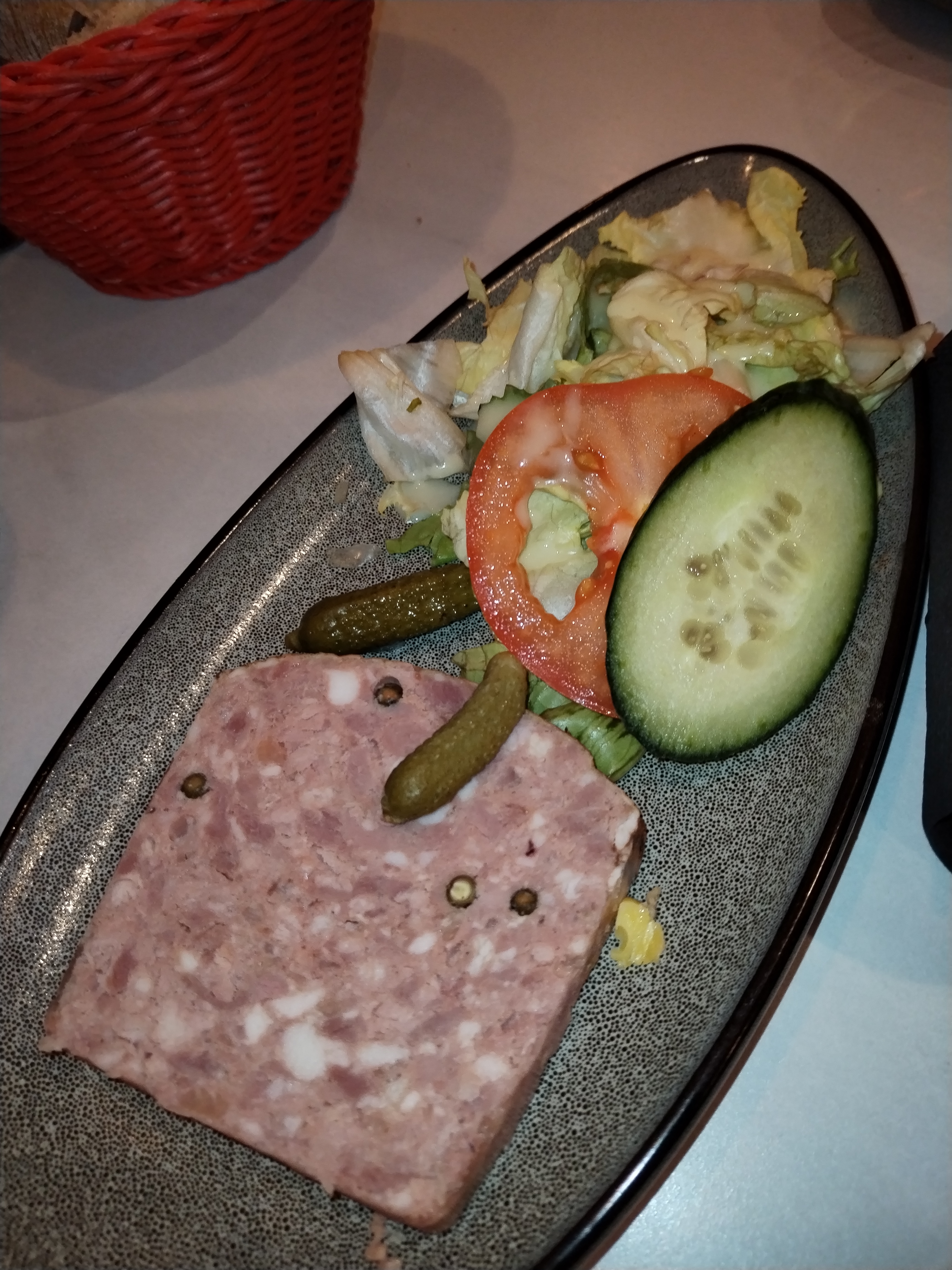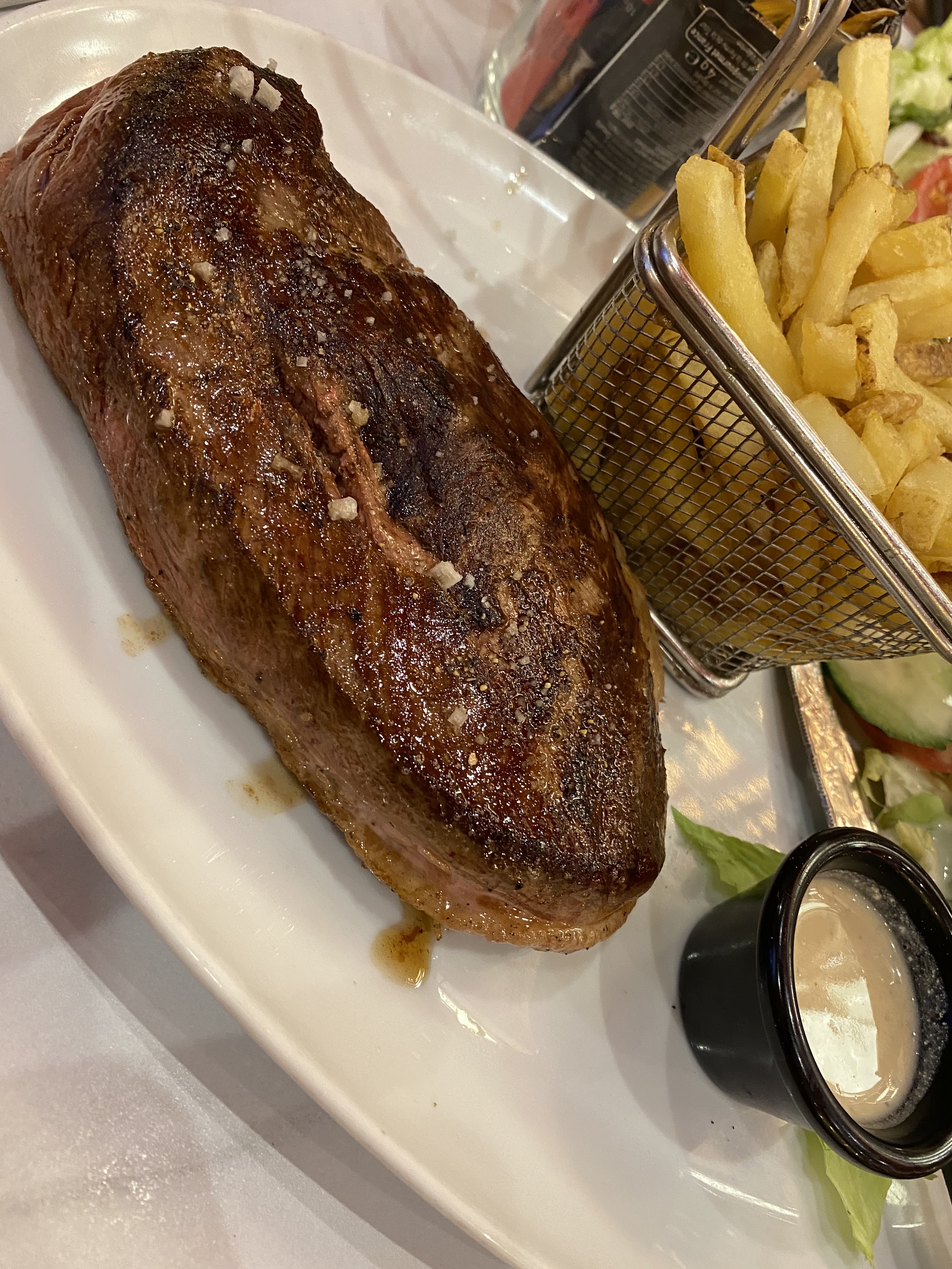 En fait, la nourriture n'était pas mauvaise. La viande était fraîche, les frites étaient savoureuses, mais les feuilles de salade semblaient avoir déjà été dans l'autre assiette. Le dessert basque était vraiment délicieux et le café était absolument bon. Cependant, le vin n'a pas été commandé, j'ai suspendu ils l'ont mélangé à l'eau. Et le service a été vraiment déçu, le serveur a serré et embrassé une autre serveuse mais n'a pas pu prendre ma commande et le style dont l'administrateur m'a parlé était vraiment inacceptable.