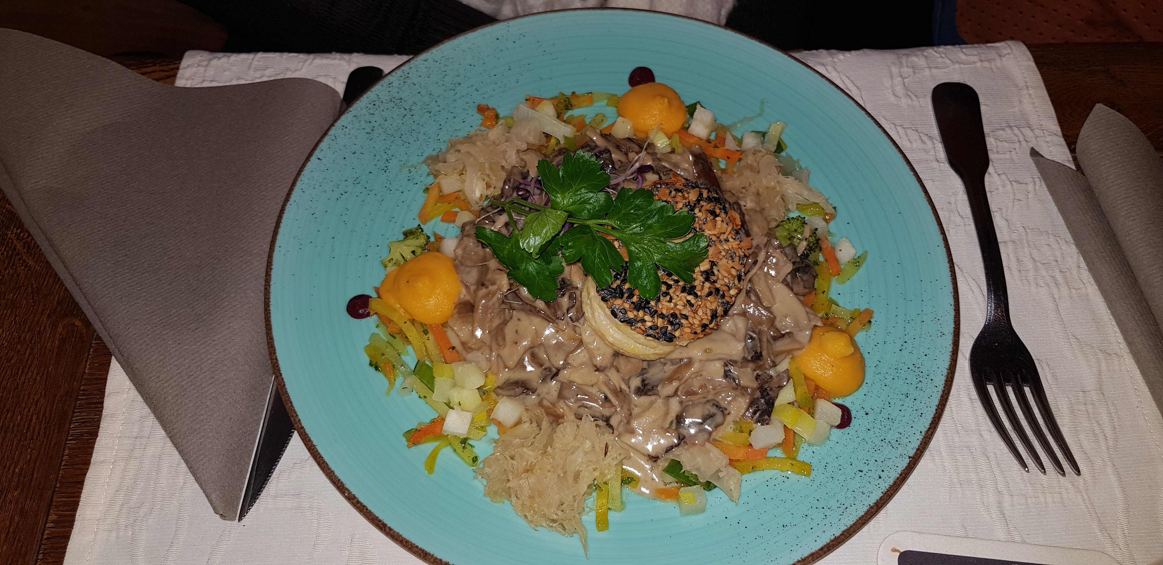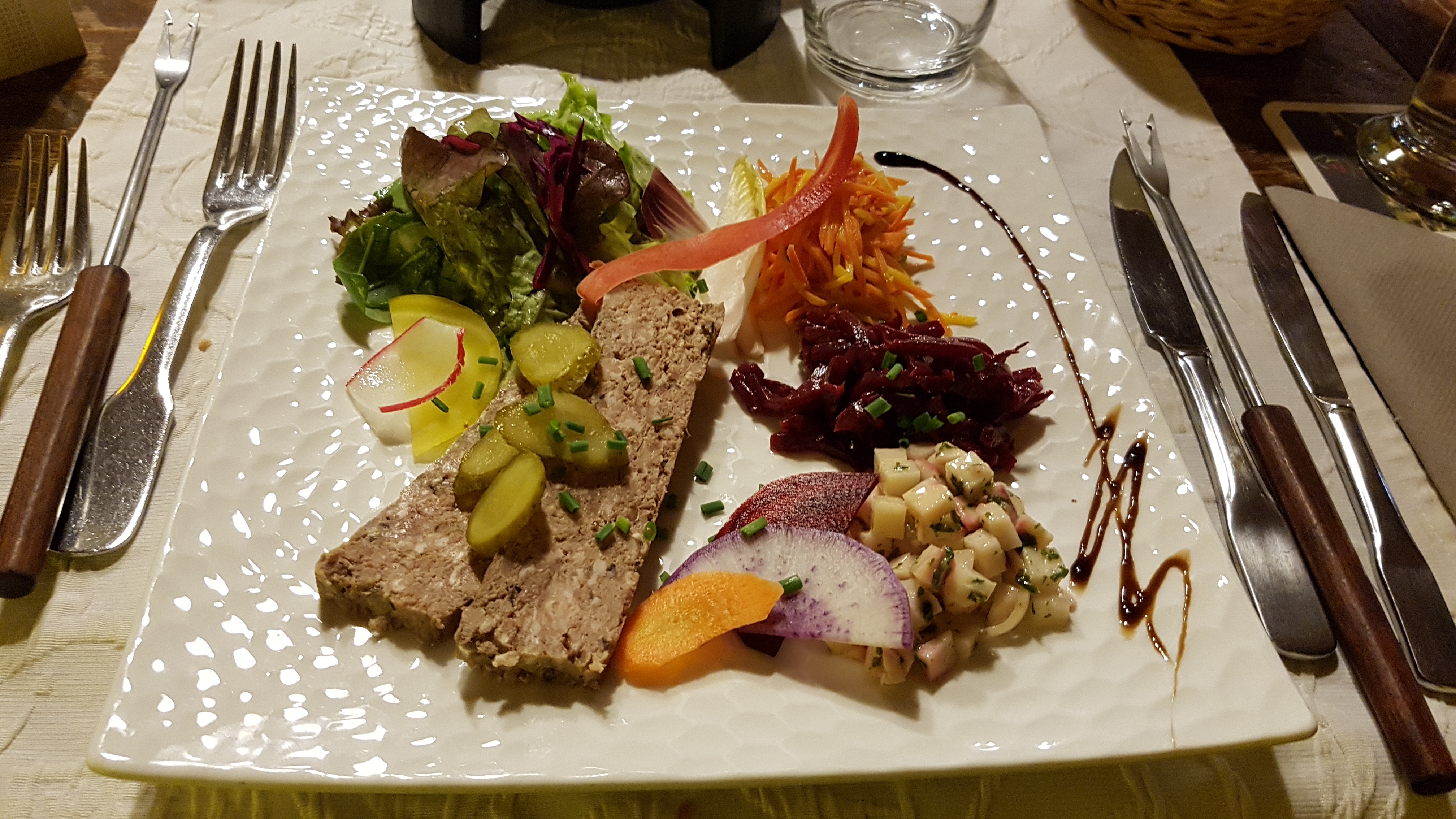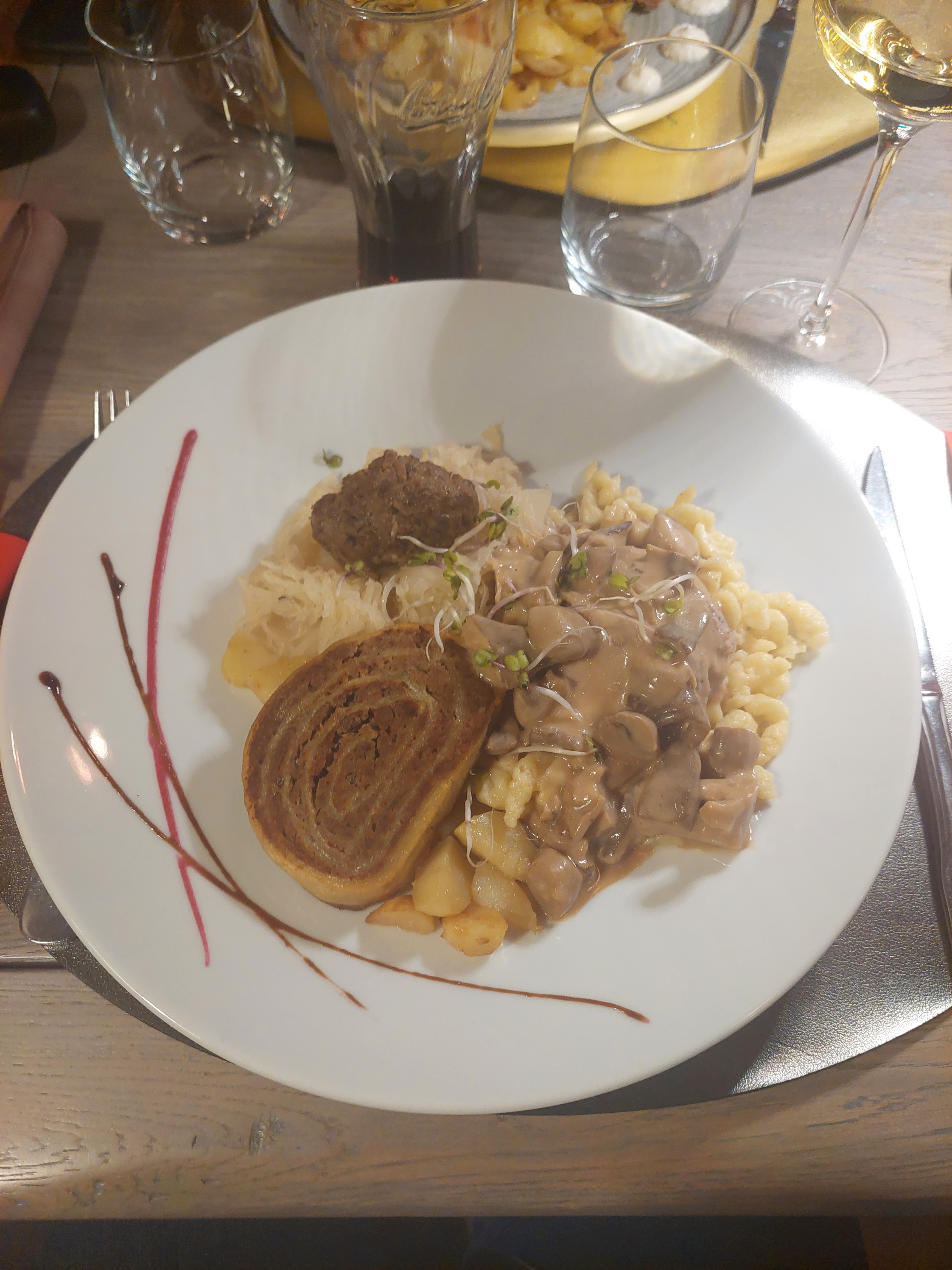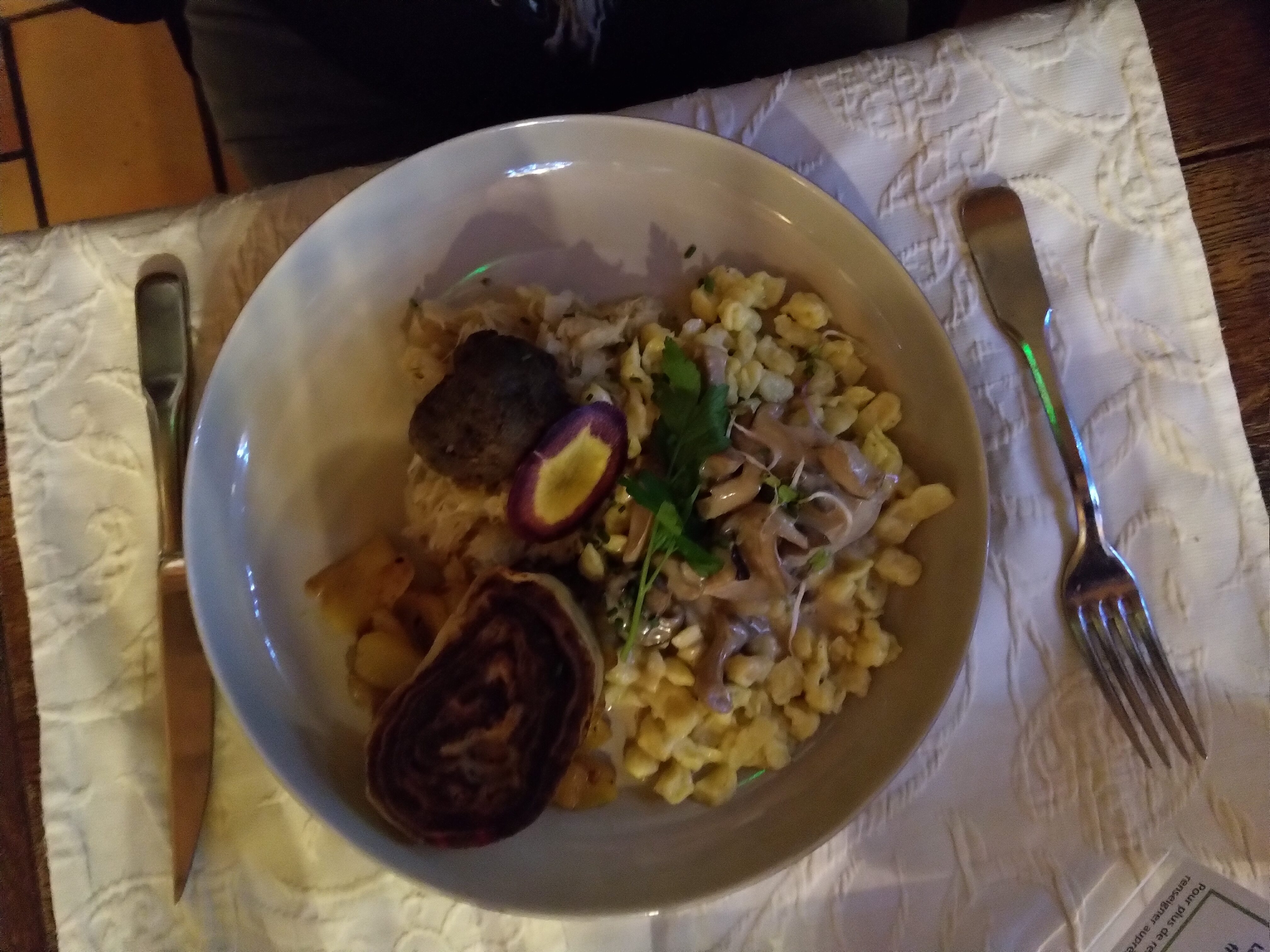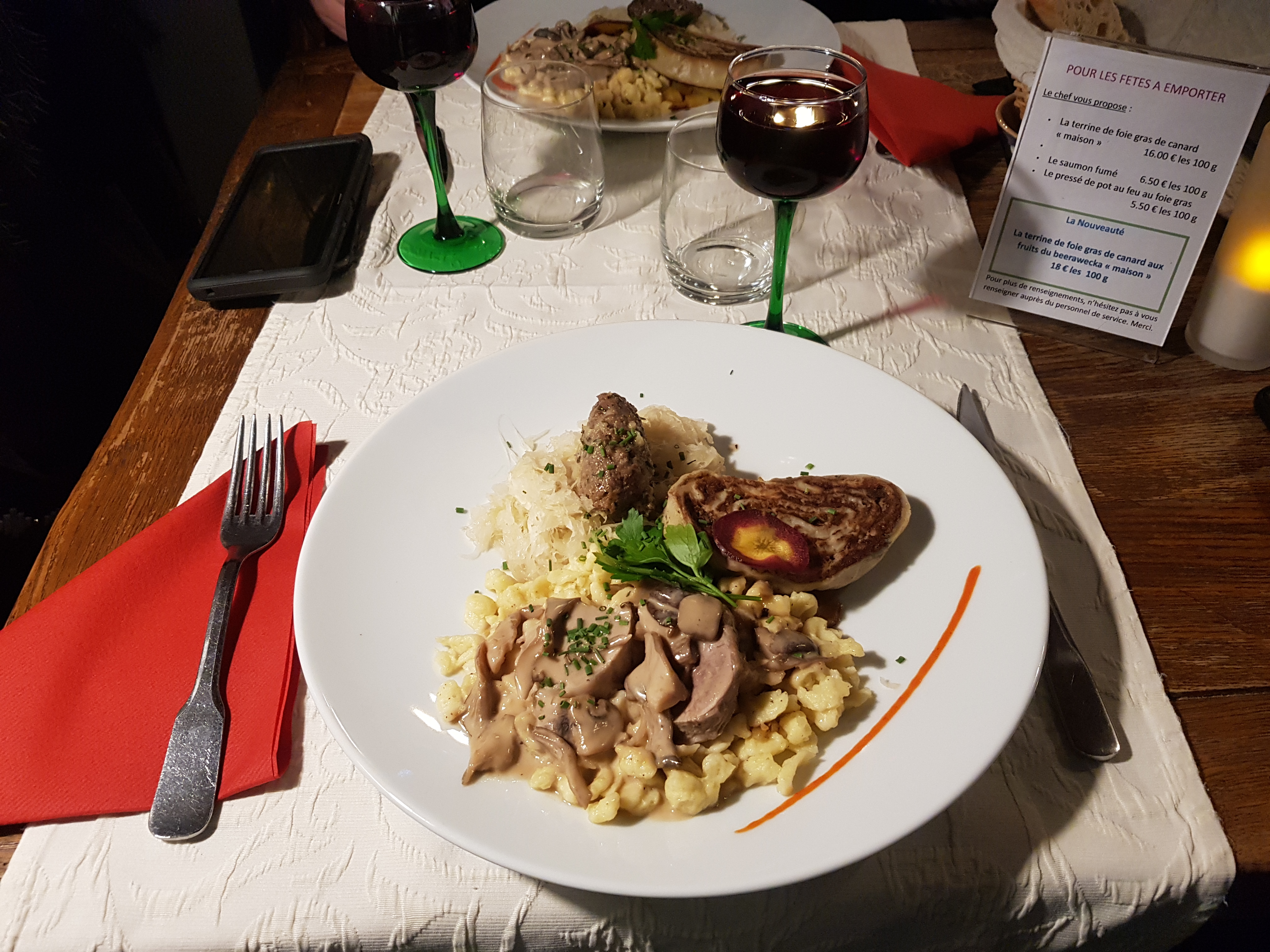 Belle découverte, repas copieux, bien présenté. Croustillant de Munster très bon et Fleischnaka à tomber. Table un peu petite, on manquait un peu de place. Mais tout le reste était parfait. A refaire.