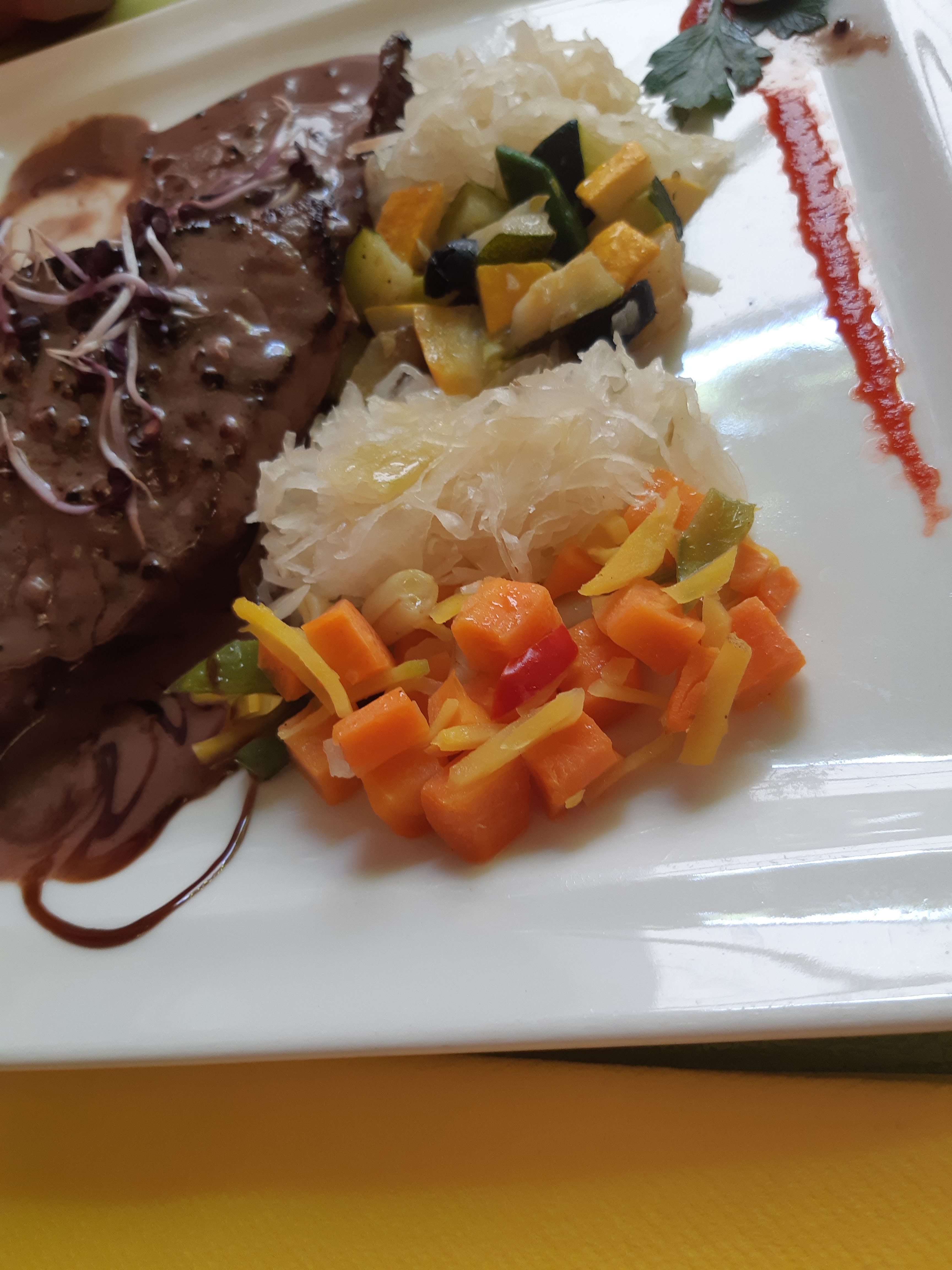 Tout d'abord, un régal pour les yeux et du palais ensuite. Une explosion de couleurs dans l'assiette du boeuf gros sel, des fleischschnaka succulents, les meilleurs que j'ai mangé jusqu'à présent. Des produits frais et de qualité. Une adresse qui vaut le détour. Bravo et merci