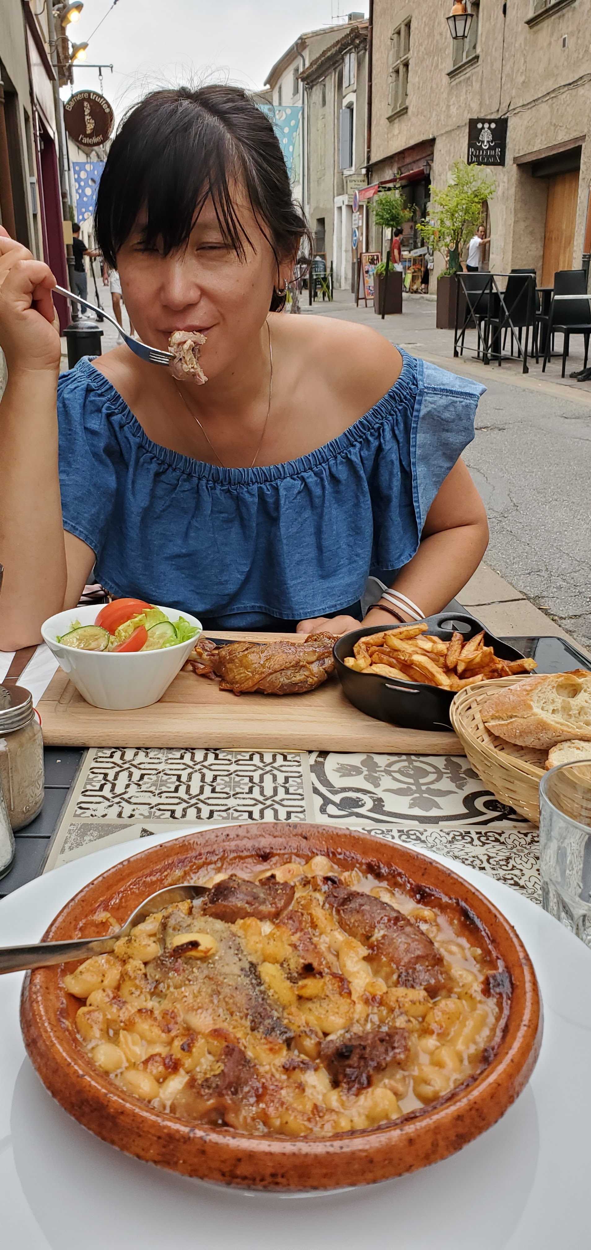 Même si nous n'avions pas de réservation et qu'ils étaient surchargés, ils nous ont laissé manger car nous leur avions dit que nous serions rapides. C'était une nourriture très intéressante comme celle que j'avais. Le cassoulet était très savoureux, j'ai vraiment adoré ! Très différent de tout ce que j'avais. Plats locaux. Le fromage était excellent mais le choix de pain était médiocre. Bonne bière et les frites du plat de ma femme sont superbes.