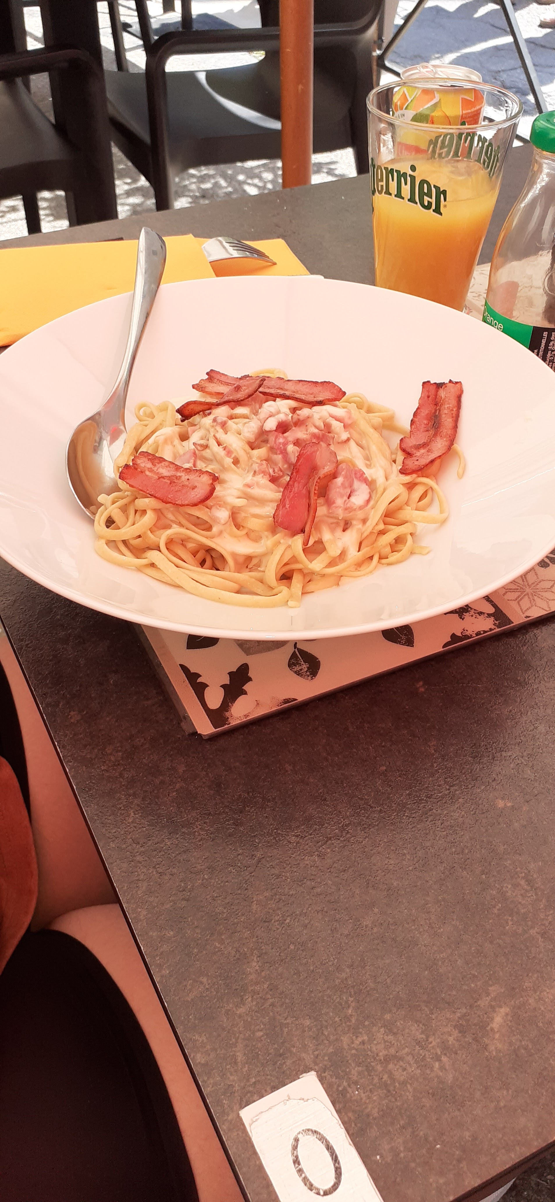 Arrêté pour dîner avant un concert. Le menu avait l'air correct. Nous avons partagé des tapas au poisson pour commencer. J'ai choisi une carbonara comme plat principal. Le menu indiquait qu'il y aurait un œuf cru (d'habitude). Ce n’est pas le cas. On m'a offert du fromage pour l'agrémenter. Du parmesan attendu et de l'Emmenthal râpé. Ma femme avait un plat de saumon trop cuit. J'ai demandé une Leffe rubis dans le menu et on m'a proposé une «belle bière blonde pression». J'ai dit Ruby Leffe s'il te plaît. Blonde ou brune était la réponse. Ruby, ai-je répondu et j'ai finalement compris. Je ne sais pas si c'était de la nourriture pour les fêtes de fin d'année, c'est-à-dire de moins bonne qualité que le reste de l'année, mais je n'y retournerais pas.