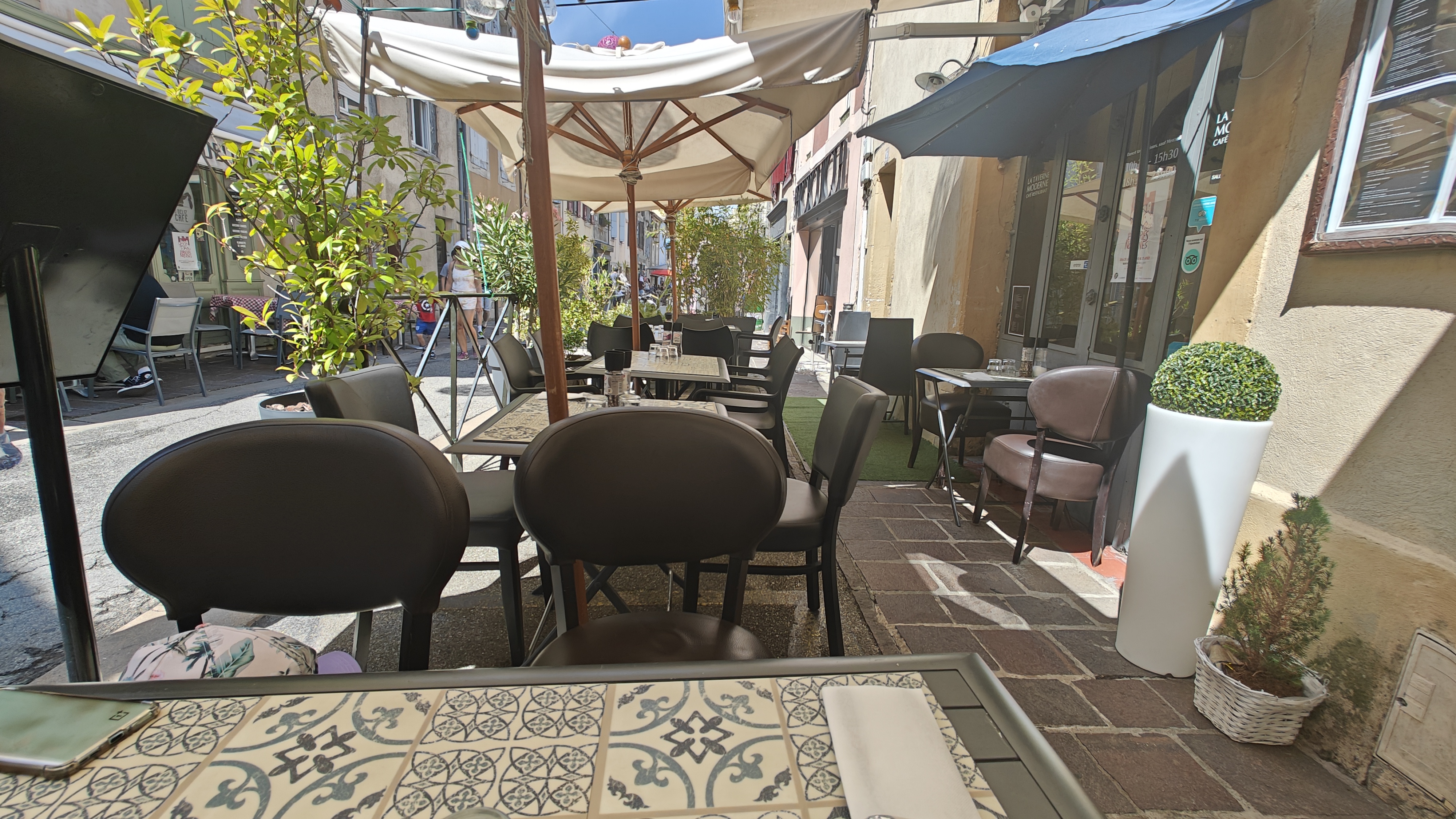 Patronne et serveuse désagréables., hautaines. Nous prenons la peine de consommer pour pouvoir utiliser les toilettes parce que c est la moindre des choses et comme une seule conso on se fait refuser l accès en pleine chaleur et fête du 14 juillet. On voulait laisser un pourboire. Le café hors de prix et a priori pas assez source de revenus pour mesdames. Le bar juste a côté nous a invité à accéder aux toilettes sans consommer en comprenant que j étais malade. Du coup ils ont eu le pourboire! Un peu d humanité ça fait du bien. Mais pas à la taverne moderne! À éviter!