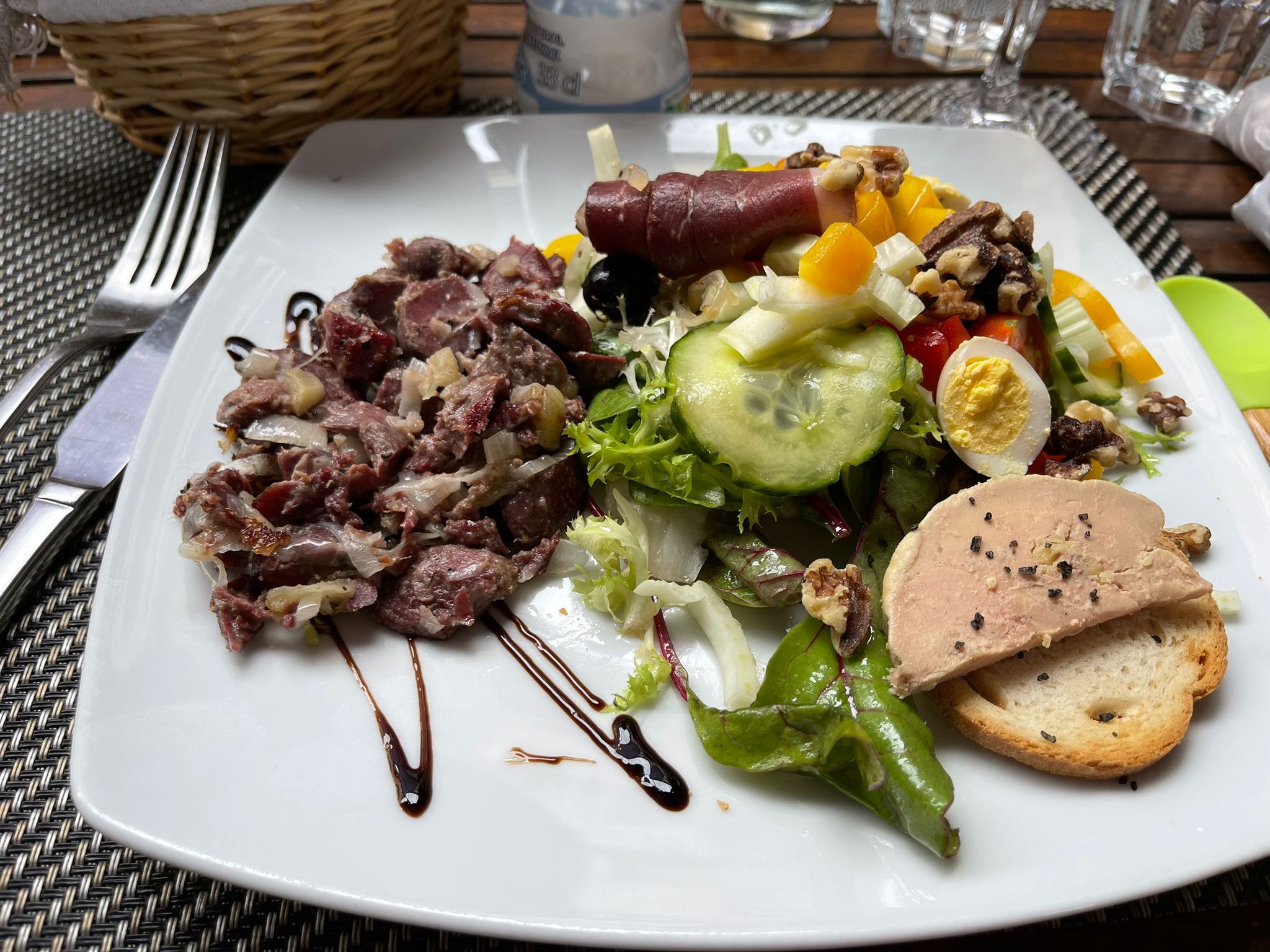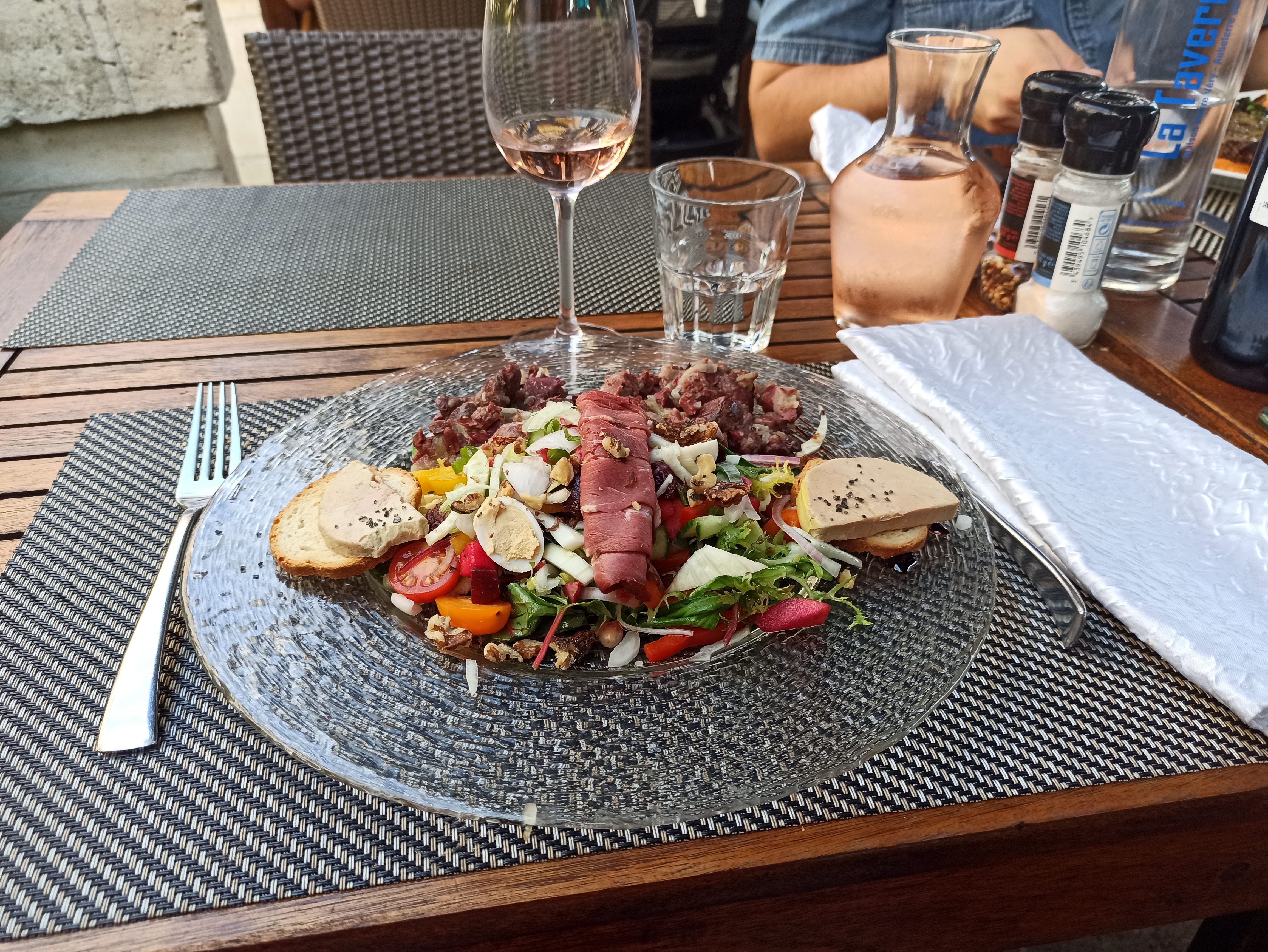 Sur la terrasse un repas très élaboré raffiné..du foie gras poêlé assiette très copieuse et pour la qualité et présentation le prix est vraiment raisonnable