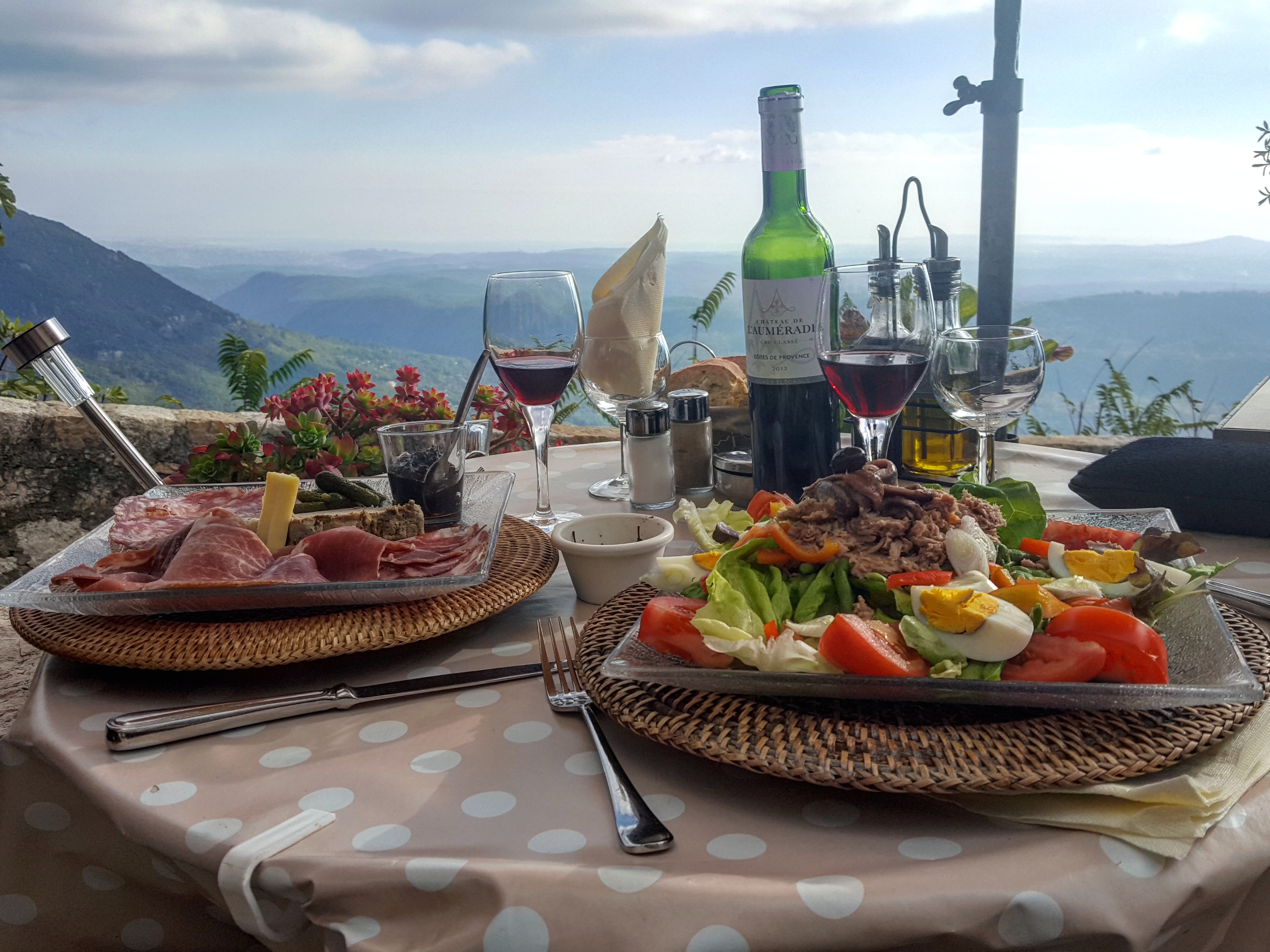 Bon prix pour une vue inestimable. Arrêt parfait pour déjeuner à Gourdon. Vues panoramiques incroyables sur la vallée, bonne nourriture et service amical. Nous n'avons eu que l'assiette de salade niçoise et de charcuterie même si la nourriture était fraîche et délicieuse.