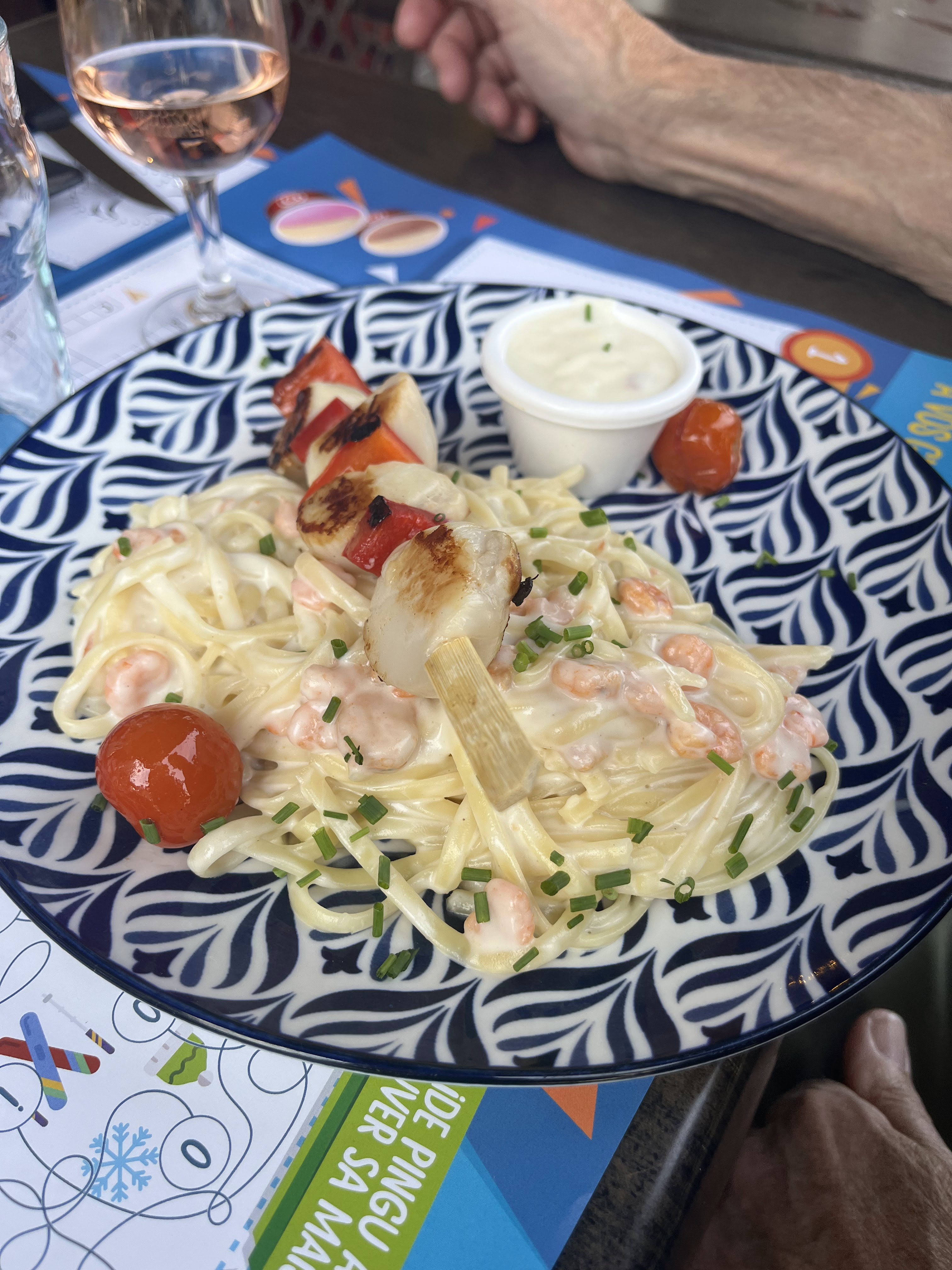 Parfait. Service et assiettes. 2 soirs de suite. Bonne cuisine aussi bien en crustacés qu'en plats (araignée, saint Jacques, sandre, soupe de poisson). L'île flottante géante et les profiteroles sont très bien aussi mais attention aux calories.