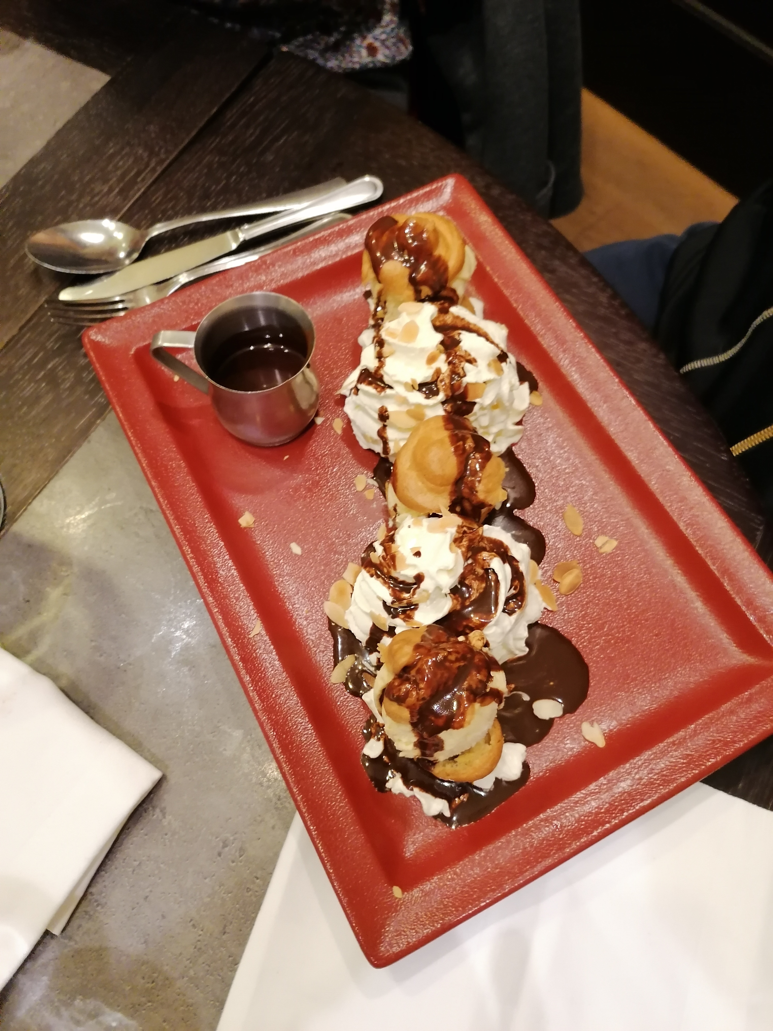 Nous avons pris des moules frites (chorizo, crème, à la bretonne) et un burger campagnard. Nos deux ados et nous-mêmes nous sommes tous régalés. Les moules étaient parfaites en cuisson, en sauce... en tout ! Le burger était parfait également (pour une fois, notre ado n'a pas ronchonné sur la cuisson : il voulait du saignant, il a eu du saignant - et non du trop cuit comme souvent). Nous avons enchainé sur un dessert. Le kouing amann (commandé en même temps que les plats car il faut 20 minutes de préparation ; c'est écrit sur la carte dehors, mais le serveur a eu la gentillesse de nous le préciser - du coup, zéro attente pour le dessert ^^) était excellent d'après notre aîné (on le croit sur parole : on n'a même pas pu lui en prendre une bouchée ;) ) et très digeste. Quant aux profiteroles, les portions étaient généreuses, mais notre ado de 13 ans a tout fini (sachant qu'il avait déjà mangé toutes ses moules et ses frites, et que non, on n'affame pas nos enfants avant d'aller au restaurant XD): c'est que c'était TRÈS bon :D. Le service était parfait, attentif et très réactif. À noter que nous sommes arrivés à l'ouverture et un jour de la semaine (dans d'autres conditions, il aurait peut-être fallu réserver...). Petit bonus : la vieille ville est à 20 minutes à pied en y allant tranquillement ET il y a plein de places gratuites pour se garer dans la rue un peu plus bas.