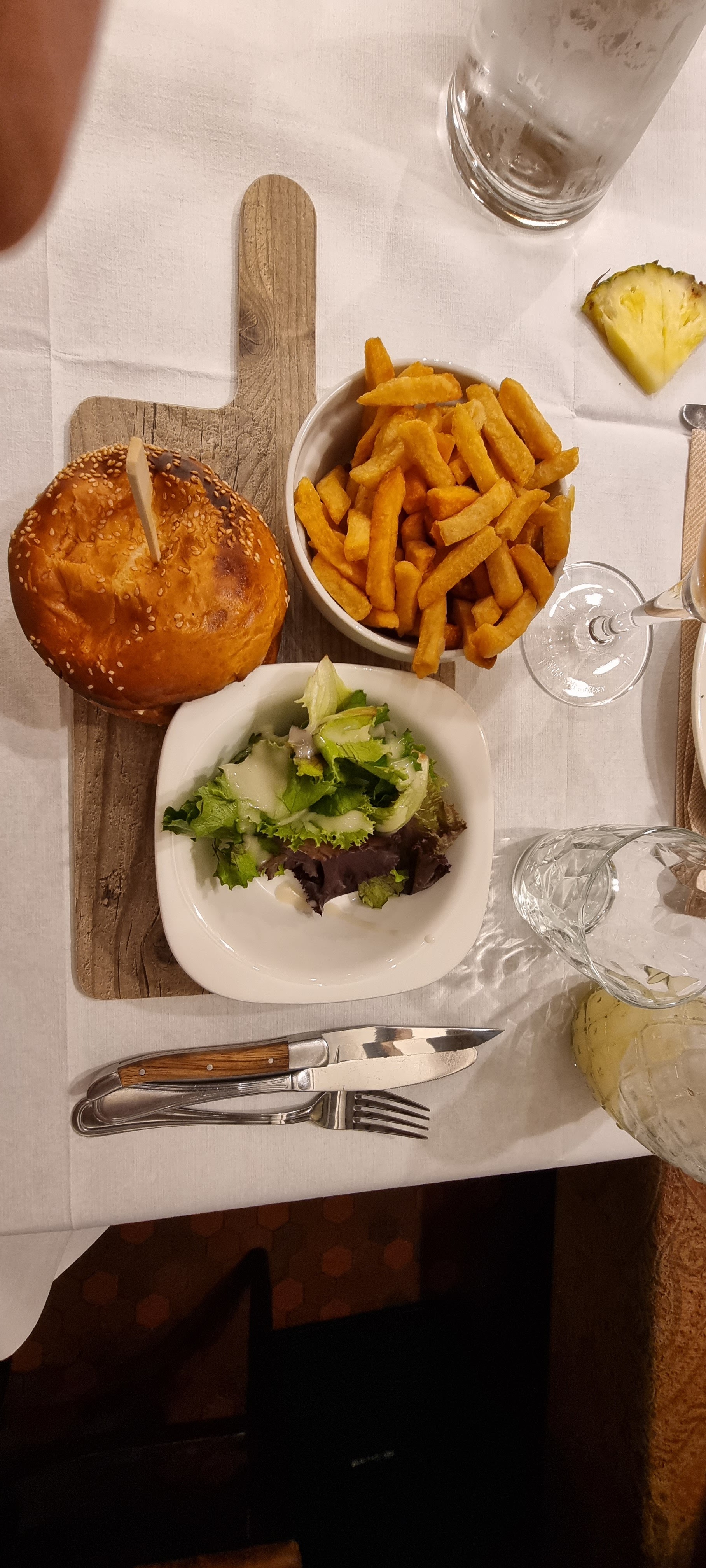 Apéritif servi en même temps que le plat. Frites à peine tièdes en arrivant.