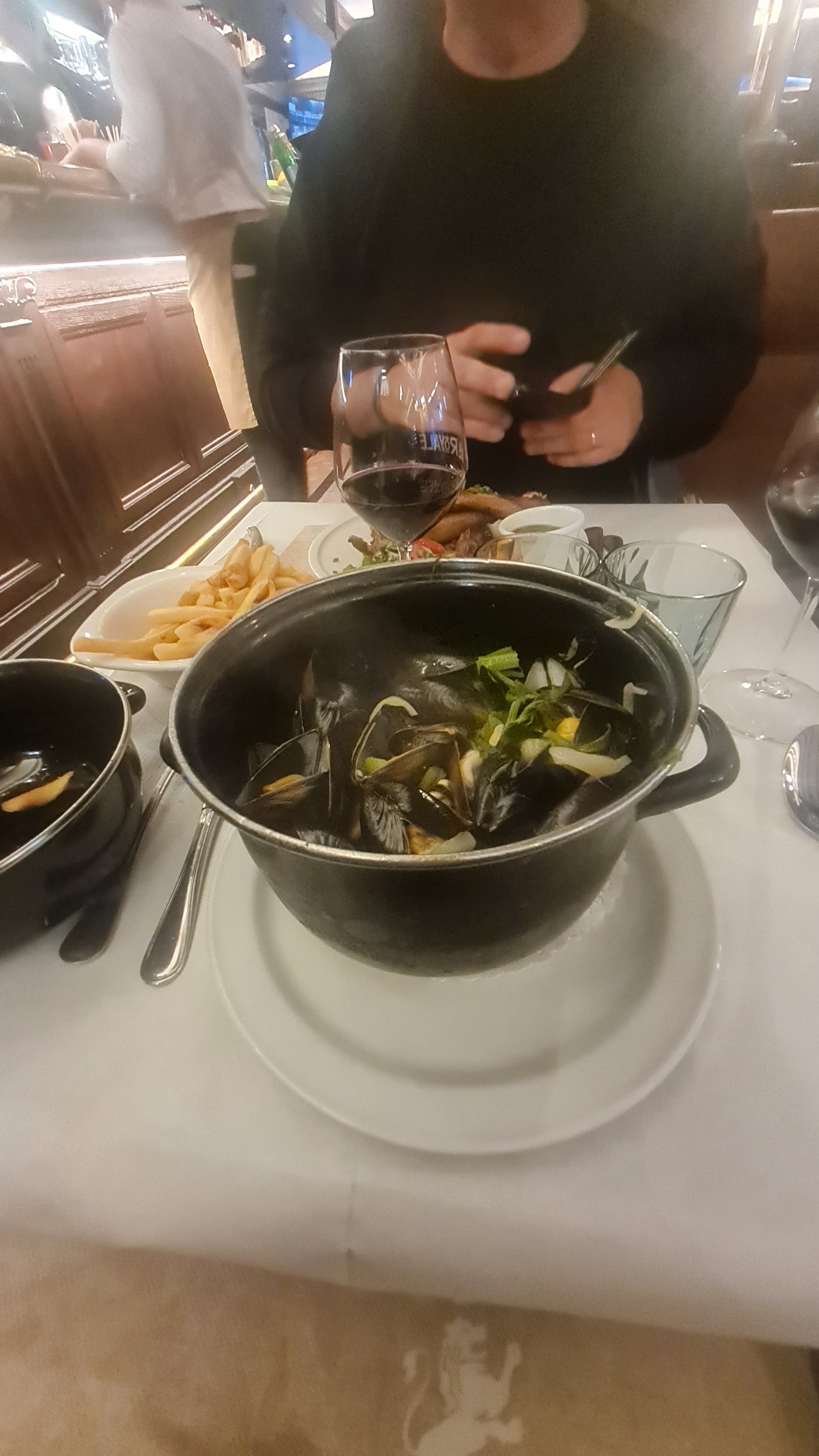 Magnifique cadre pour simplement boire un verre / un café ou déguster un plat de la carte ! Dans notre cas , nous étions 4 personnes, pour y manger moules et Wok. Nous recommandons ! Le service est dans les règles de l’art de la restauration. Malheureusement certaines tables sont un peu trop proches les unes des autres, on peut s’y sentir à l’étroit ou mal à l’aise si le « voisinage » n’est pas discret. Anecdote : Au fond à droite du restaurant , si vous vous asseyez sur le long siège contre le mur, attention aux sacs ..! Par manque de place, un voisin de table s’est malencontreusement assis sur le sac d’un de nos invités et a eu la désagréable surprise d’avoir un objet cassé à l’intérieur par cette maladresse.