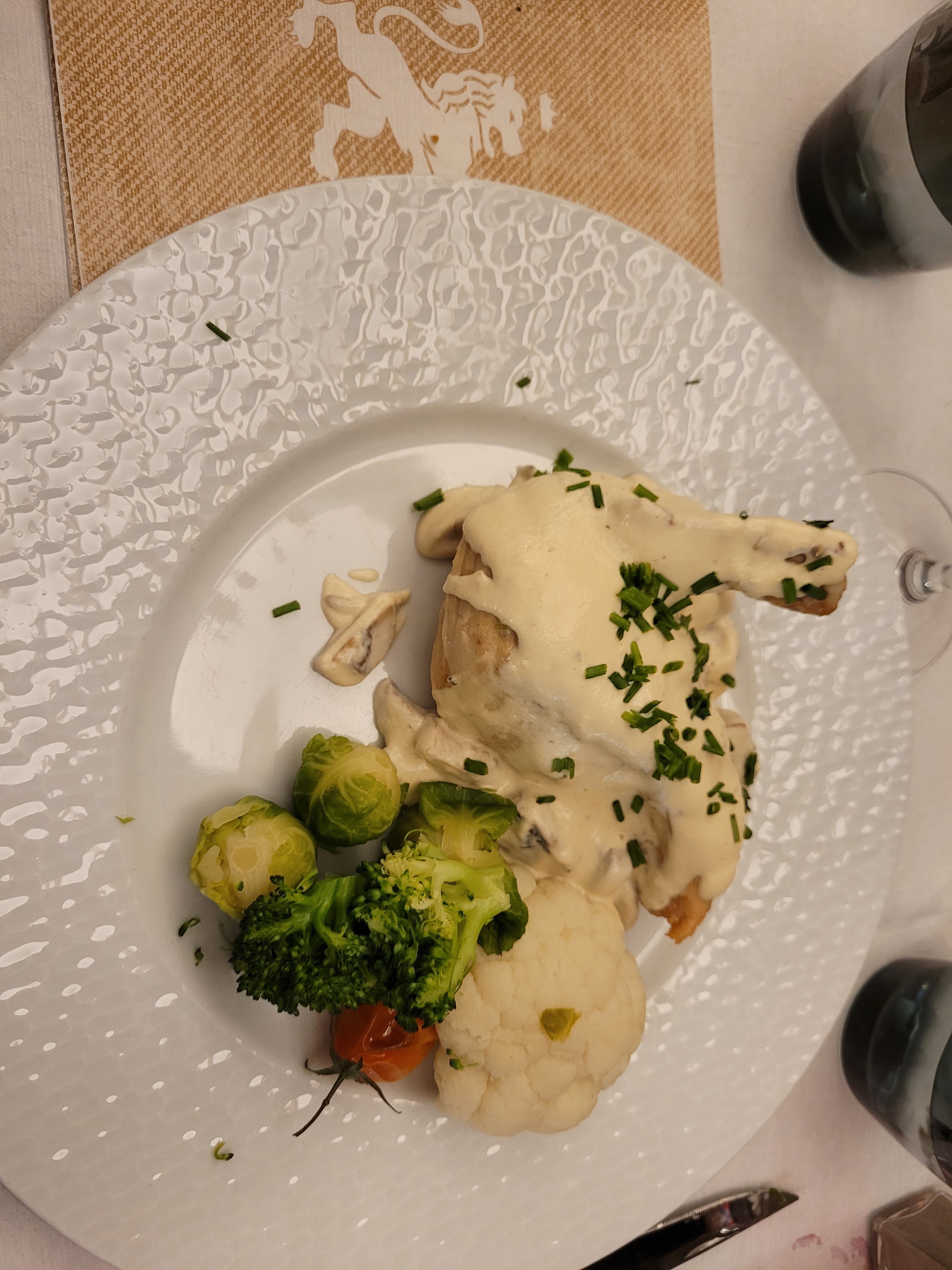 Franchement déçue.... J'ai choisi le suprême de poulet sauce normande, accompagné de purée maison et mélange de légumes..... Poulet sec, sauce quasi inexistante, aucun goût, fade, purée ni faite ni a faire, froide, fade, compacte.... Légumes un morceau de choux fleur, quelques haricots verts et une carotte tout ça cuit à l'eau sans goût mise à part la carotte je dois le reconnaître... D'ailleurs une belle carotte qu'on prend également car le rapport qualité prix n'y es pas du tout 19€ pour mon plat + supplément de 2€ pour l'accompagnement.... Je n'ai même pas mangé la moitié de mon assiette... C'était sans goût... Sans intérêt... Mon conjoint a prit une bavette a l'échalote, heureusement la viande était bonne, mais plutôt dire bavette + échalotes car sauce inexistante, bavette avec échalotes posées sur la viande... J'ai préféré ne pas tenter le dessert.. Franchement très déçue. La qualité, pour le lieu n'était pas au rdv... Le service pas terrible non plus. Je ne sais pas pour qui on nous a prit mais on ne renouvellera pas l'expérience c'est sur... On a voulu essayer.. Mais vos voisins sont de qualité supérieure... Taverne Royale qui n'a de royal que le nom... A moins que vos pratiques ne soient pas les mêmes avec tous les clients....