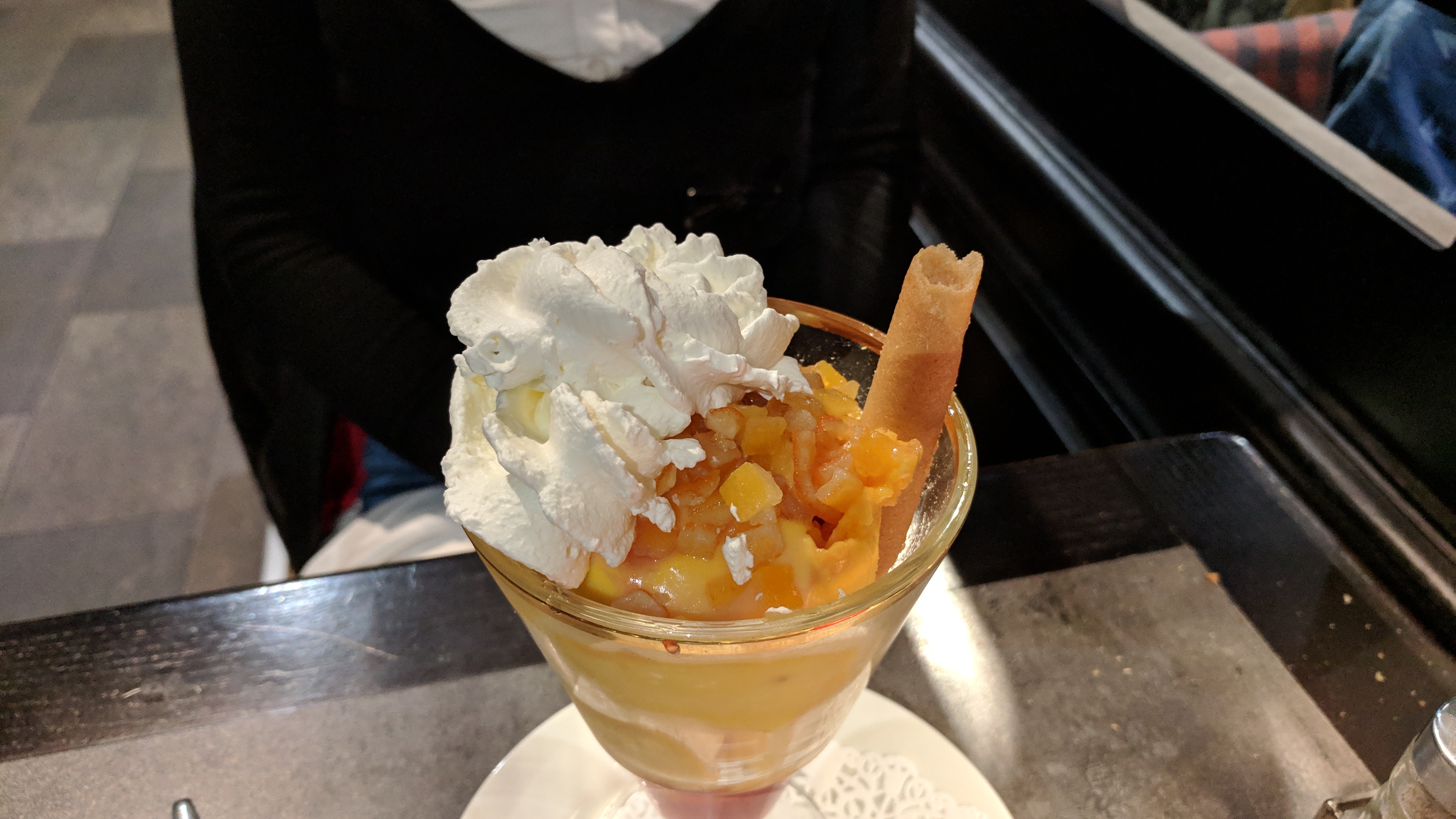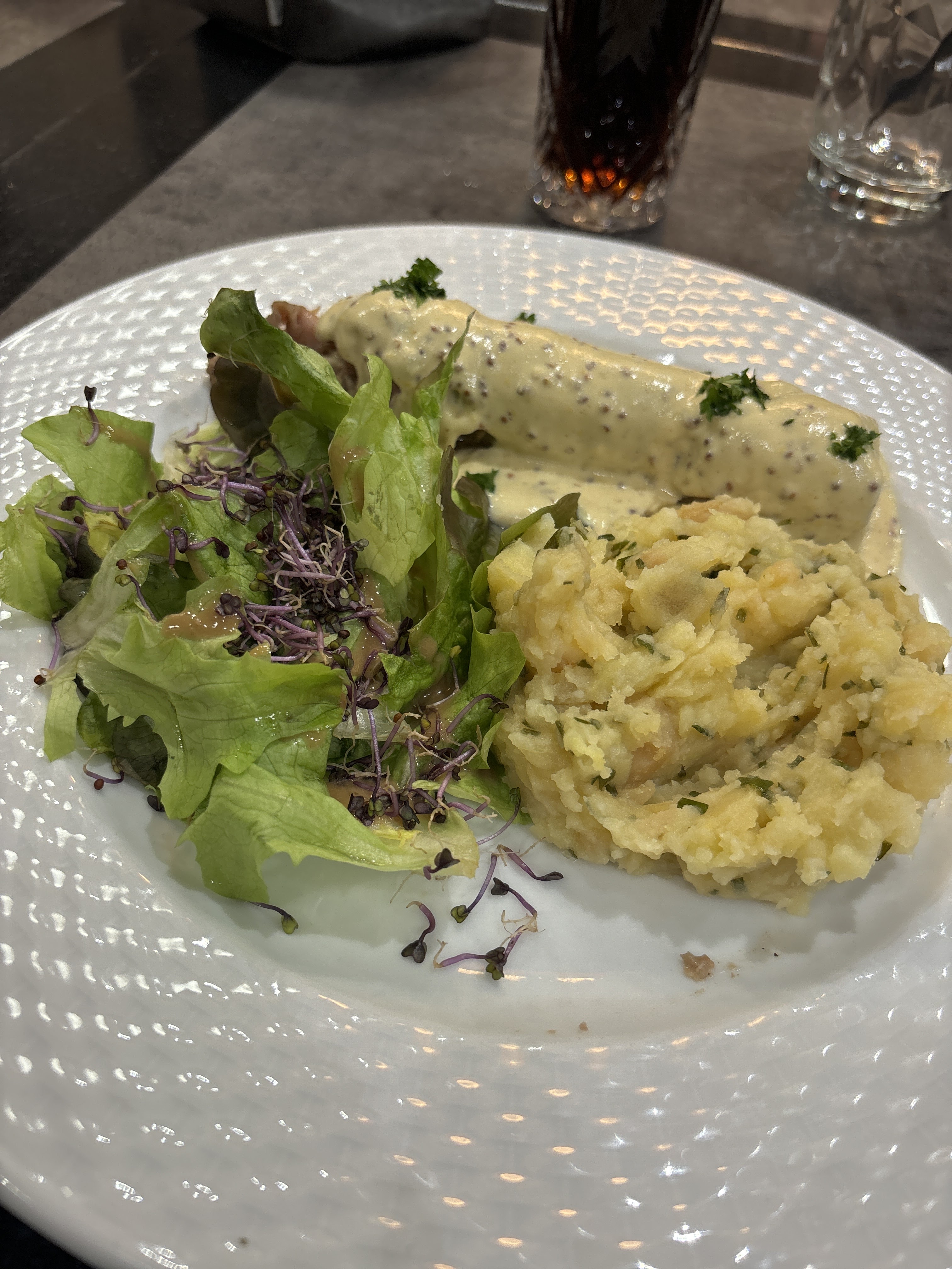 Flammekuech en entrée, hamburger copieux en plat. J'étais rassasiée! C'était vraiment bon. J'ai gouté dans le plat d'une personne à la choucroute et moi qui n'aime pas ça en général je crois que la prochaine fois c'est ce que je vais prendre! Merci à ce restaurant de m'avoir fait aimé ma choucroute. De plus le serveur qu'on a eu était très sympathique, avec une pointe d'humour. On adore !
